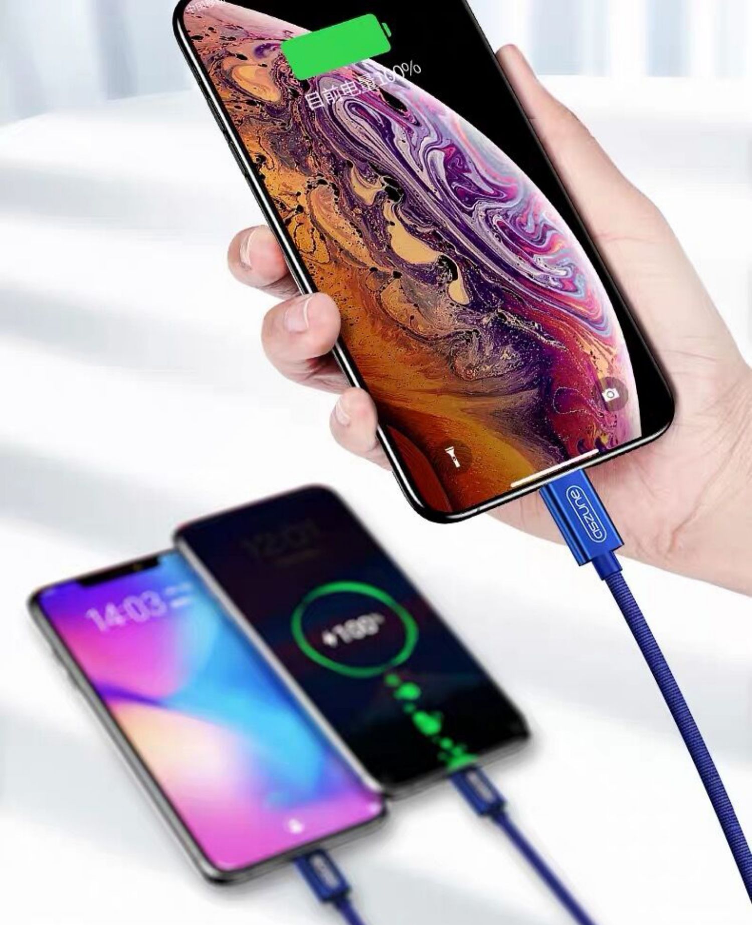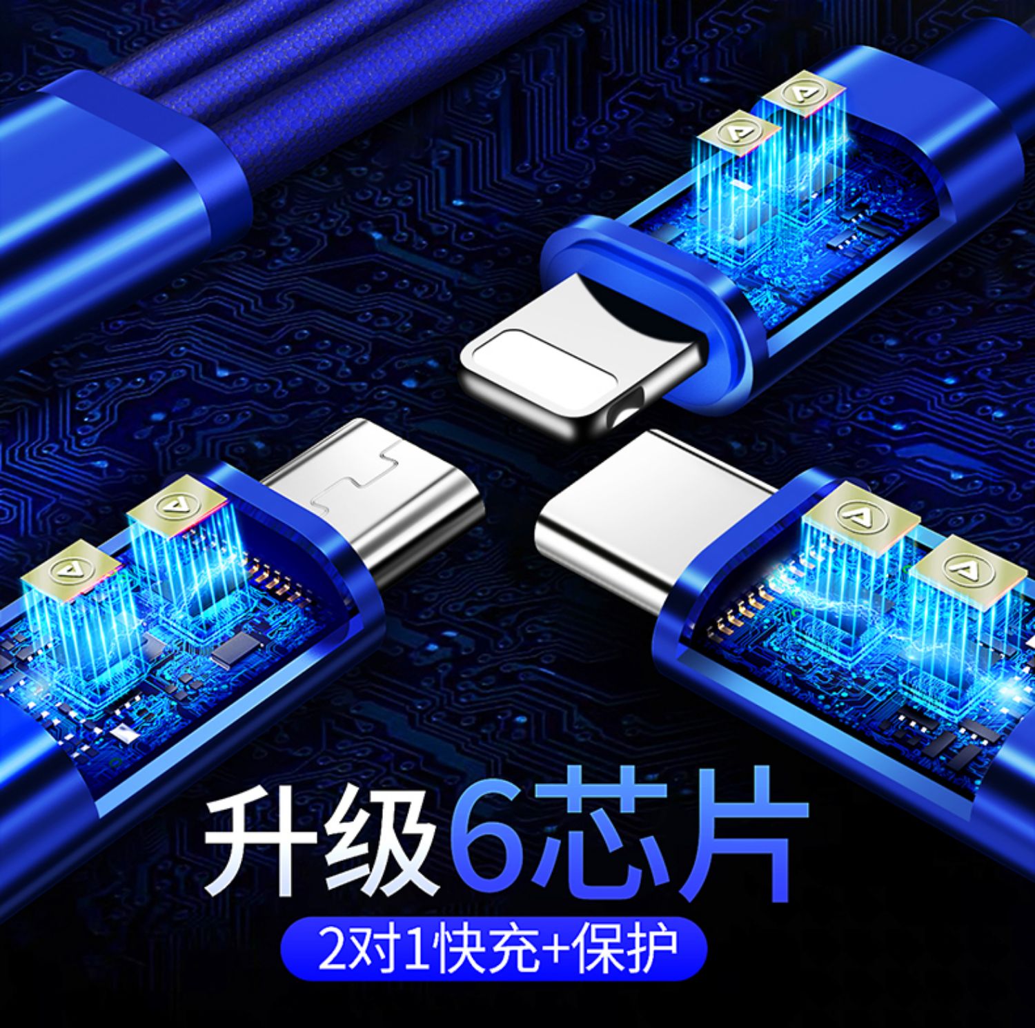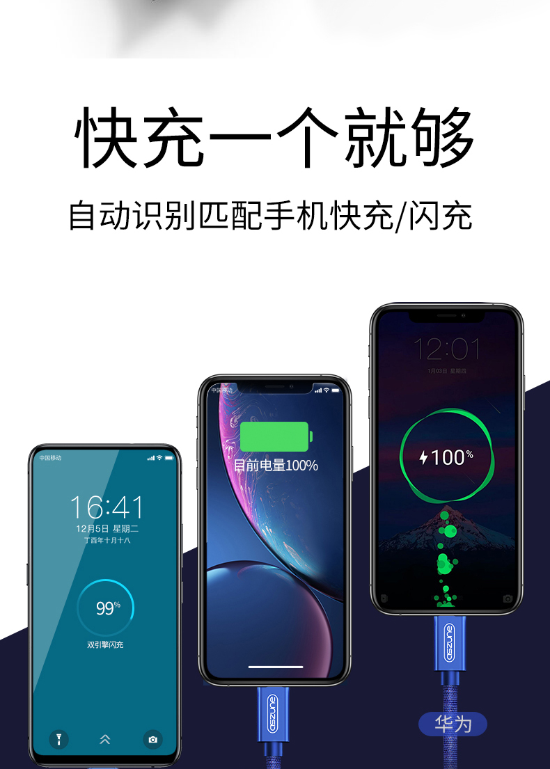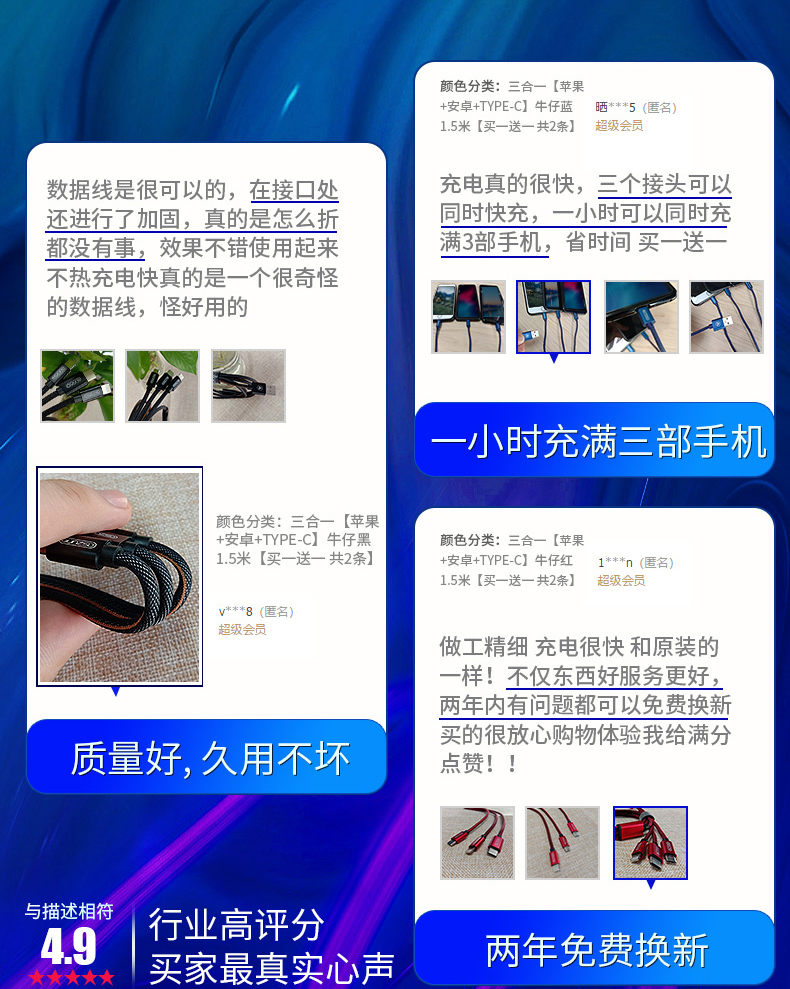 一拖三数据线,安卓苹果type,安全便捷善于充电,亮丽如新不氧化,升级大改造不伤机,涓流充电不过充,超柔软线身不折断,快充设计,三个设备一线搞定!