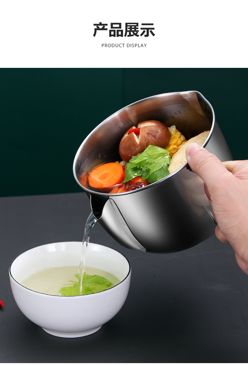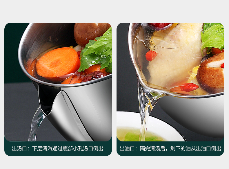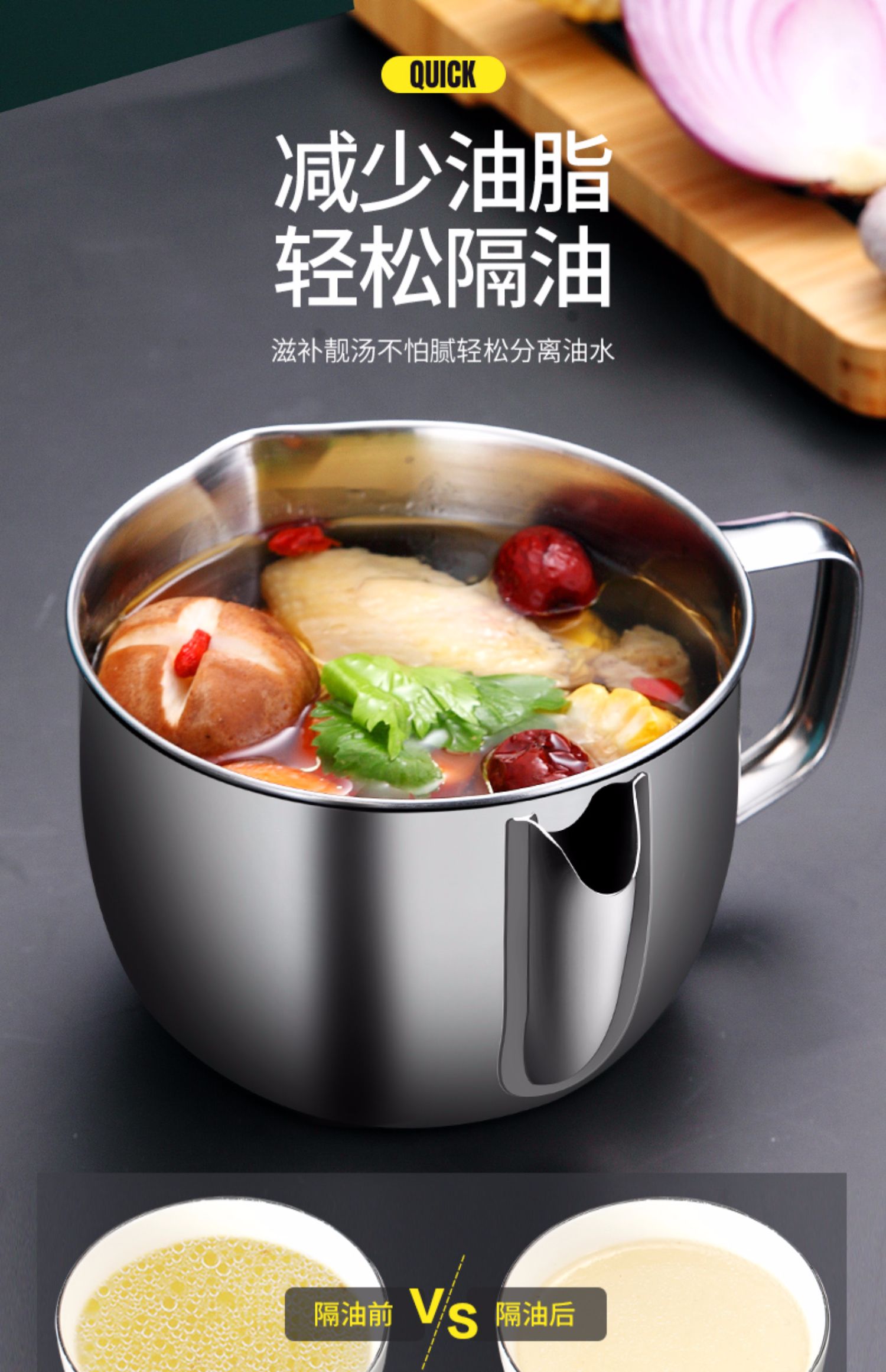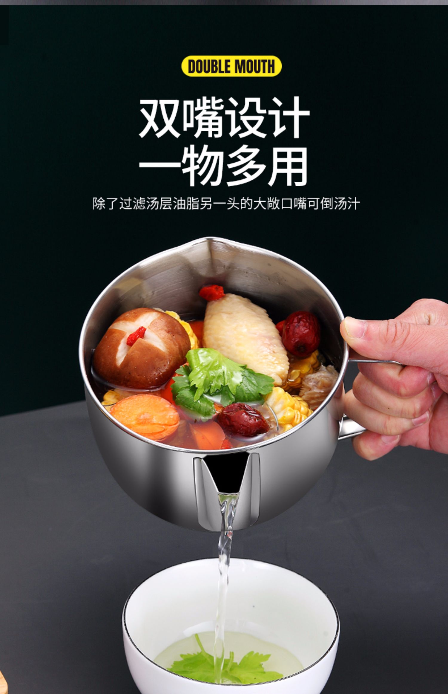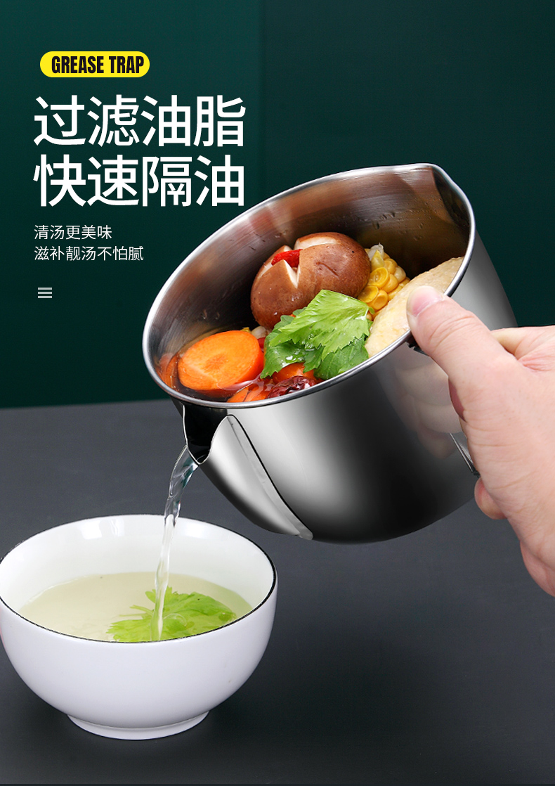 厨房必备神器!可以有效减少油脂,轻松隔油。除了过滤汤层油脂另一头的大敞口可以用来到汤汁。直接放在微波炉上面加热就可食用!采用304不锈钢,隔热手柄设计,不易生锈,坚固耐用。