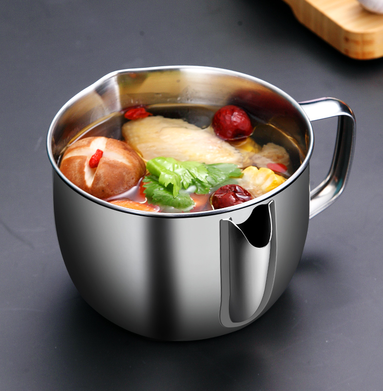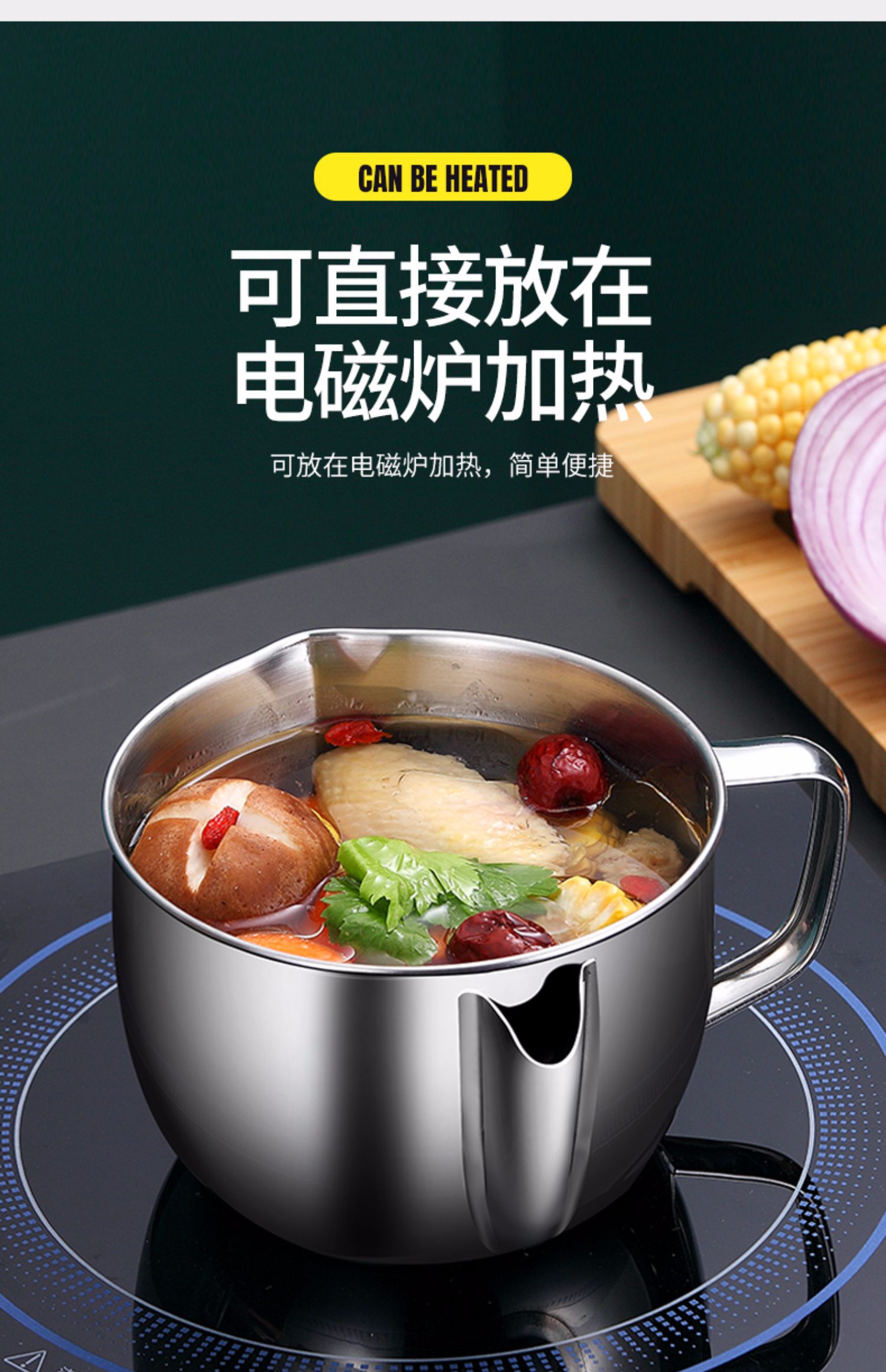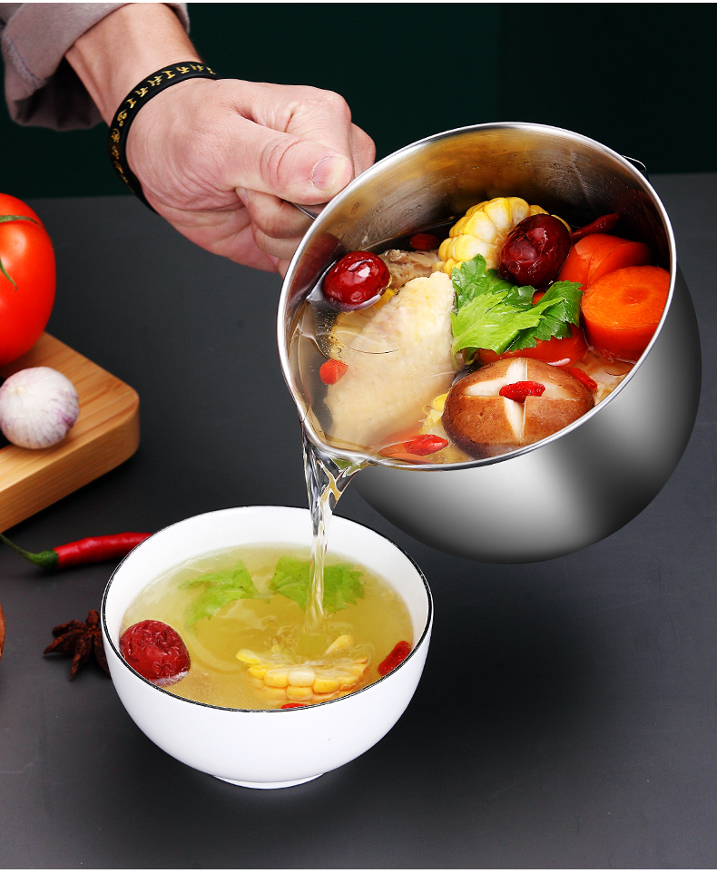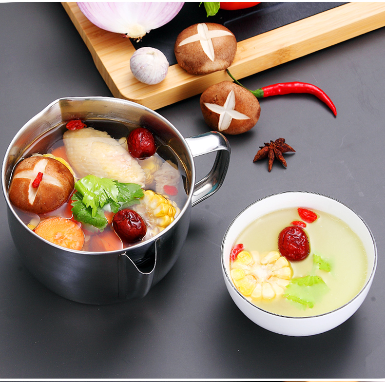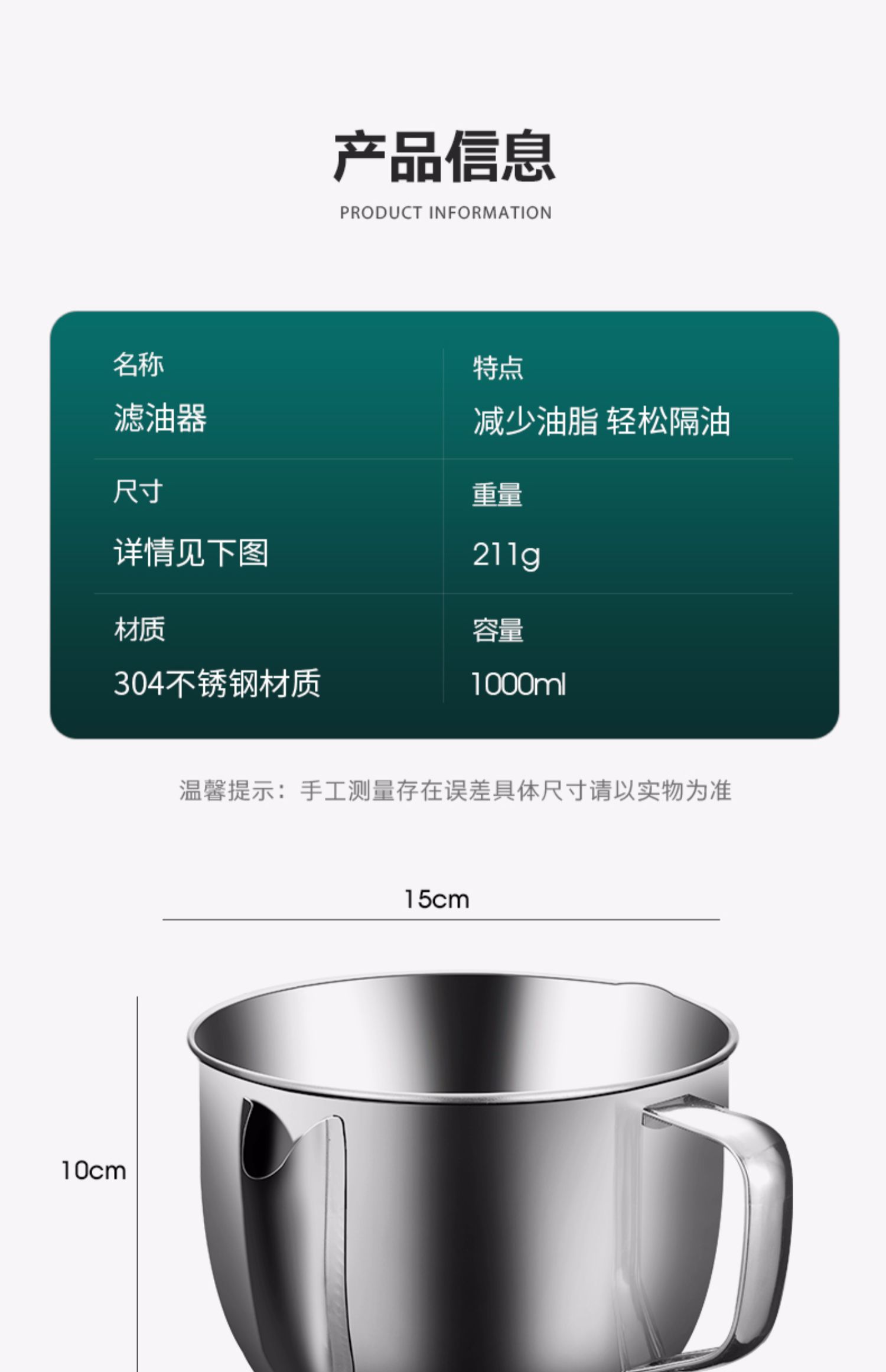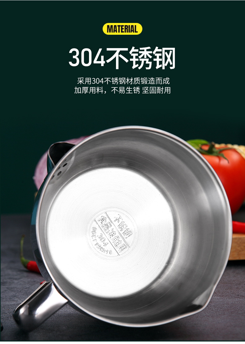 厨房必备神器!可以有效减少油脂,轻松隔油。除了过滤汤层油脂另一头的大敞口可以用来到汤汁。直接放在微波炉上面加热就可食用!采用304不锈钢,隔热手柄设计,不易生锈,坚固耐用。