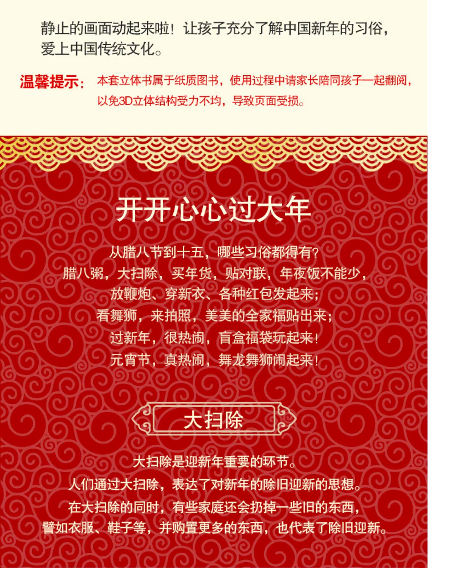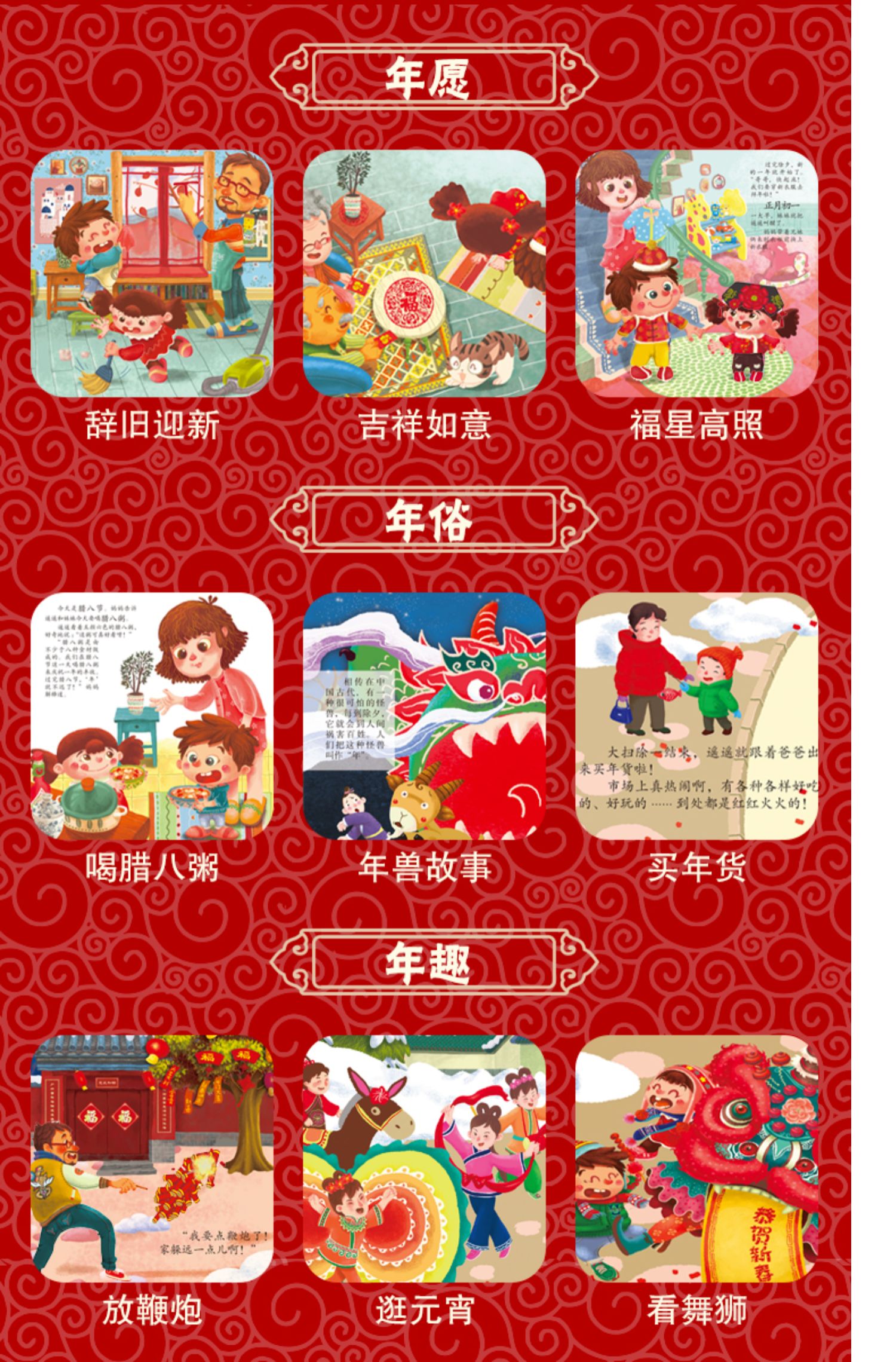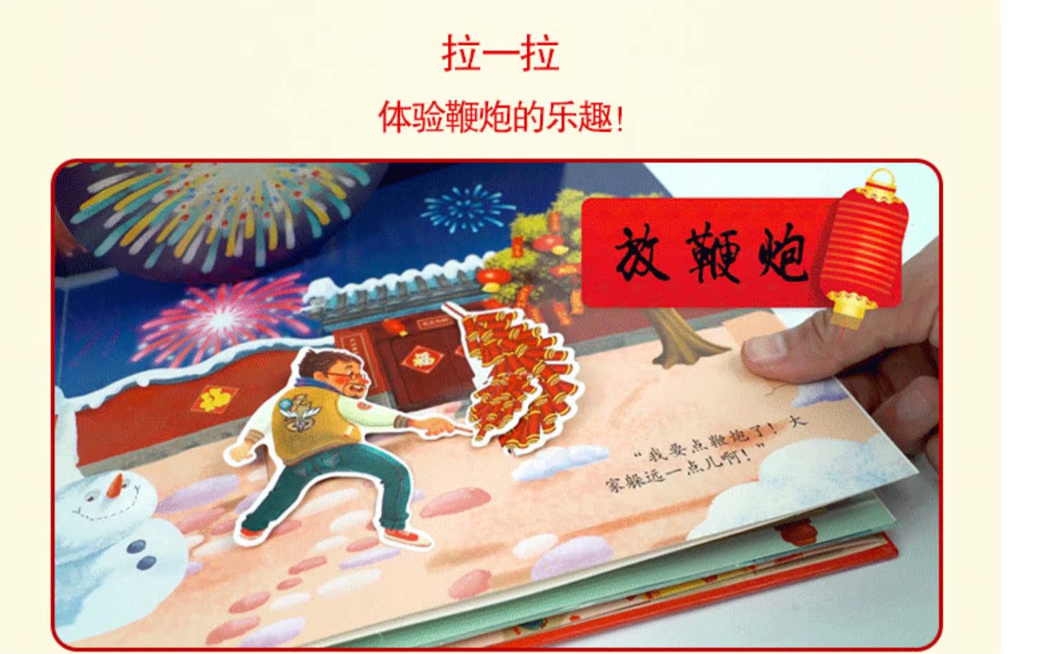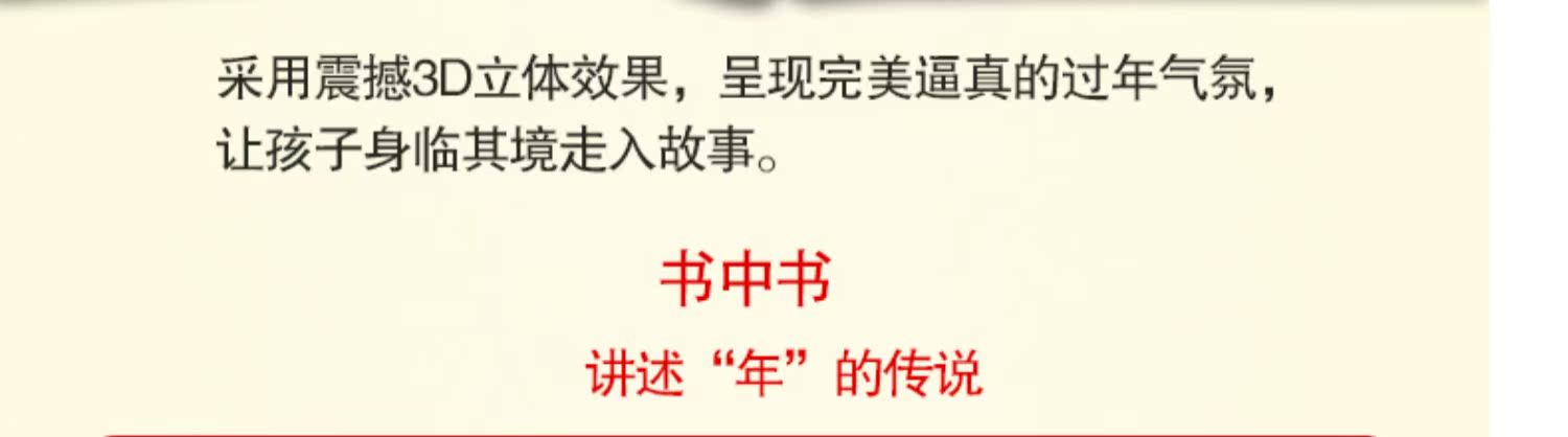 采用震撼3D立体效果,呈现完美逼真的过年气氛,让孩子身临其境走进故事,改变阅读方式,动手又动脑,趣味解说,图文并茂,精美手绘,带来浓厚的春节气息,给孩子的新年礼物。
