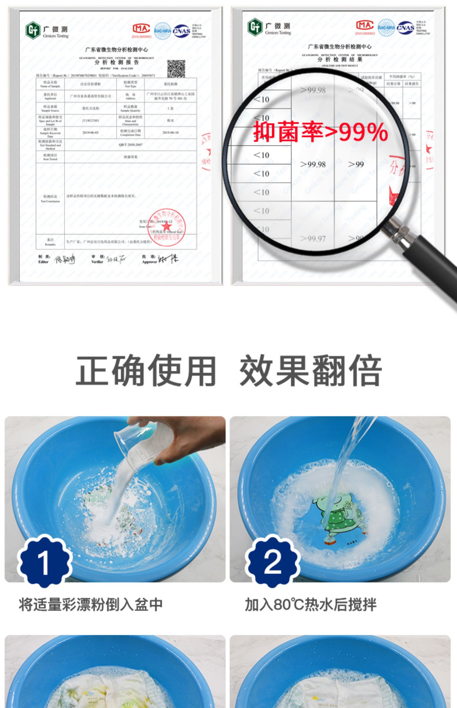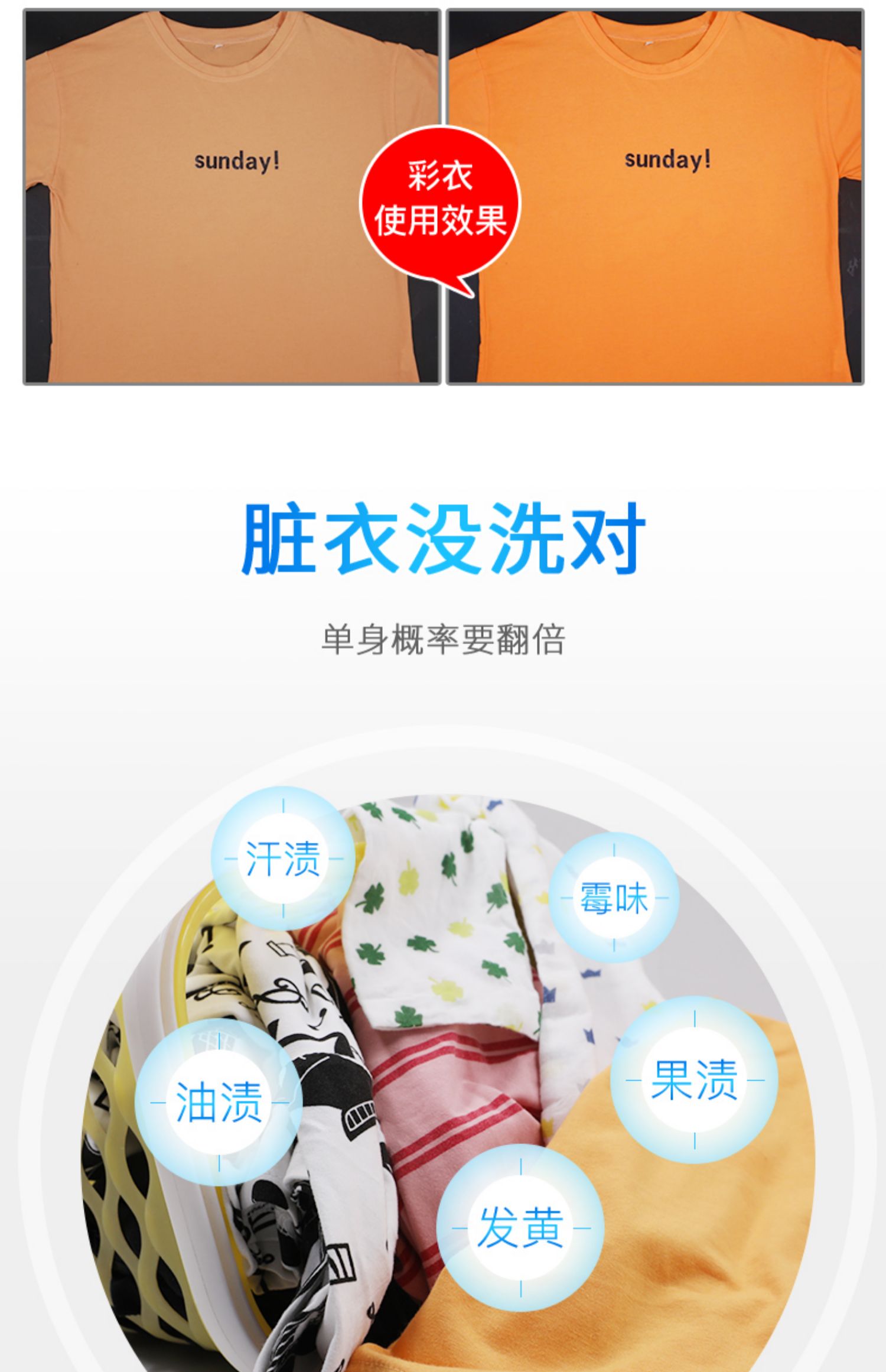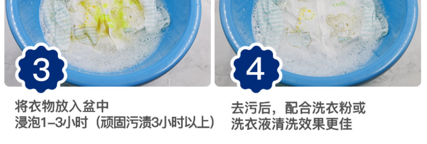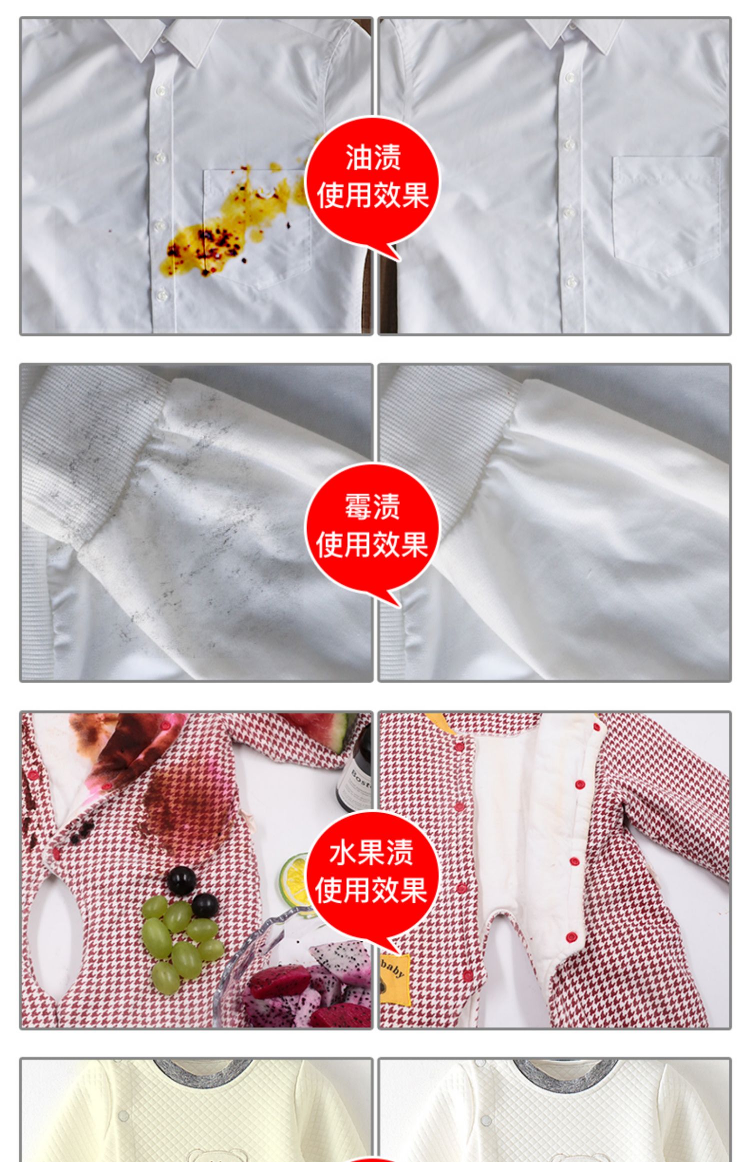 我的天呐!孩子一没看住,衣服上的油渍,果酱渍全沾上了!还好有去污神器彩漂剂!安全不伤手,不伤衣!轻松去黄去渍,让白色衣服更亮白,彩色衣服更护色!