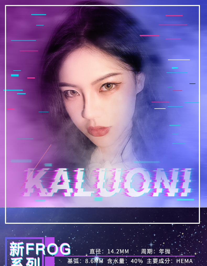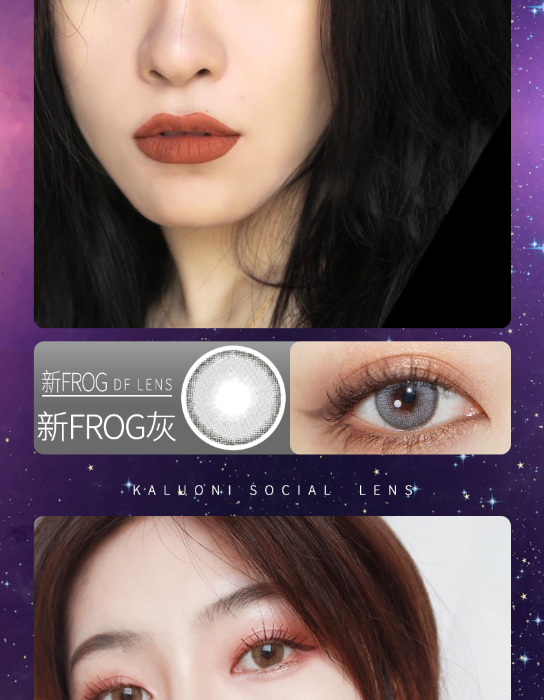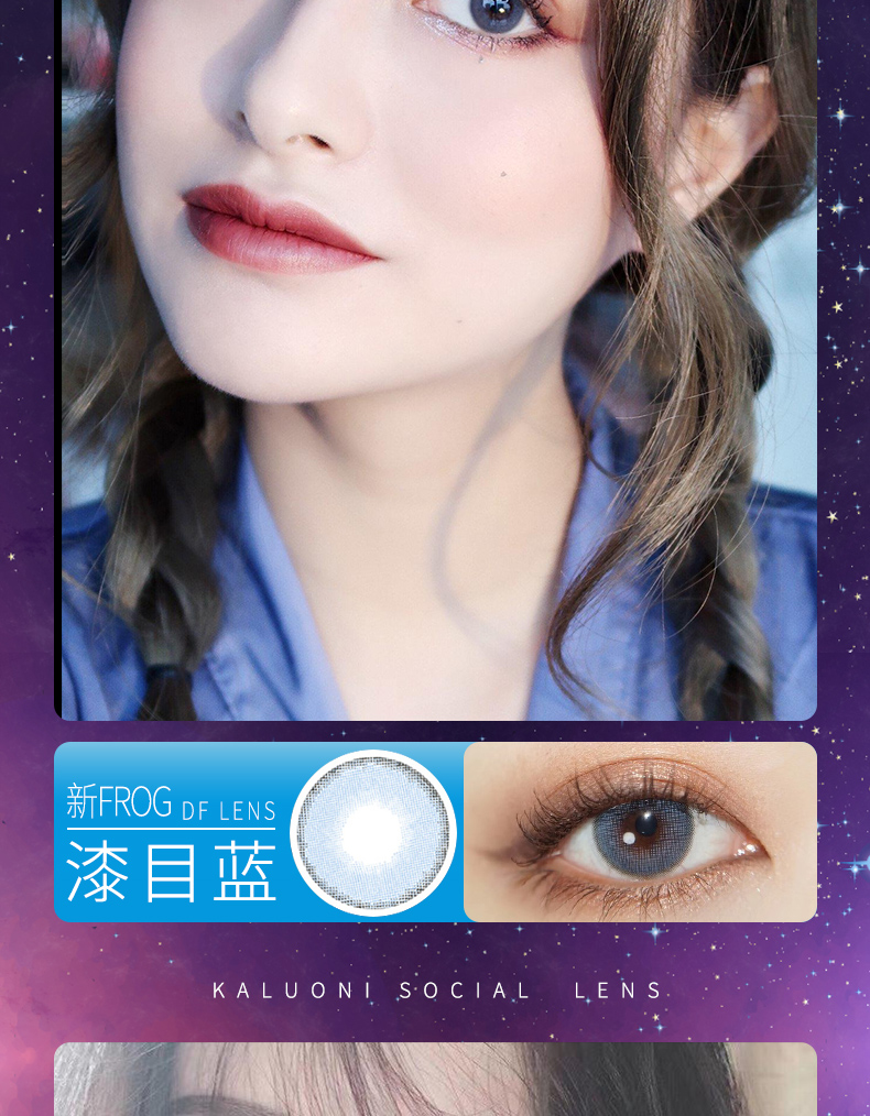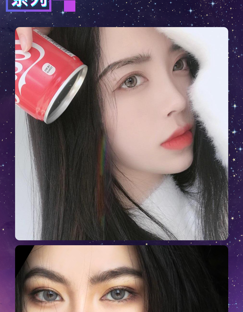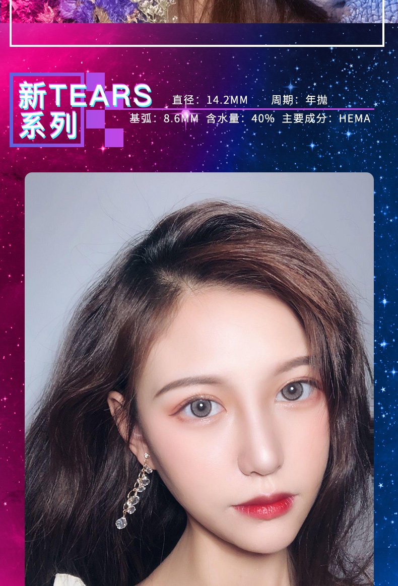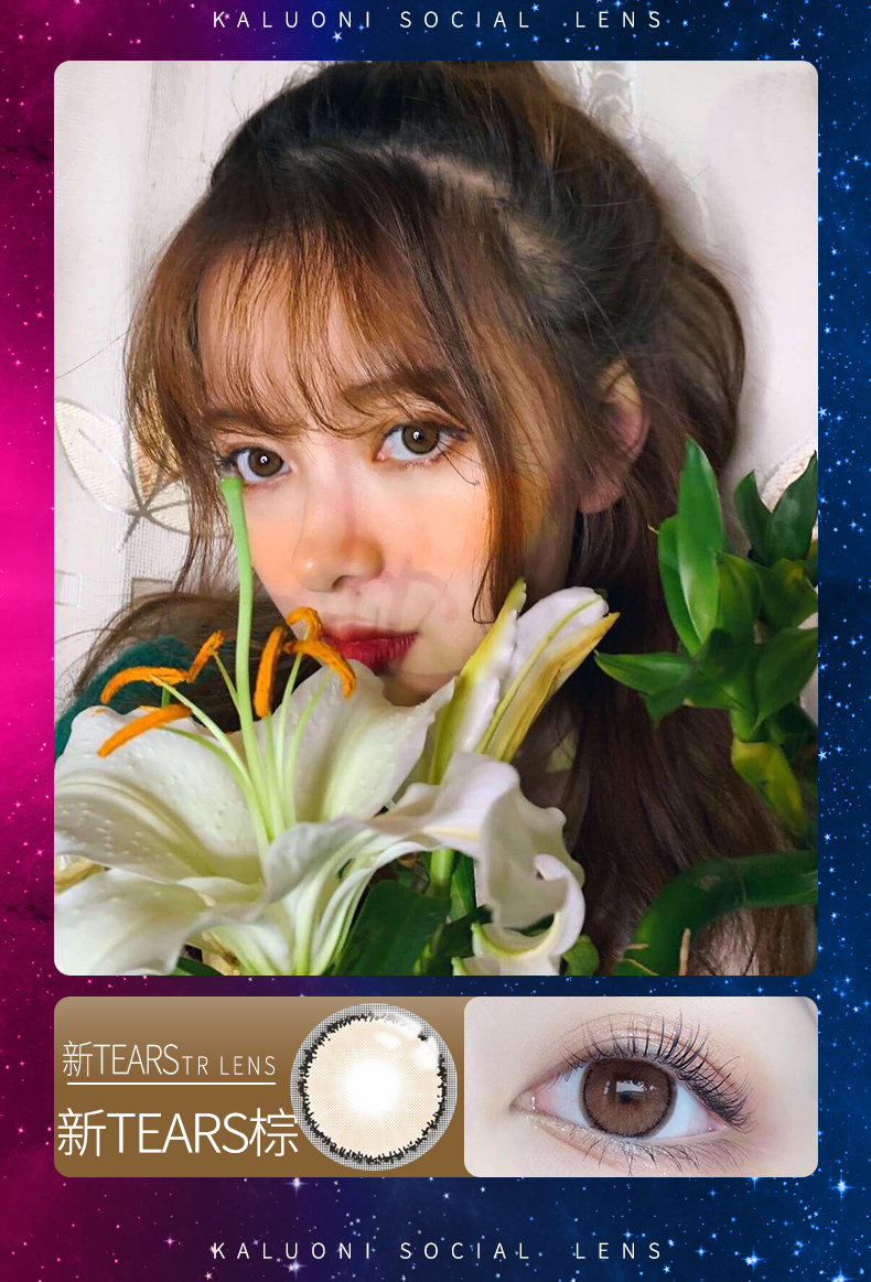 卡洛尼年抛采用三明治工艺,镜片舒适,含水量40%不易眼干,直径14.2适合大多数人群佩戴,有黎雾和泪花系列,支持多色可选,混血感爆棚.