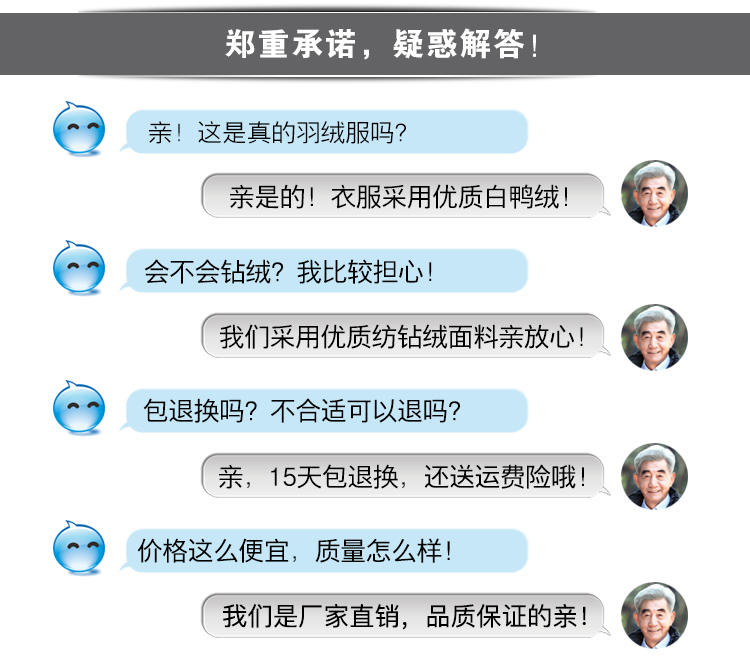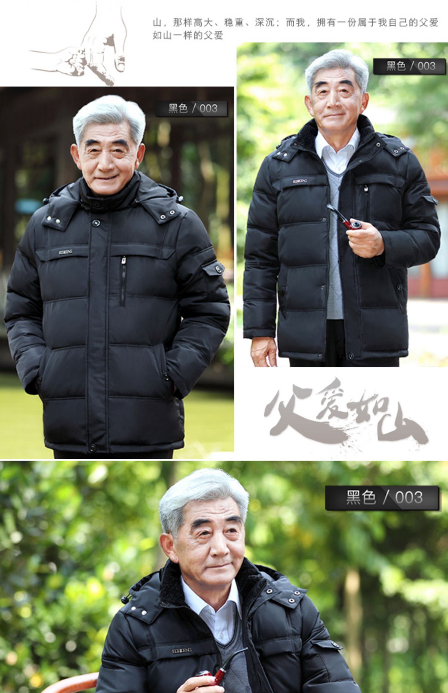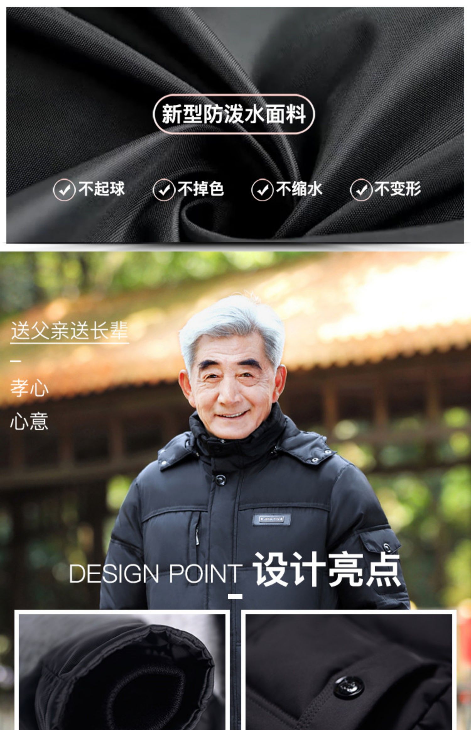 寒冬已至,是时候送爸爸一件好羽绒服了!优质羽绒给爸爸安心的舒适和温暖,80%白鸭绒,3D立体剪裁,不起球,不掉色,不缩水,不变形,钻绒包退!七天无理由包退,赠运费险!