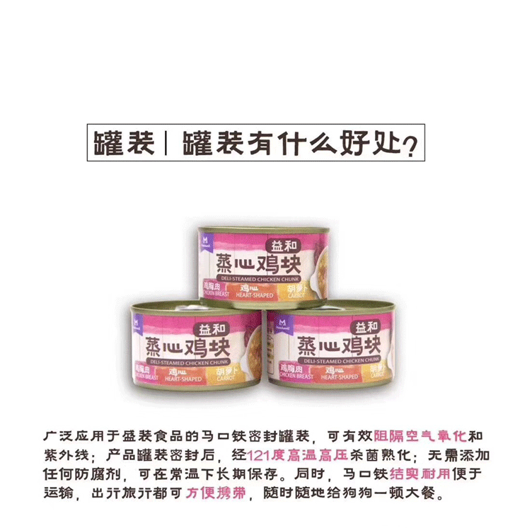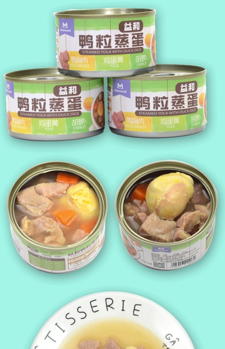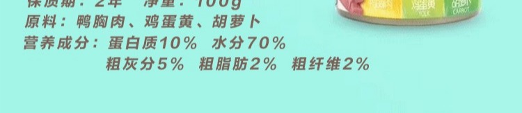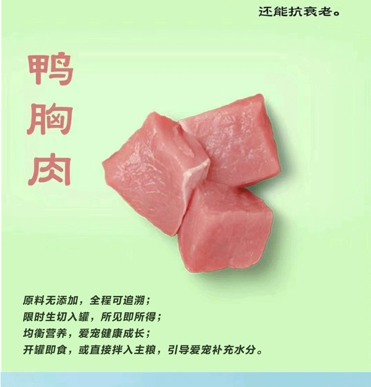 鸡肉,鸭肉两款可选。超高品质,生肉入罐再蒸,营养锁在罐头里,补充维生素、钙,促进消化