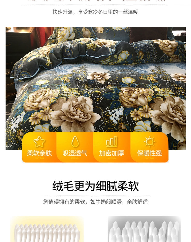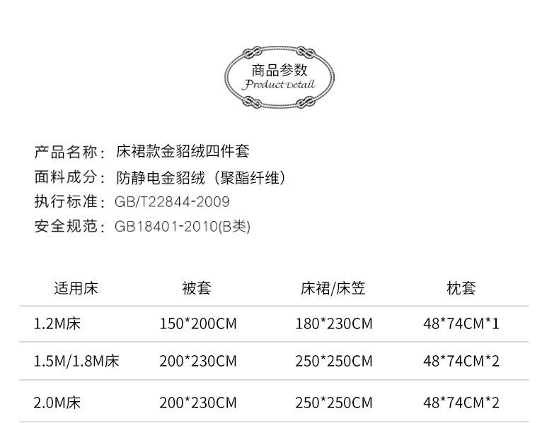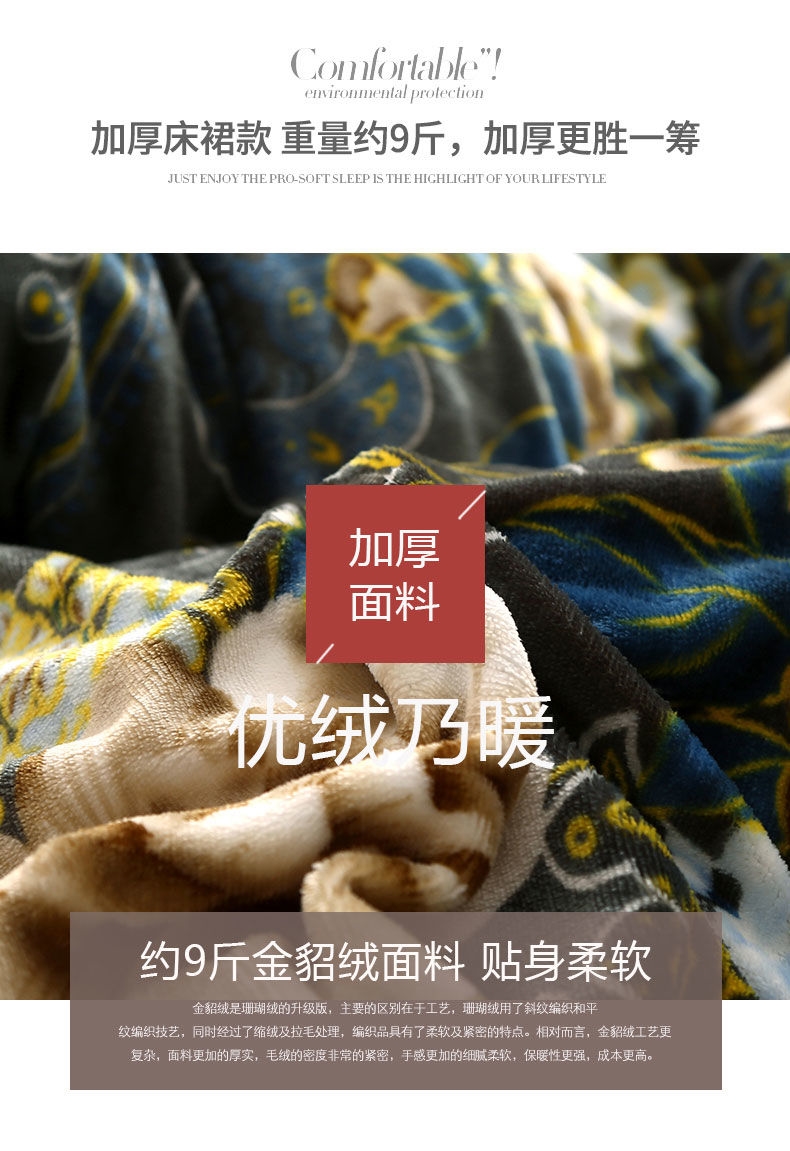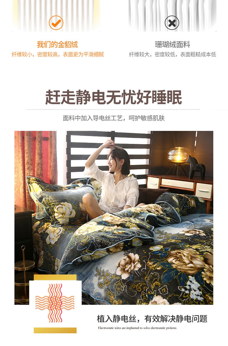 选用进口导电纱实现面料零静电,面料采用是第七代工艺织成做到了无静电,不褪色,不起球,不掉色,不掉毛,不钻被芯。更舒适,更保暖,更容易清洗。床单采用拼接床裙式工艺,更大垂下感更好适用各种大床.