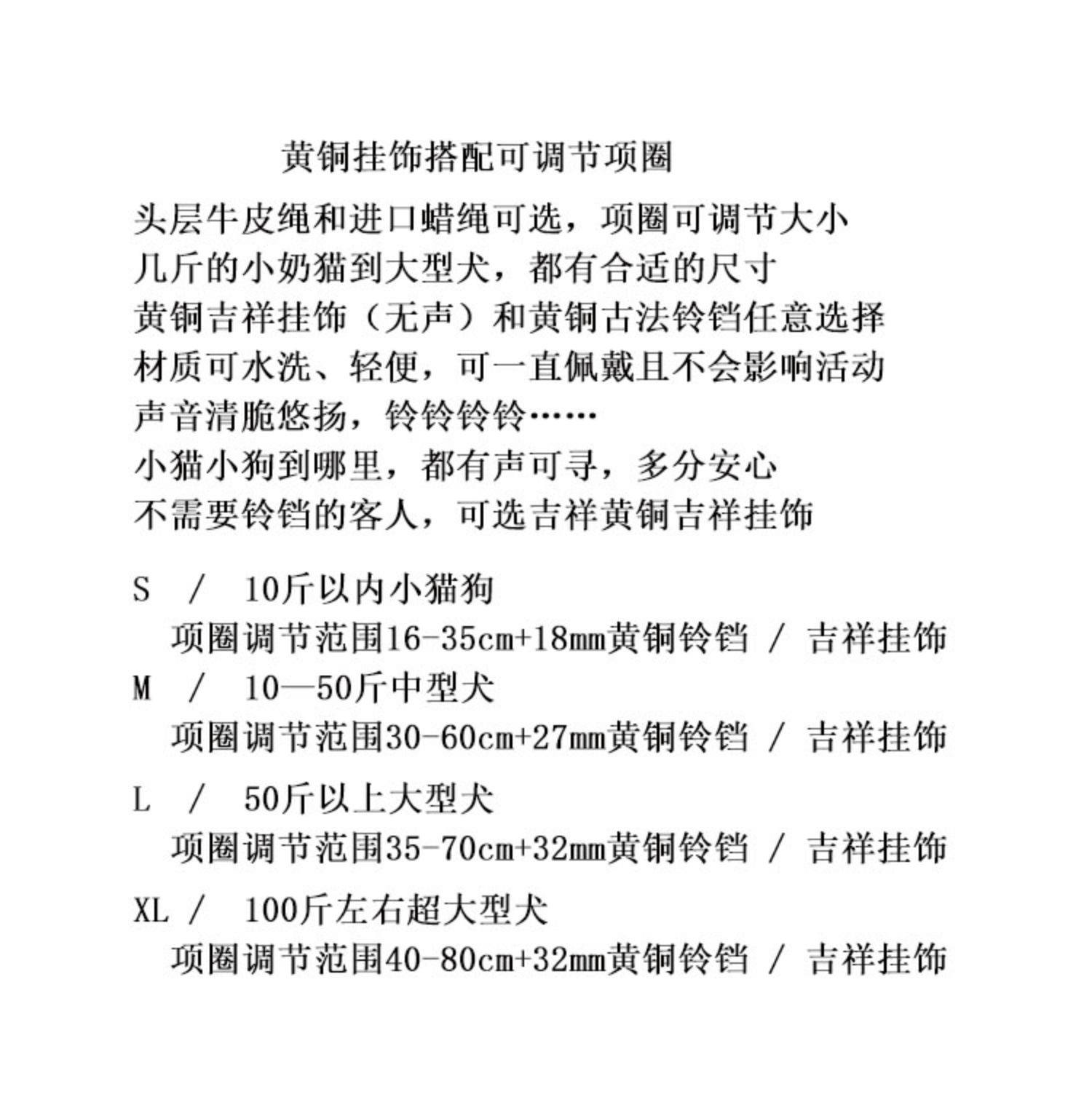 手编项项圈,可以调节长度,头层牛皮压制的牛皮绳,小到几斤的小奶猫一直到大型犬,都有合适的尺寸。项圈可以调节长短声音清脆悠扬,铃铃铃铃……小猫小狗到哪里,都有声可寻,多分安心。