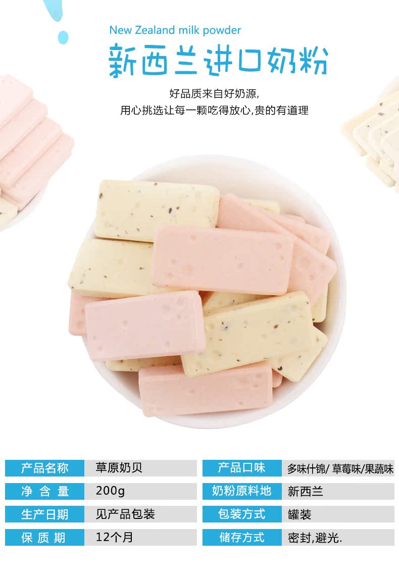 第二件0元,超划算~新西兰优质奶源,安全有保障,低糖分配比,粉质细腻,口感柔韧酥脆,不伤宝宝牙齿~!奶味浓郁纯正,营养丰富又美味,饿了困了随时来一粒~