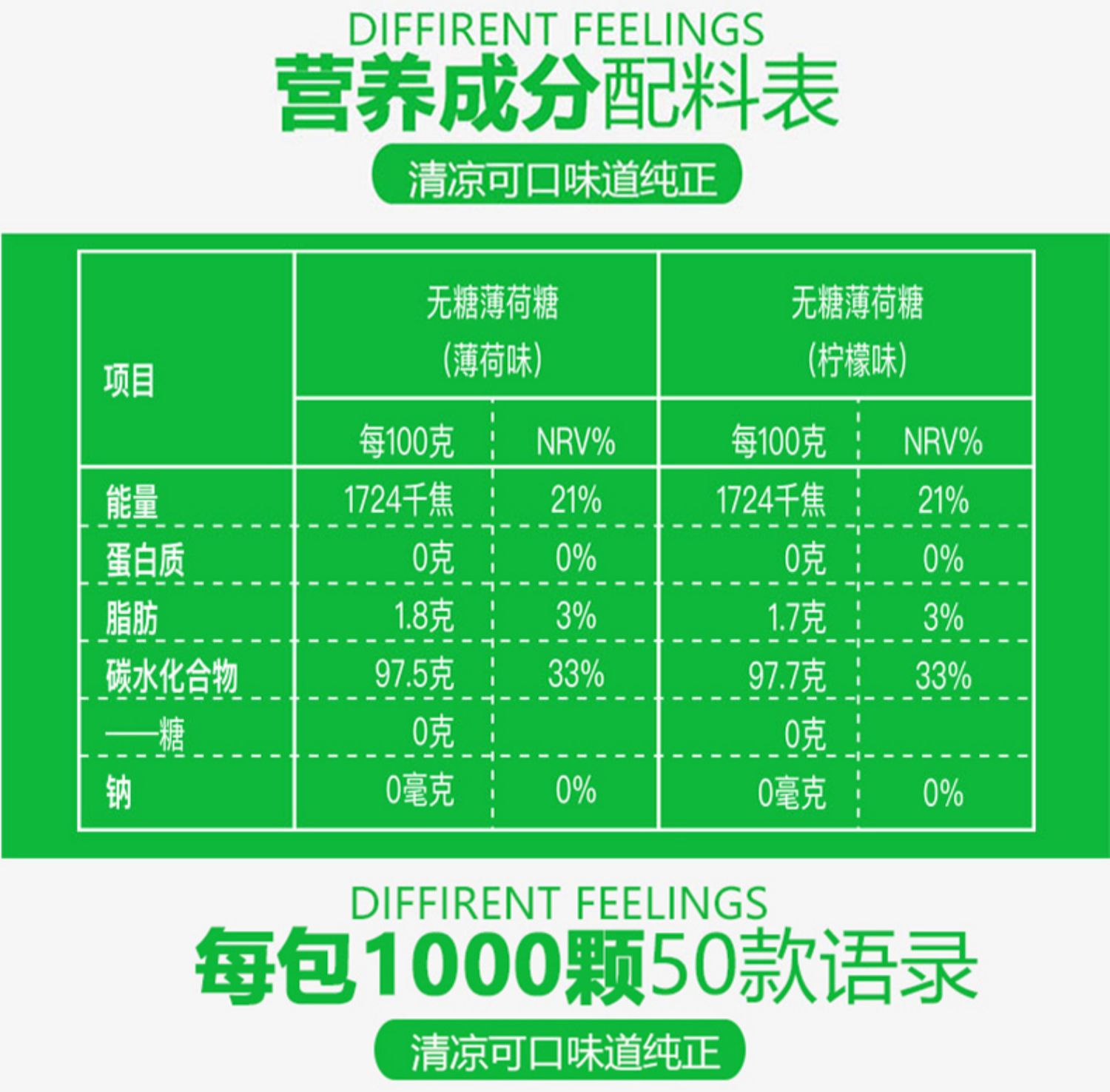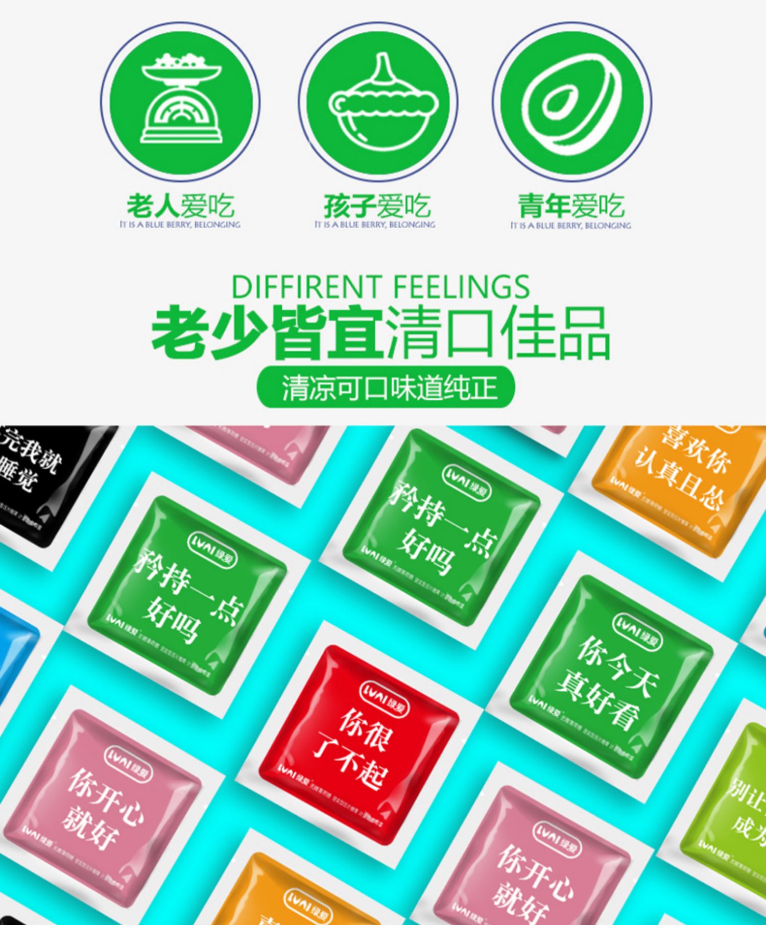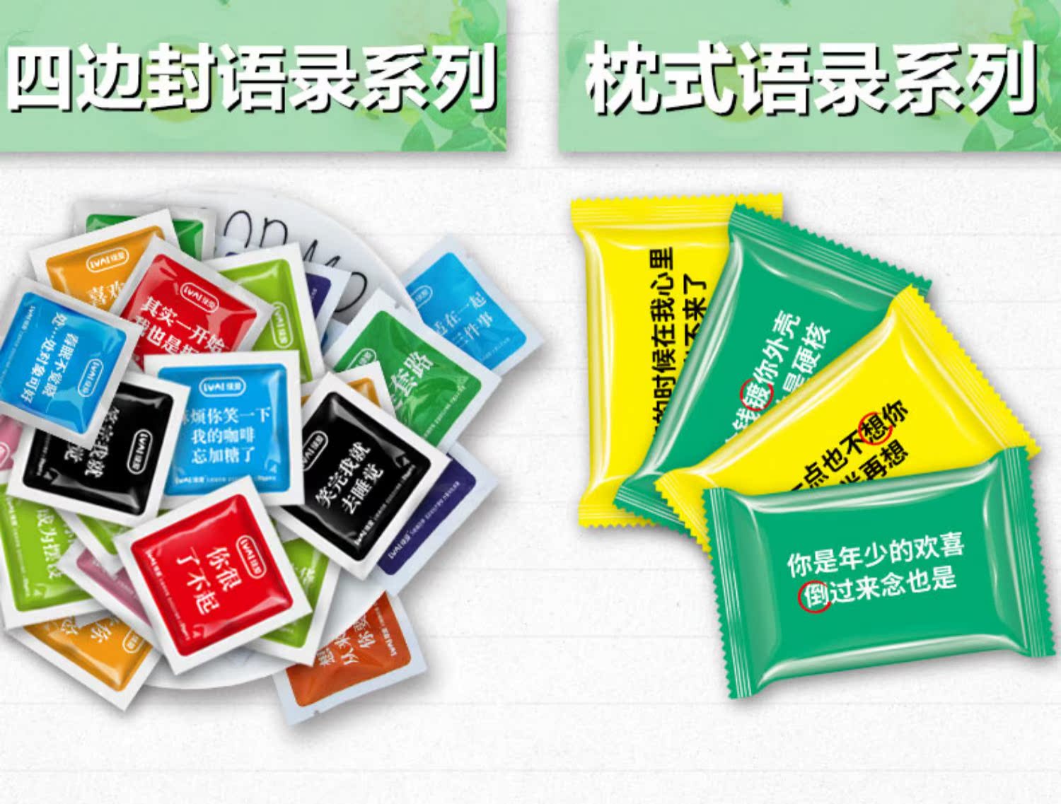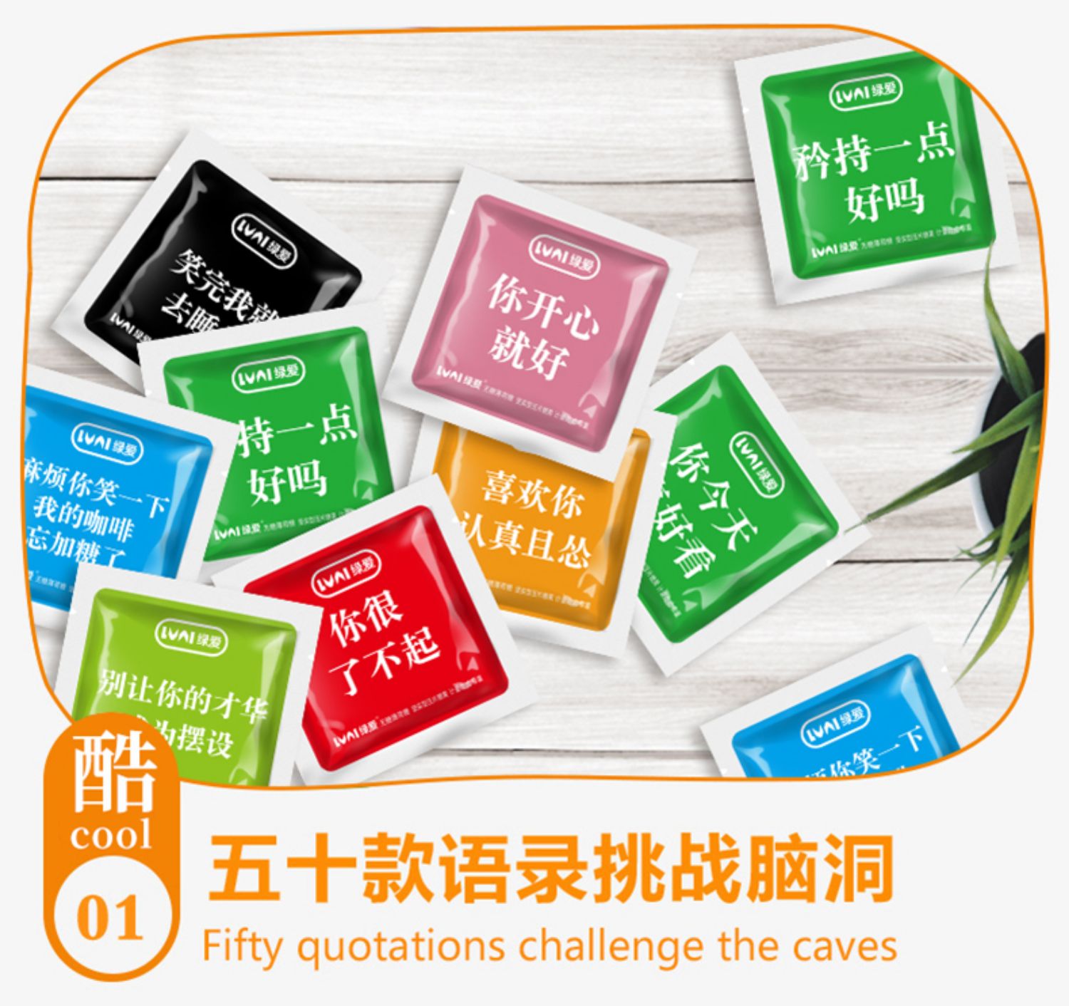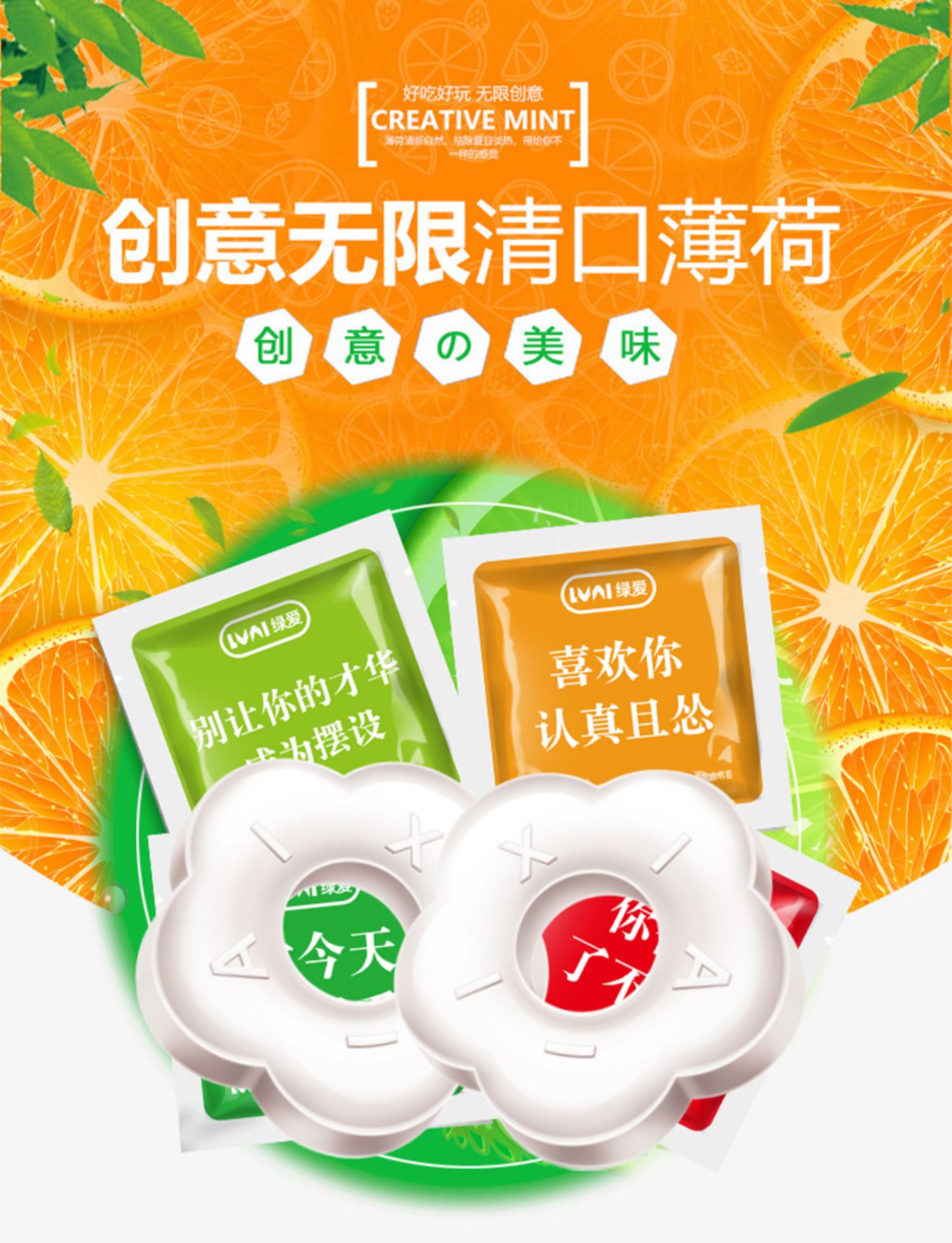 清新口气,唇齿留香!每个包装都有不同的语录,搞怪经典!潮人必备,虽甜确不含糖,更健康!