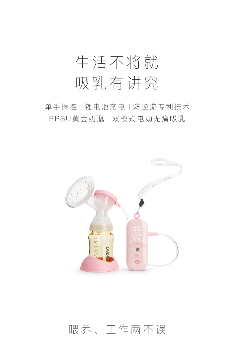十年品牌历程,远销40多个国家!滚珠模式,吸力档位,三色可选,十轻一重泌乳,无痛舒适吸乳,奶瓶材质PPSU,耐高温180度,吸奶防逆流专利技术,充电2小时,轻松一整天!