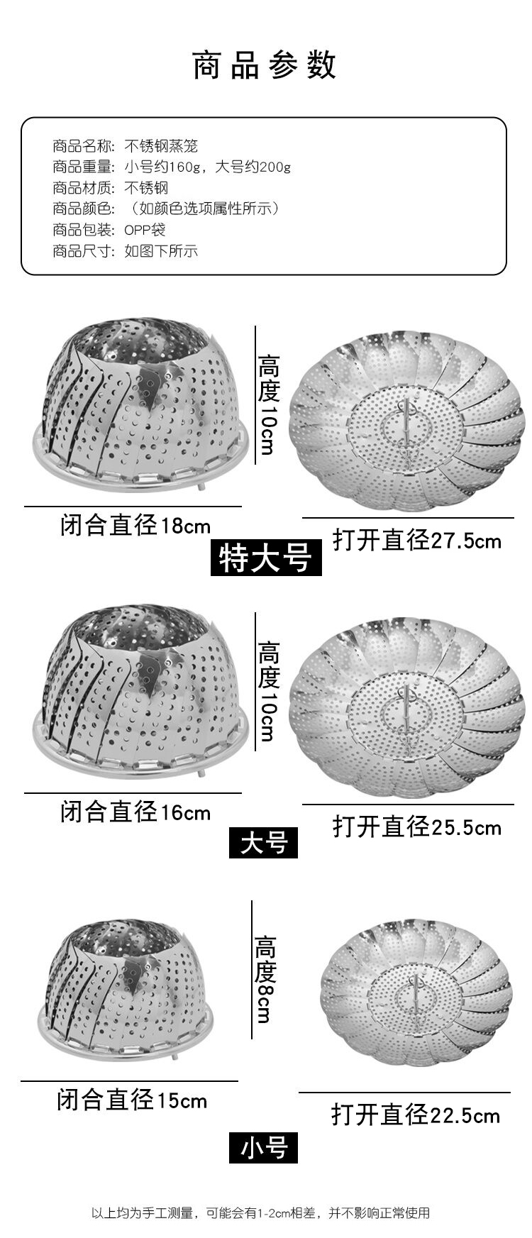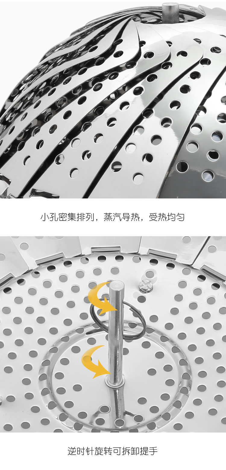 创新可折叠设计,小巧易收纳,适用范围更广,蒸馒头,蒸菜,蒸饭,蒸鱼统统搞定,自带可拆卸提手,加粗钢丝牢固不生锈,防烫又实用!限时特惠。