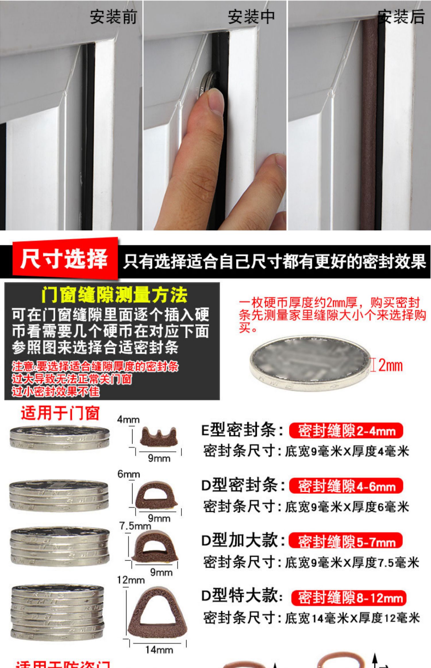 优质硅橡胶材质,弹性好,柔韧性强,超强自粘性,操作简单,防盗门窗、空调房防冷气外漏,防水防尘,防撞隔音,防蚊虫,统统都用得上!