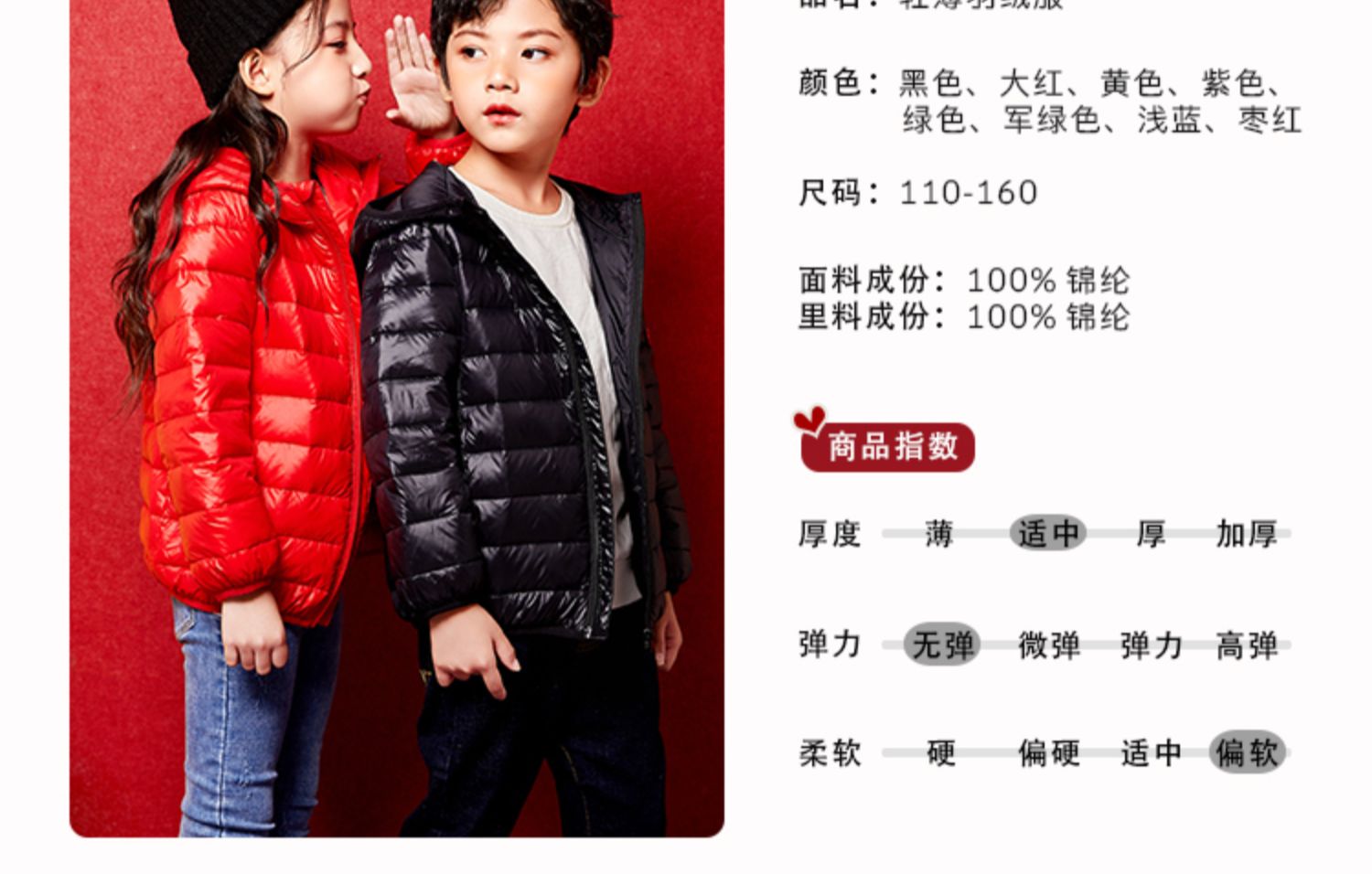 大牌巴布可可,专注儿童羽绒!爆款轻薄羽绒,90%白鸭绒填充!轻盈蓬松,保暖性极高!高密度防钻绒面料,羽绒想跑都跑不出来!【赠运费险】