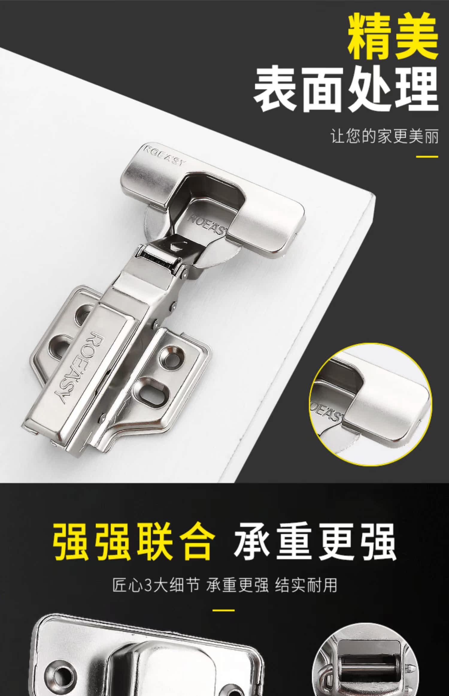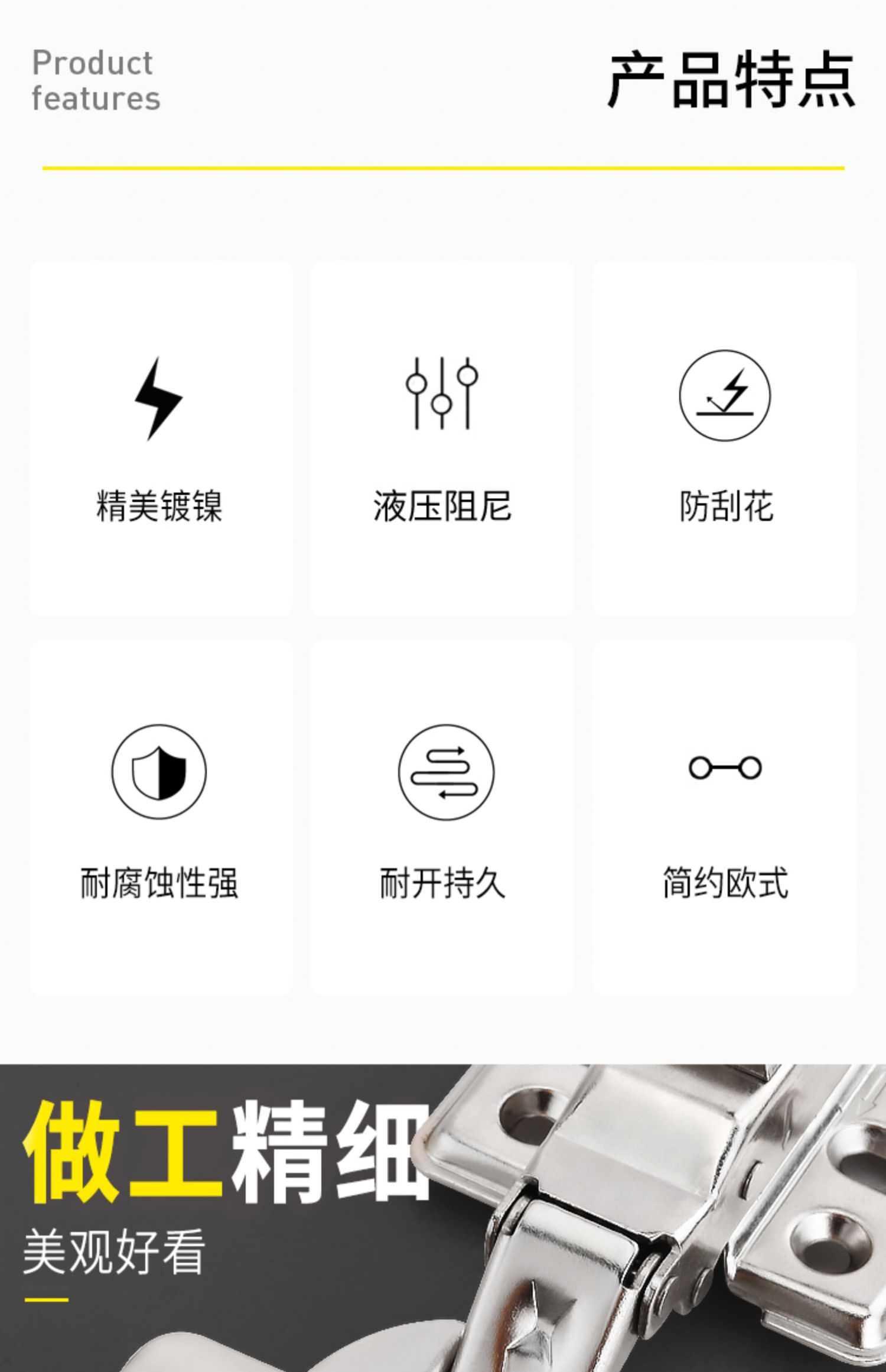 静音防锈,抗腐蚀强,阻尼液压缓冲,开合柔软,达到静音的效果适用于格式木质柜门。【默认邮政快递,不接受指定】