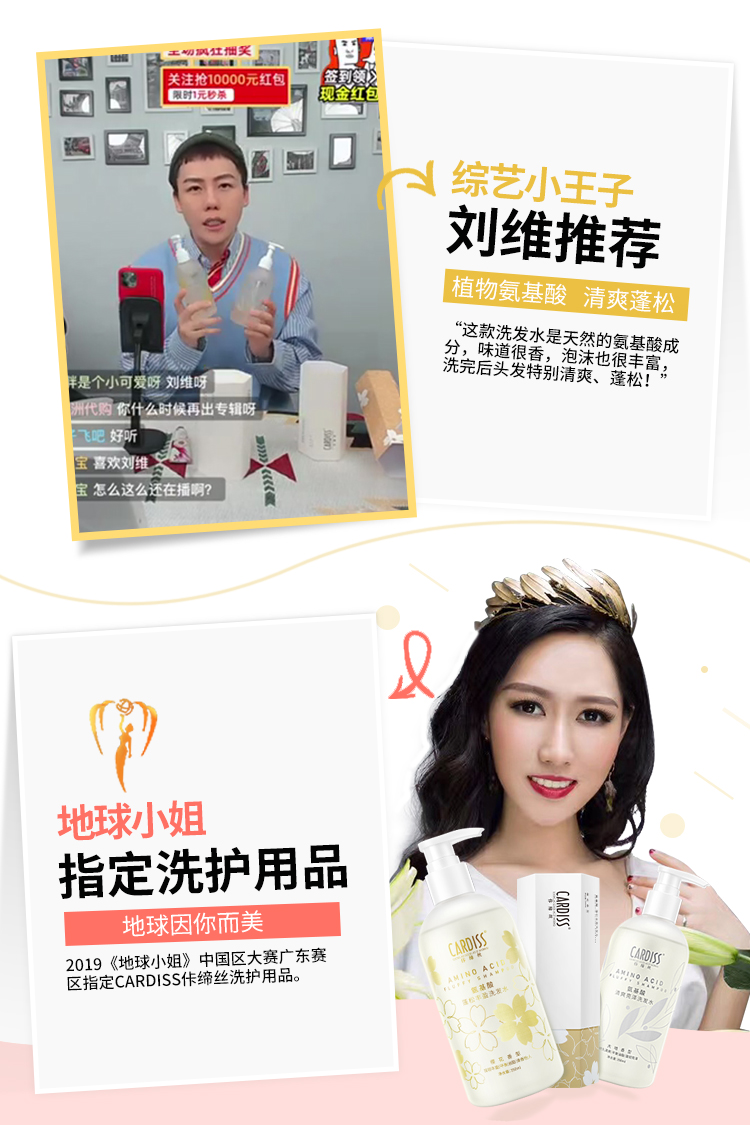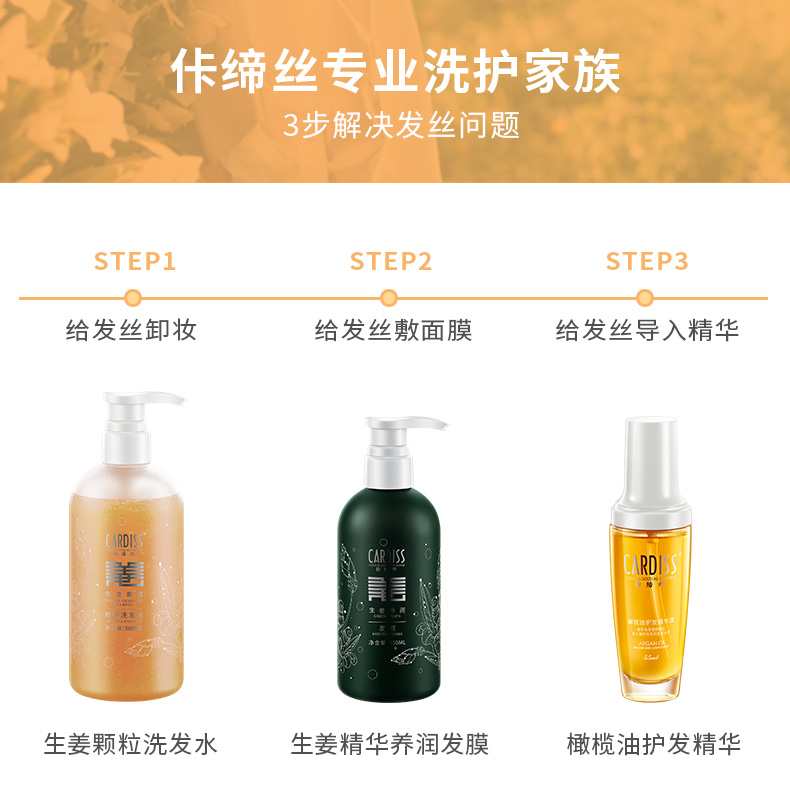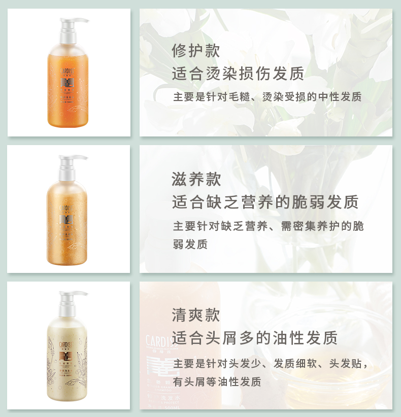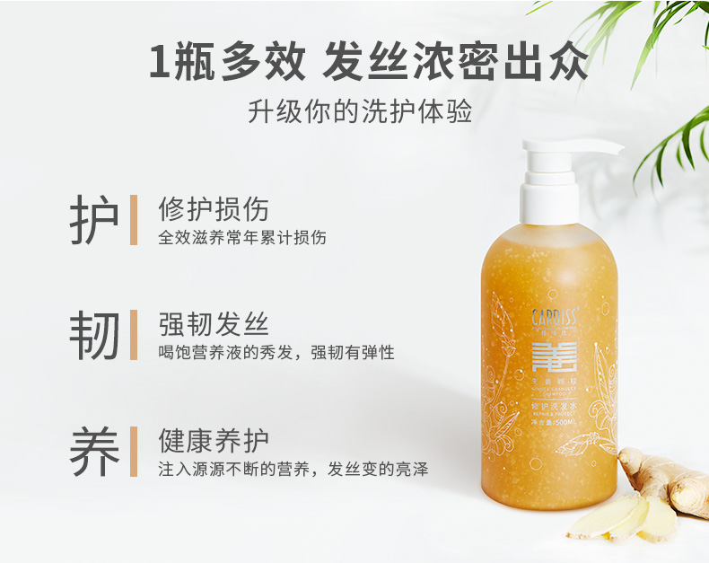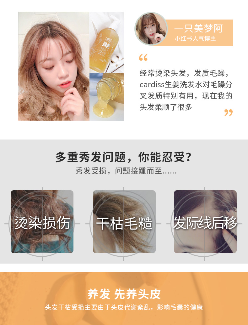 CARDISS佧缔丝生姜颗粒修护洗发水,适合毛燥、烫染受损、凌乱、干枯、掉发等发质,采用高浓度生姜护发配方,多重植物精华滋养护理,由发根到发梢的深层修护!女神一定要有一头漂亮的秀发~