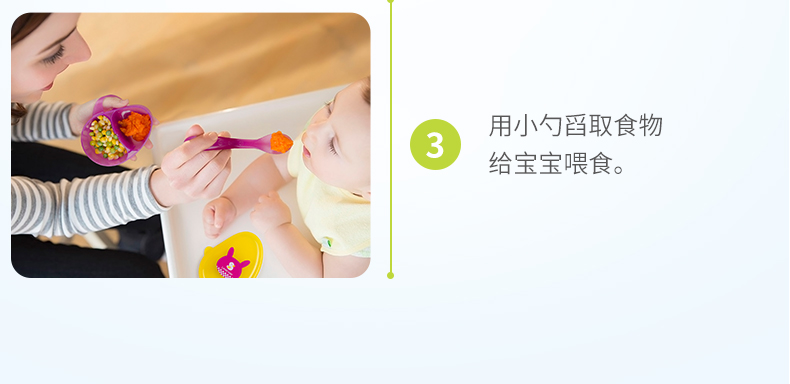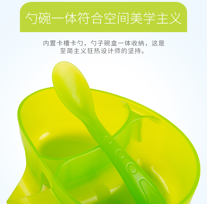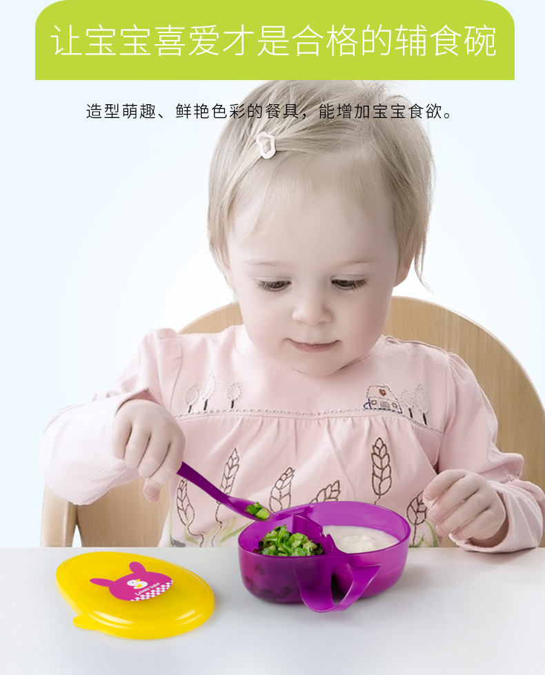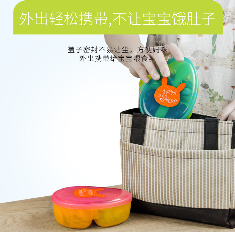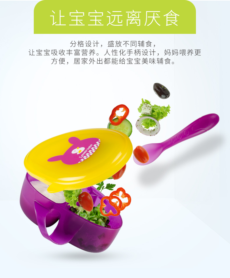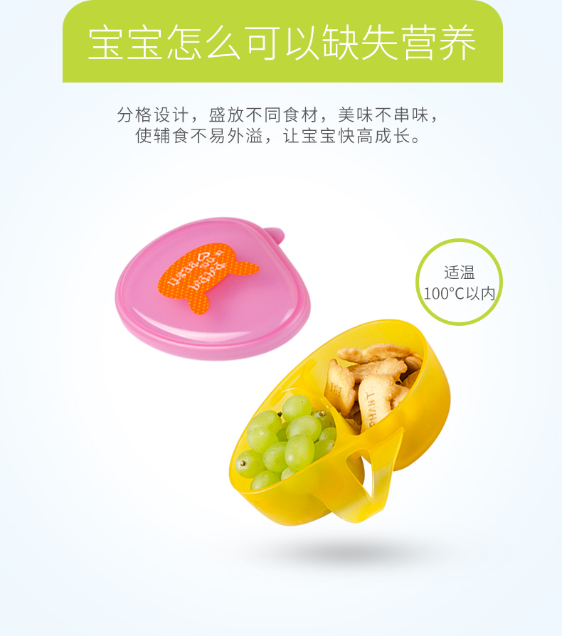 食品级PP材质,外观精致小巧,可爱有趣的卡通图案,贴心的分格和手柄设计,配备了精巧的辅食勺,是妈妈们给幼龄宝宝或者外出携带给宝宝喂食的必备餐具。