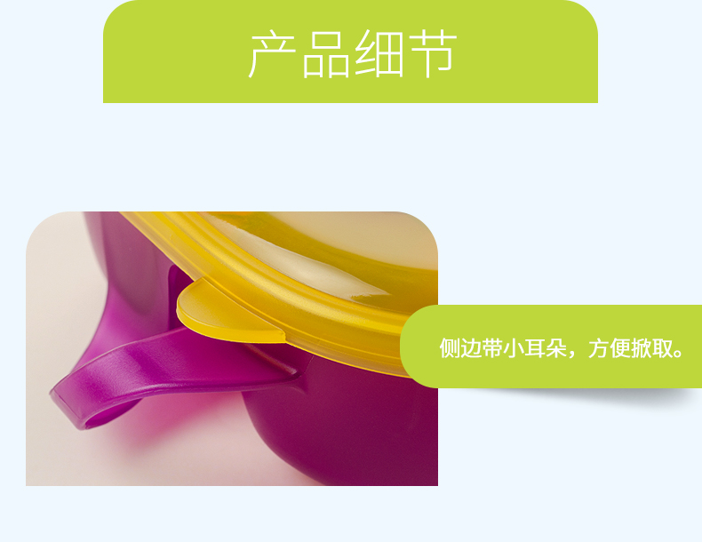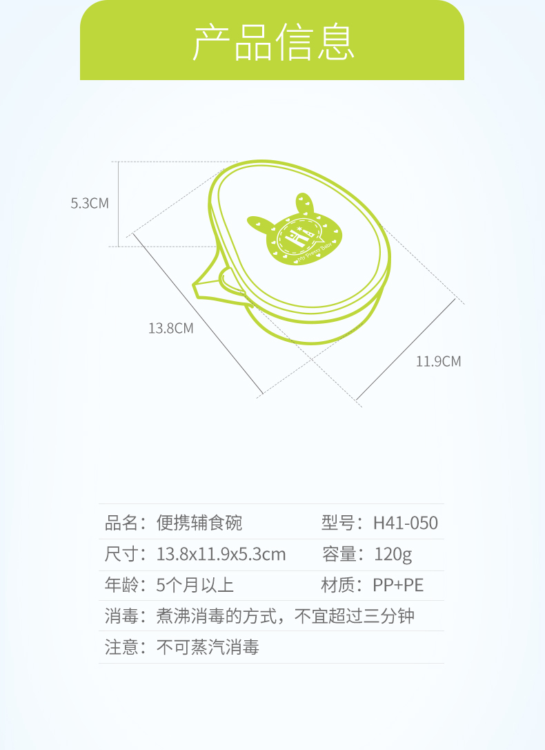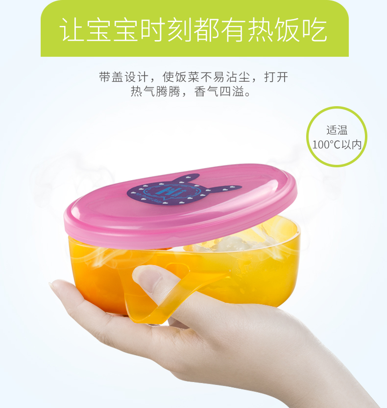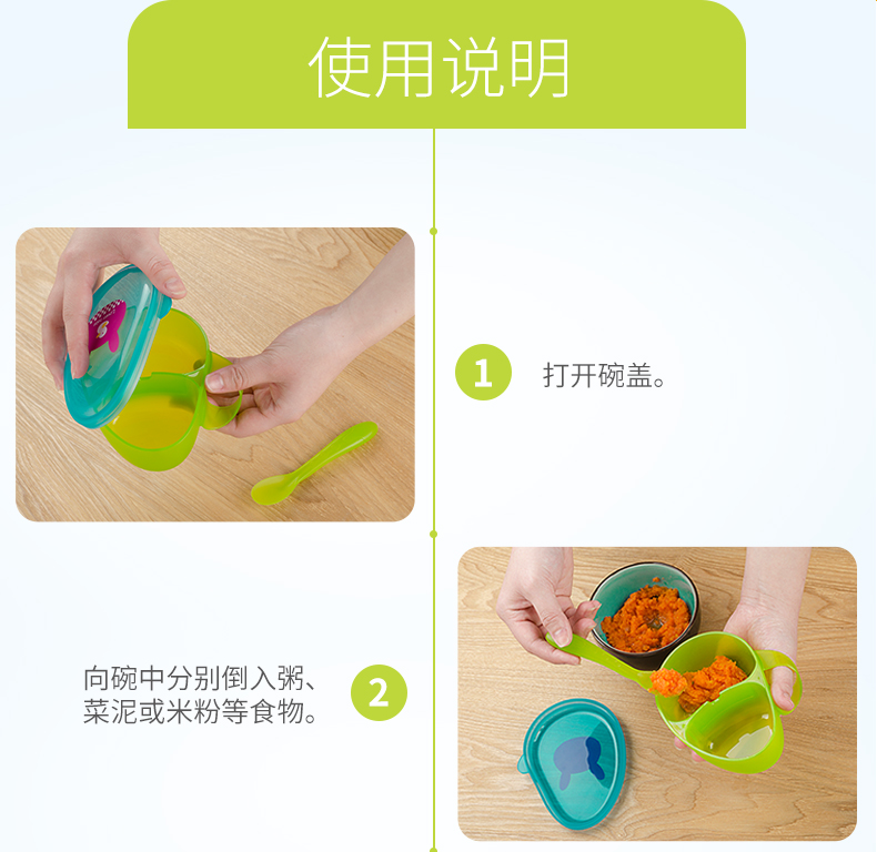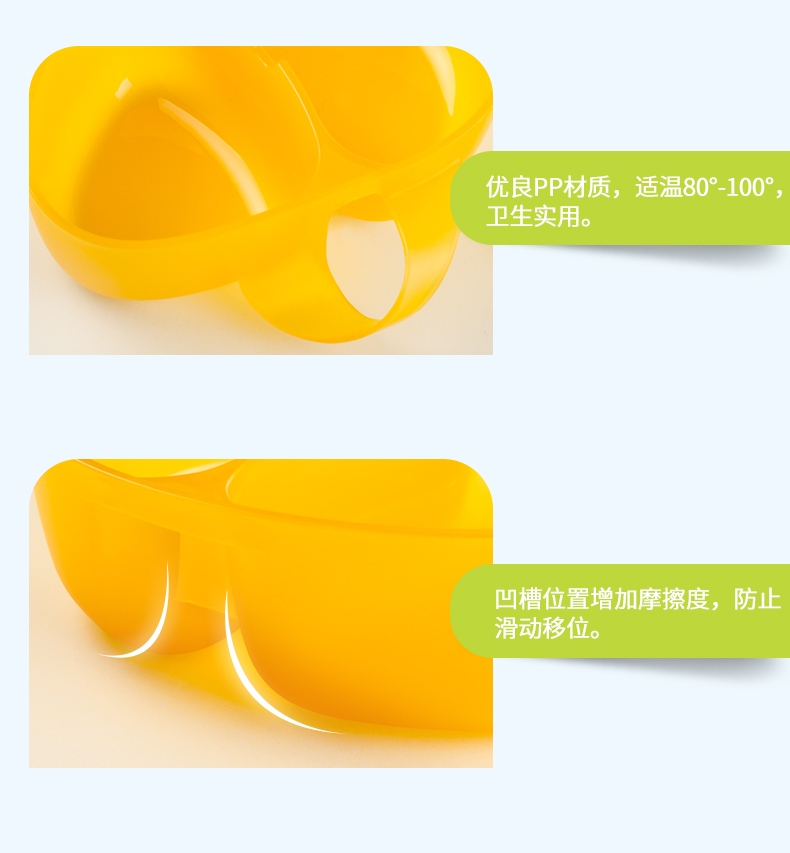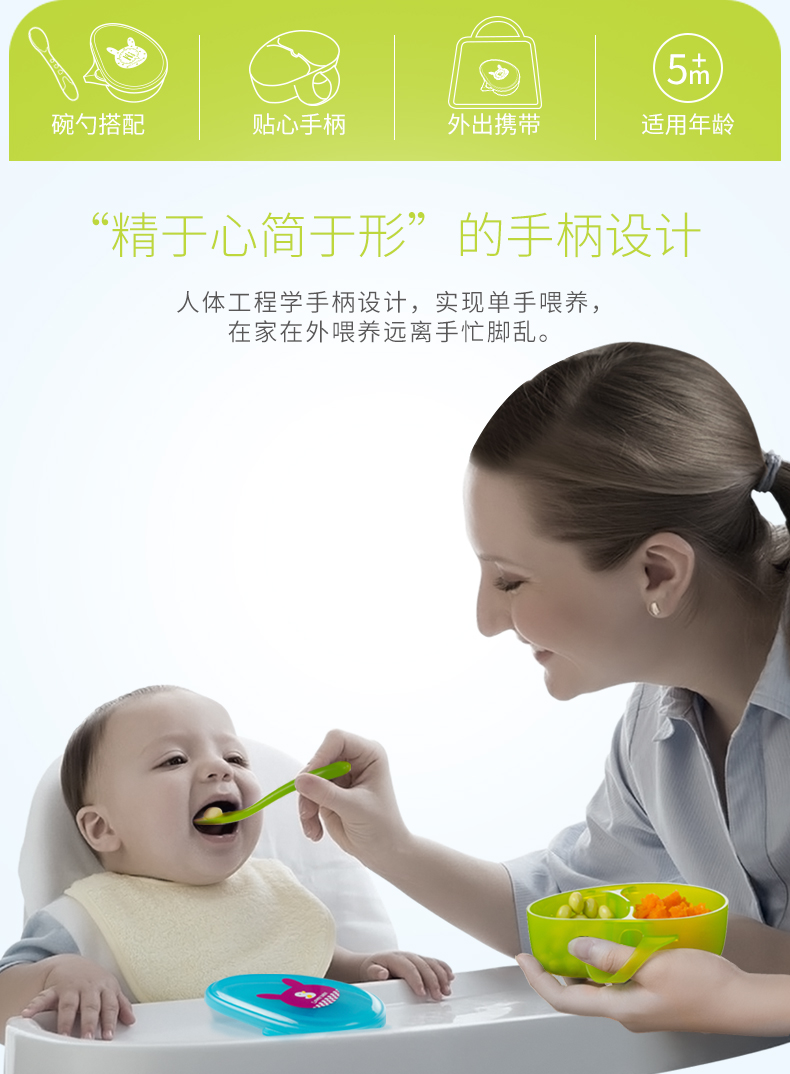 食品级PP材质,外观精致小巧,可爱有趣的卡通图案,贴心的分格和手柄设计,配备了精巧的辅食勺,是妈妈们给幼龄宝宝或者外出携带给宝宝喂食的必备餐具。