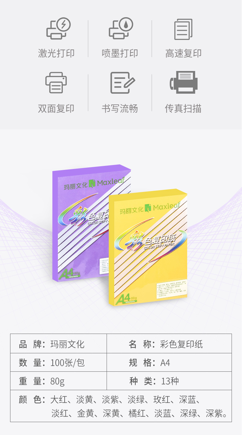 80g加厚100张,多色可选哦,玛丽专业做纸30年,品质保障,高速复印,喷墨打印,双面书写,传真扫描,高效办公,色彩丰富,饱和细腻,做精品纸张