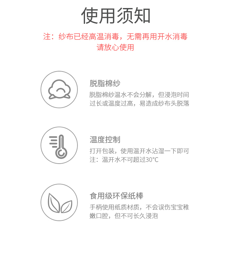 给宝宝就要给好的!医用级脱脂纱布,绵软保护口腔黏膜,干湿两用,不含任何添加剂,高效清理宝宝口腔细菌,无任何的刺激感。让宝妈更放心,给宝宝安心!