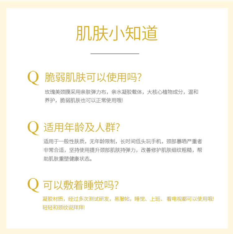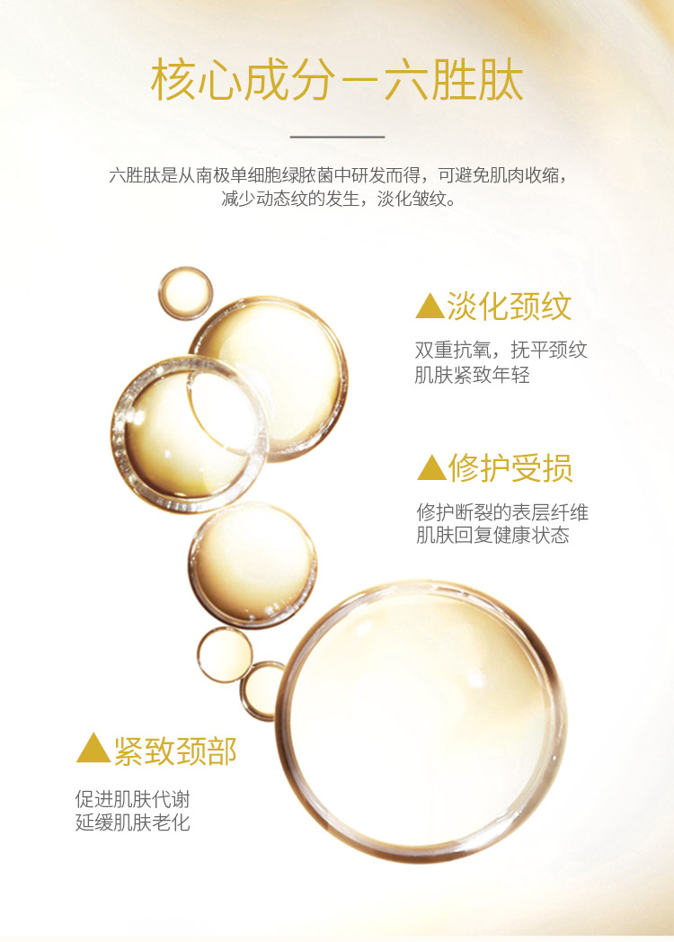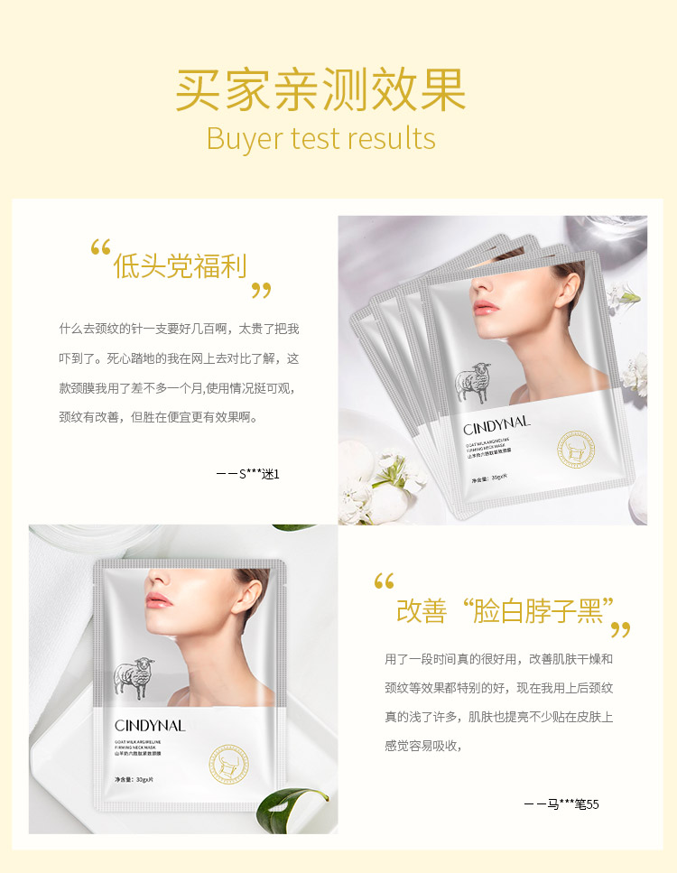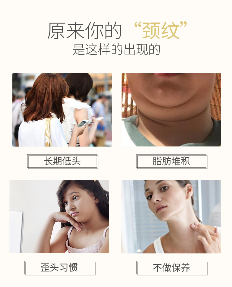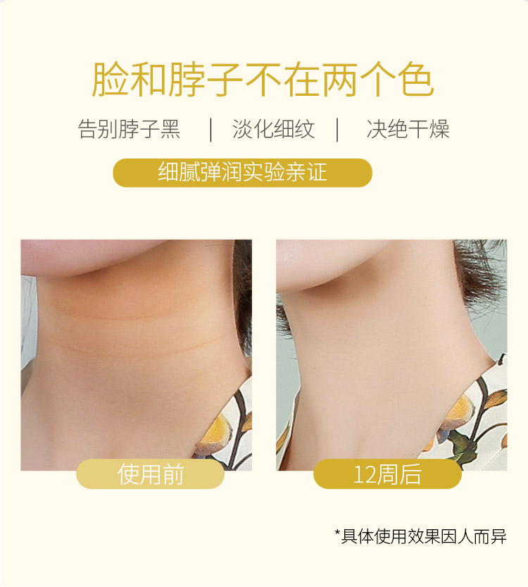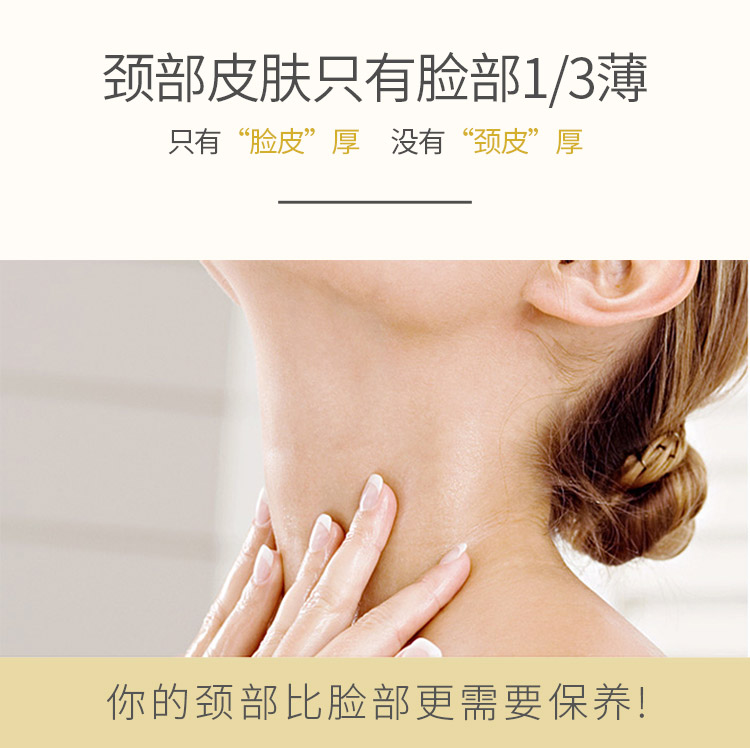 山羊奶提取物、六胜肽等保湿嫩滑成分,温和呵护颈部肌肤,使颈部肌肤水感细腻,淡化颈纹,提拉线条,颈纹“小熨斗”,重塑天鹅颈~【过敏包退】