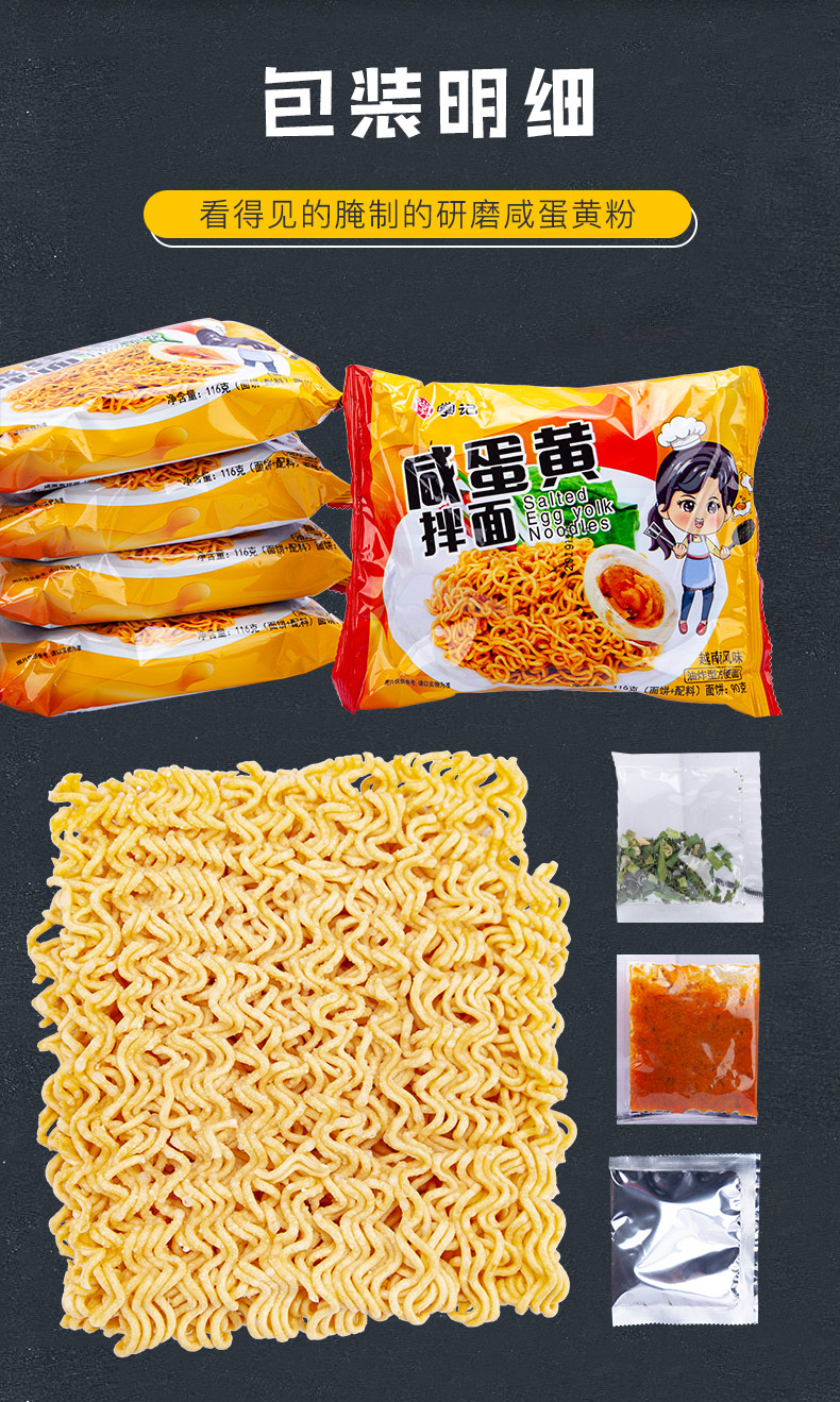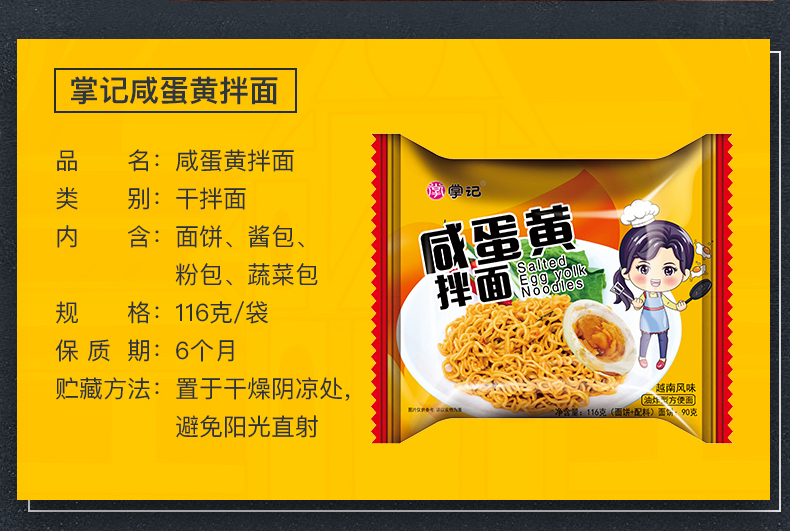 【正品保证】掌记咸蛋黄拌面116g*5包,甄选优质小麦粉,制成劲道面饼,面条劲道爽口,让人欲罢不能,色香浓郁,精心腌制,口感醇香顺滑,料足味美香喷喷,还原地道咸蛋黄风味