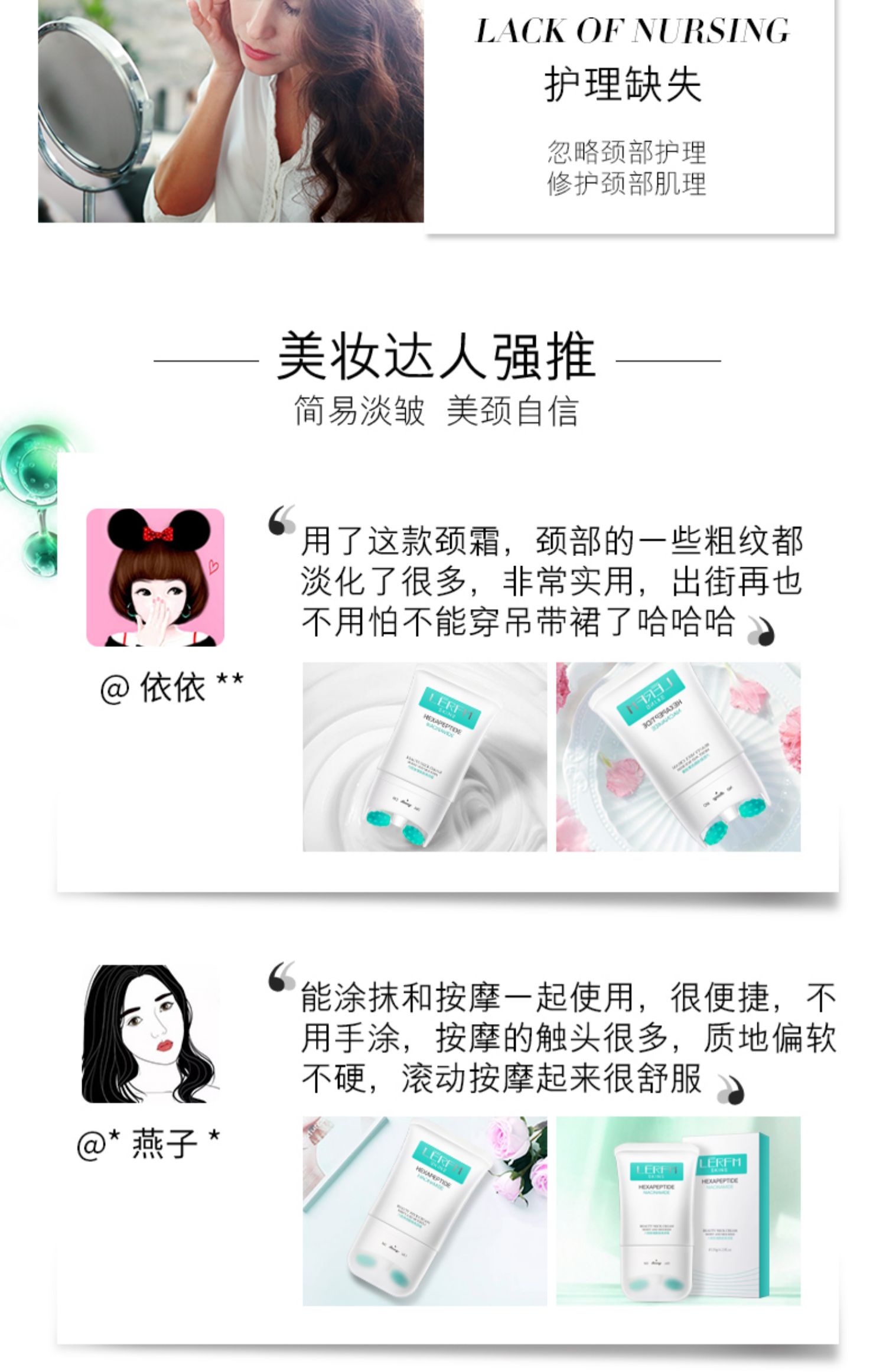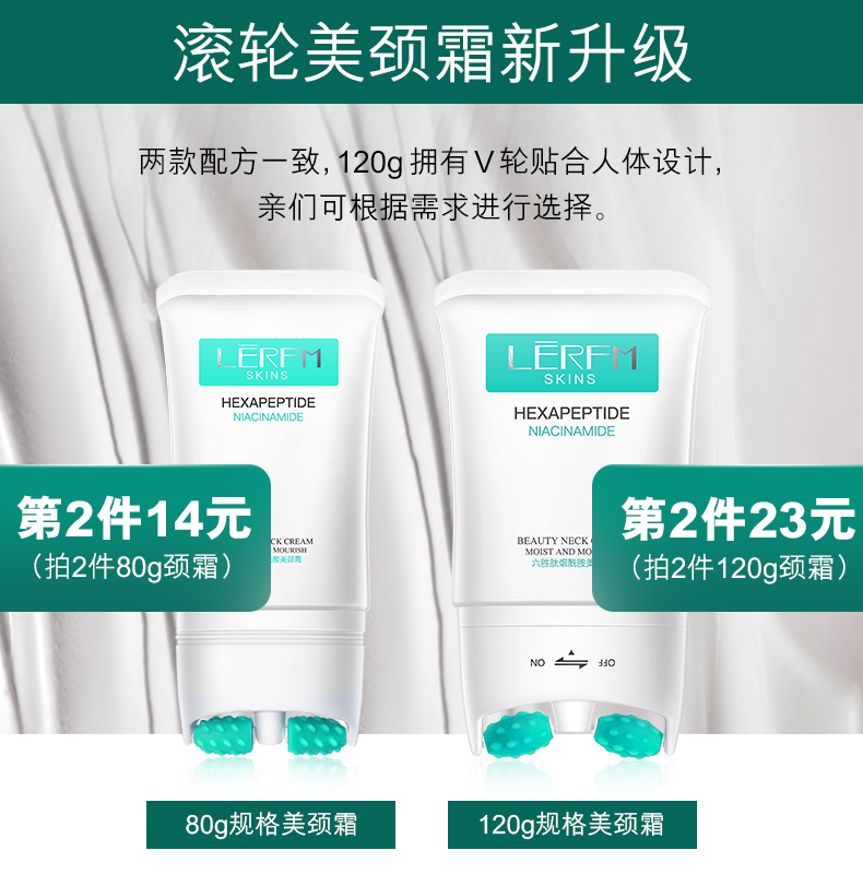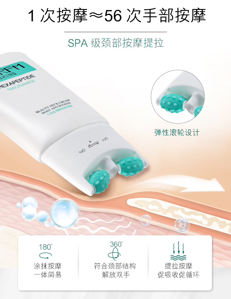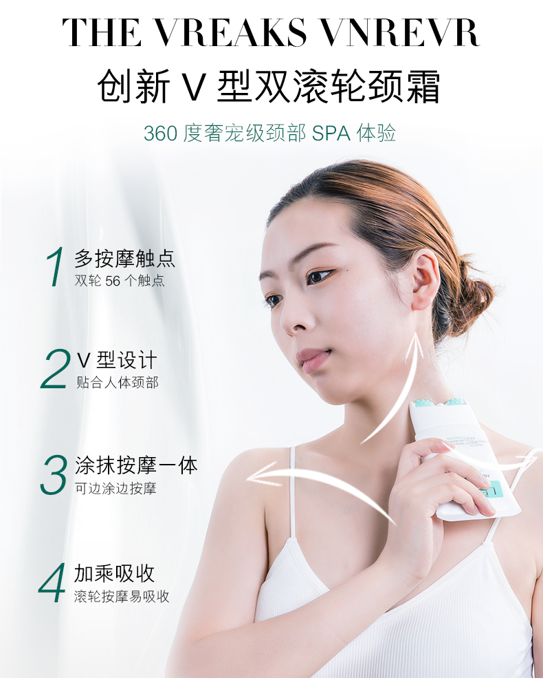 常年只做面部护肤?忽略了颈部的护理?颈纹遍布不敢不想出街?创新V型双滚轮美颈霜,还你天鹅颈!56个硅胶触点,诺比尔多肽成分,全脸可用!还有瘦脸效果,省掉买瘦脸仪器的钱!