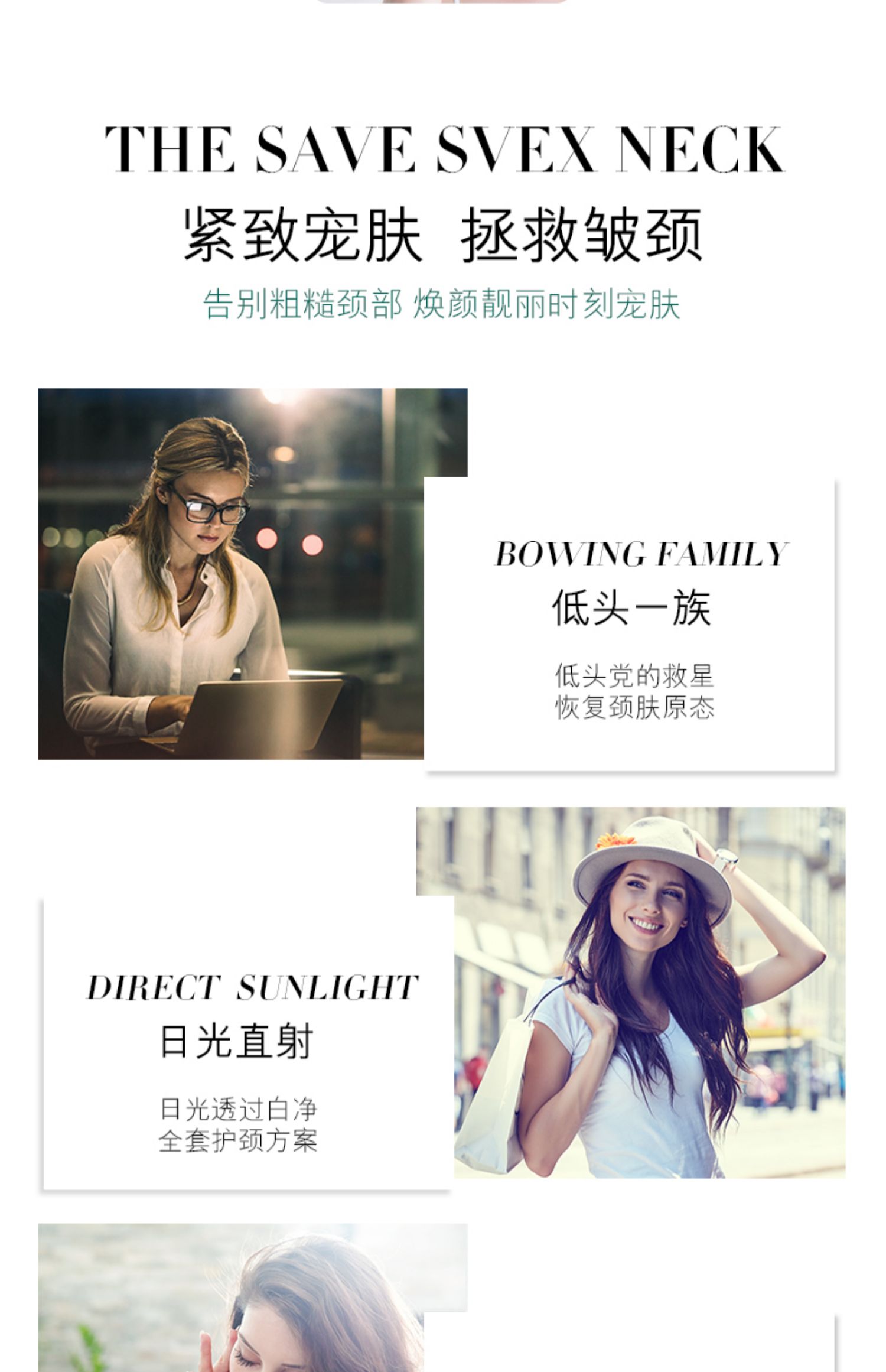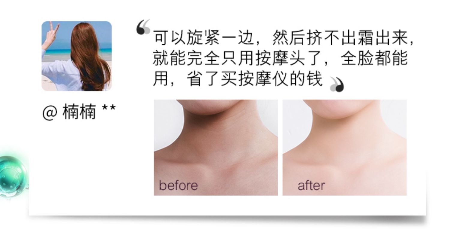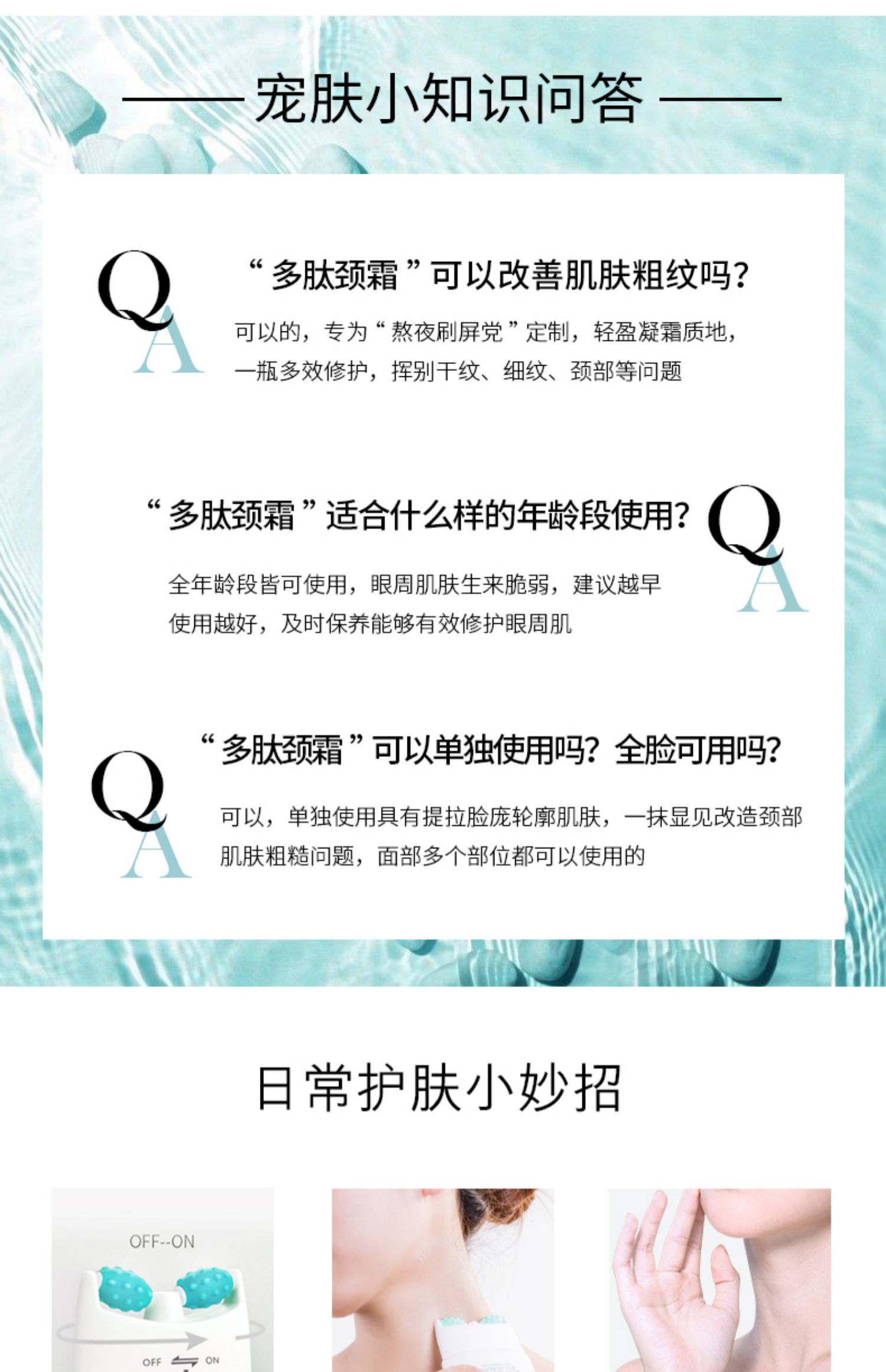 常年只做面部护肤?忽略了颈部的护理?颈纹遍布不敢不想出街?创新V型双滚轮美颈霜,还你天鹅颈!56个硅胶触点,诺比尔多肽成分,全脸可用!还有瘦脸效果,省掉买瘦脸仪器的钱!