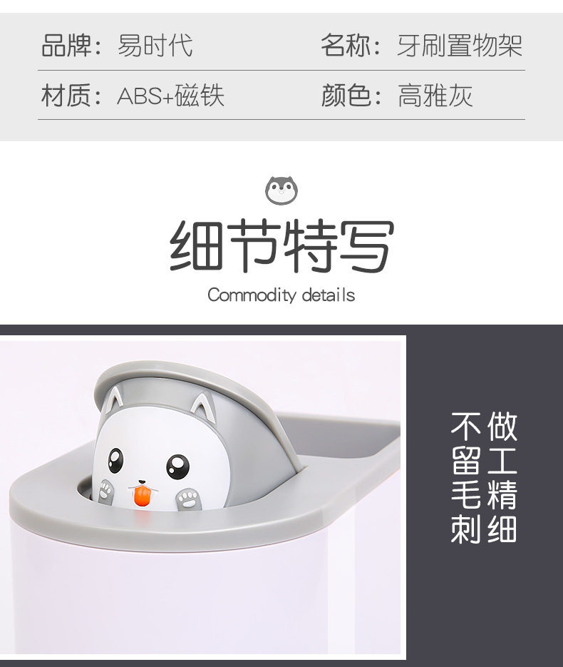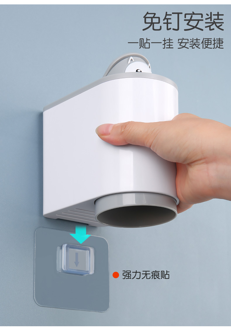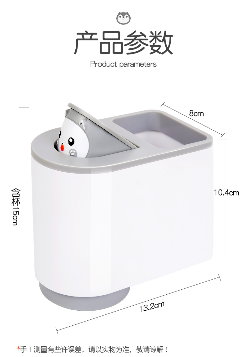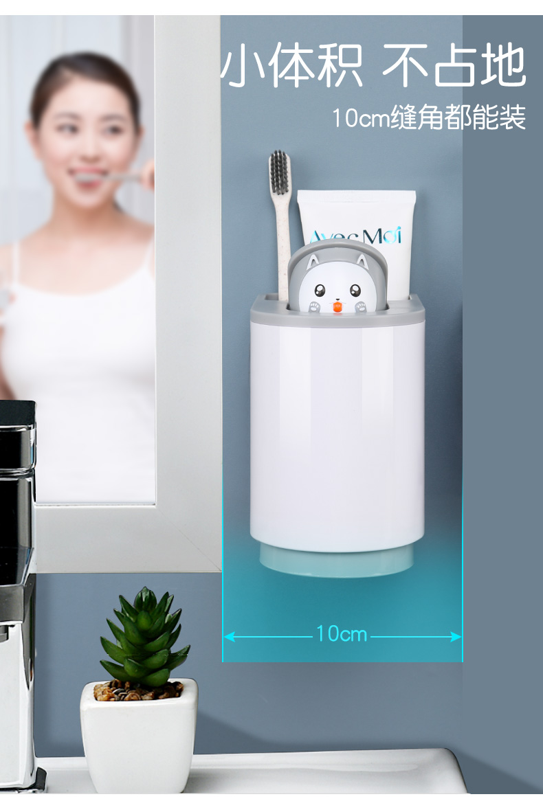 简约小猫萌系设计,样子颜值爆表,免钉安装,一贴一挂超省心,杯架+漱口杯+牙刷套装。磁力吸附,体积小不占地,通气沥水,干净卫生不生细菌~开启你清晨的刷牙时光,你会爱上这个小“东西”的~