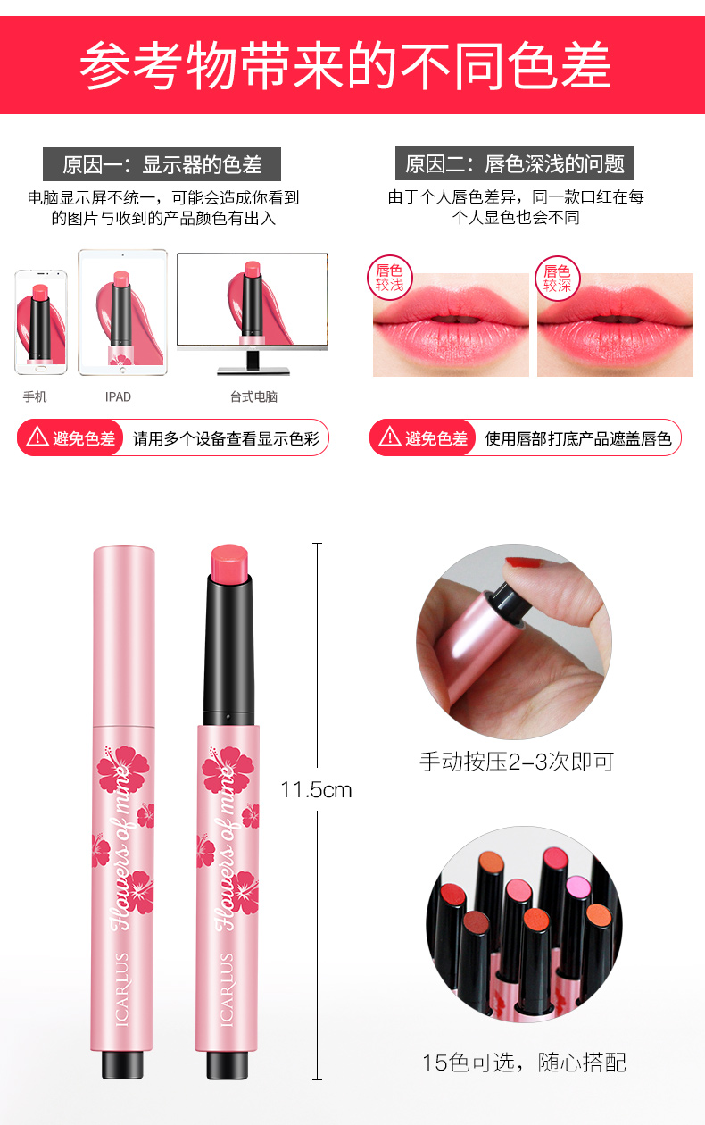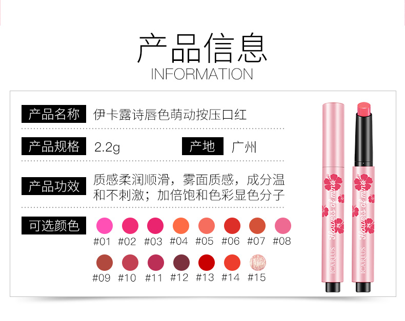 欧洲著名品牌,缤纷15色,植物萃取,色泽饱满,按压口红,持久保湿不易脱色,专柜热卖同款,打造魅力诱惑唇【赠运费险】