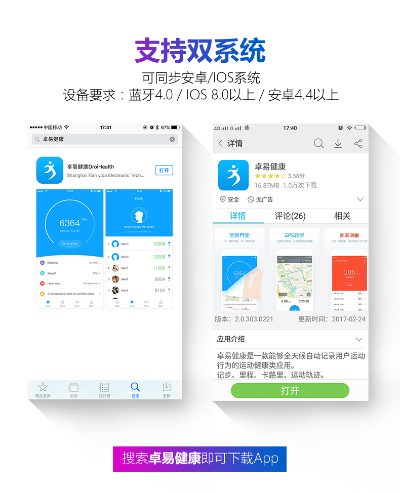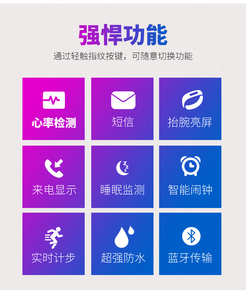 手机来电提醒,消息实时推送,抬手自动亮屏,运动计步,测血压测心率,睡眠监测,智能闹钟,IP67游泳级防水,超长待机续航,多色可选,男女通用