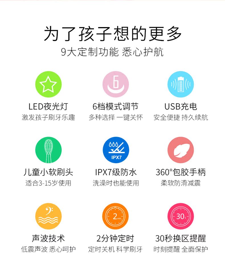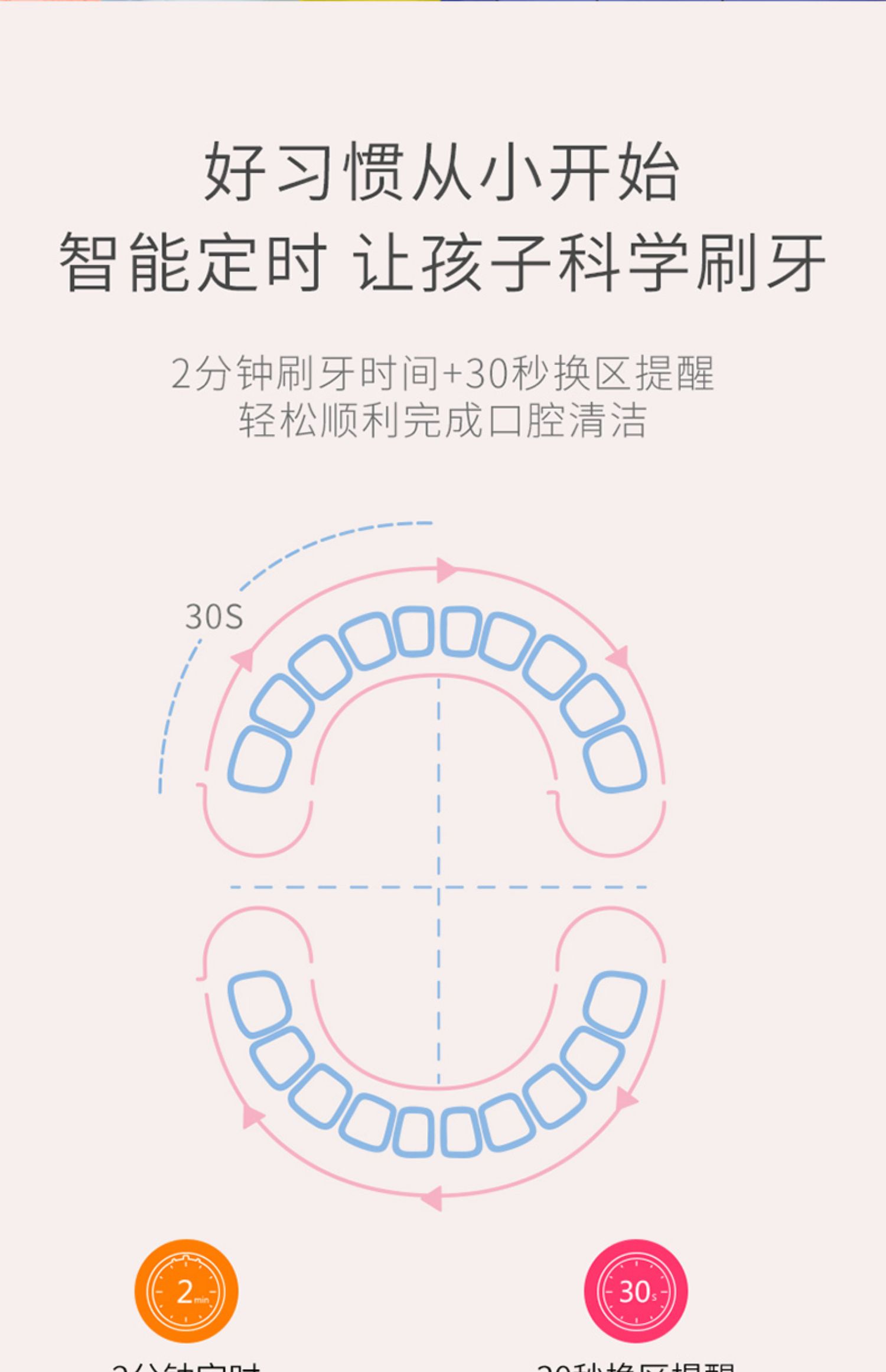 【充电款+7级防水+6档位调节】3-15岁儿童自己的电动牙刷。一键夜光按钮,搭载六档可切换刷牙模式,细腻柔软的刷毛,给宝宝呵护同时更能深入清洁牙齿。轻松让孩子养成主动刷牙的好习惯!