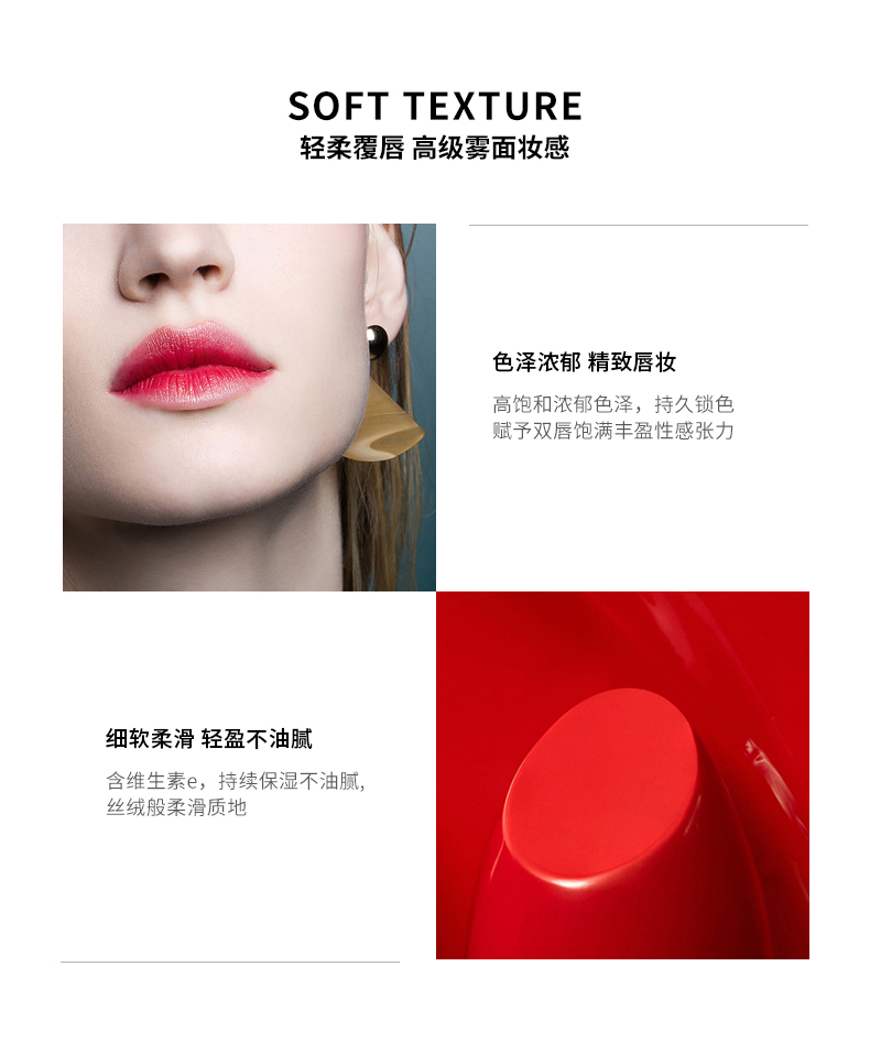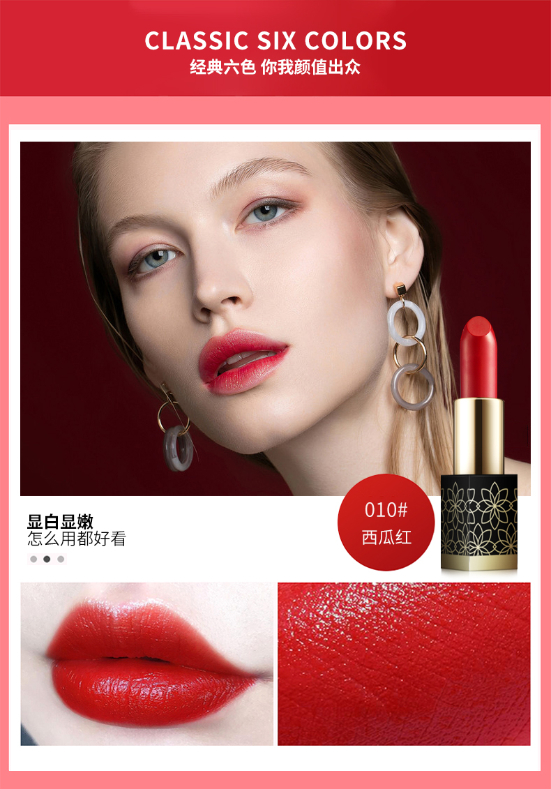 色泽浓郁,精致唇妆,细软柔滑,轻盈不油腻,防水防汗不脱色不易沾杯,诱惑六色,总有一款适合你的~