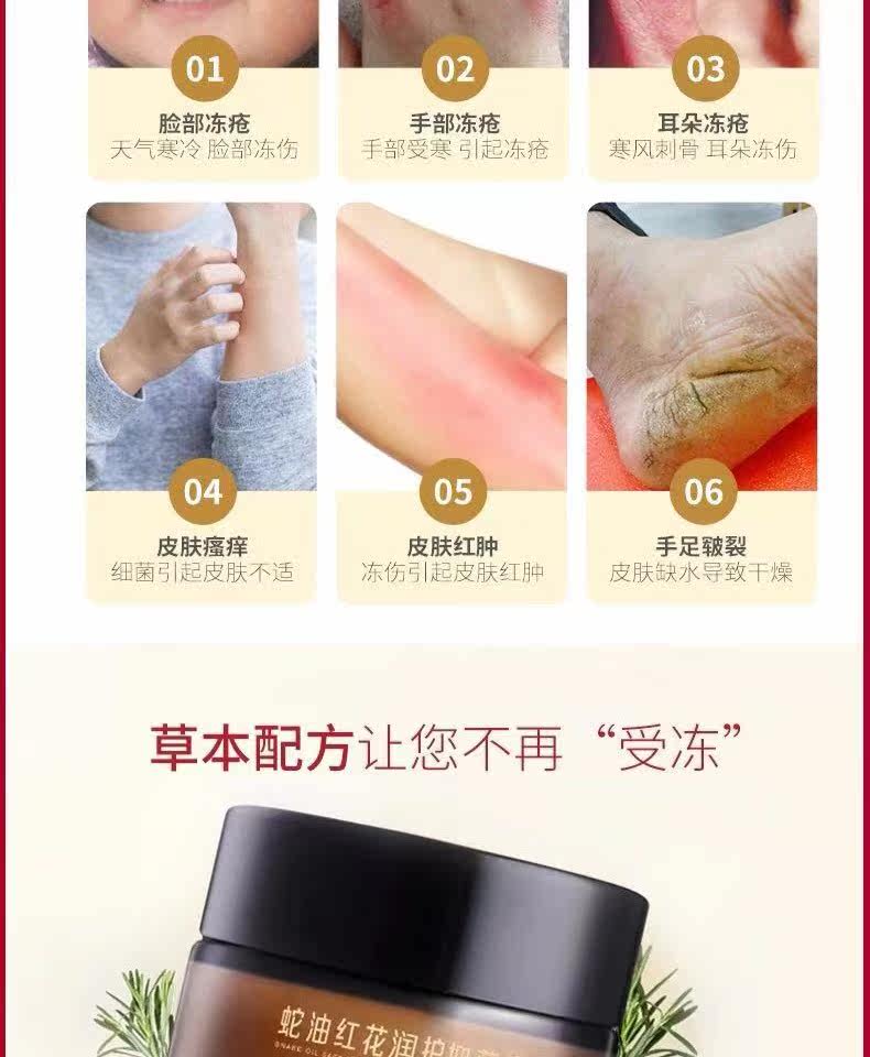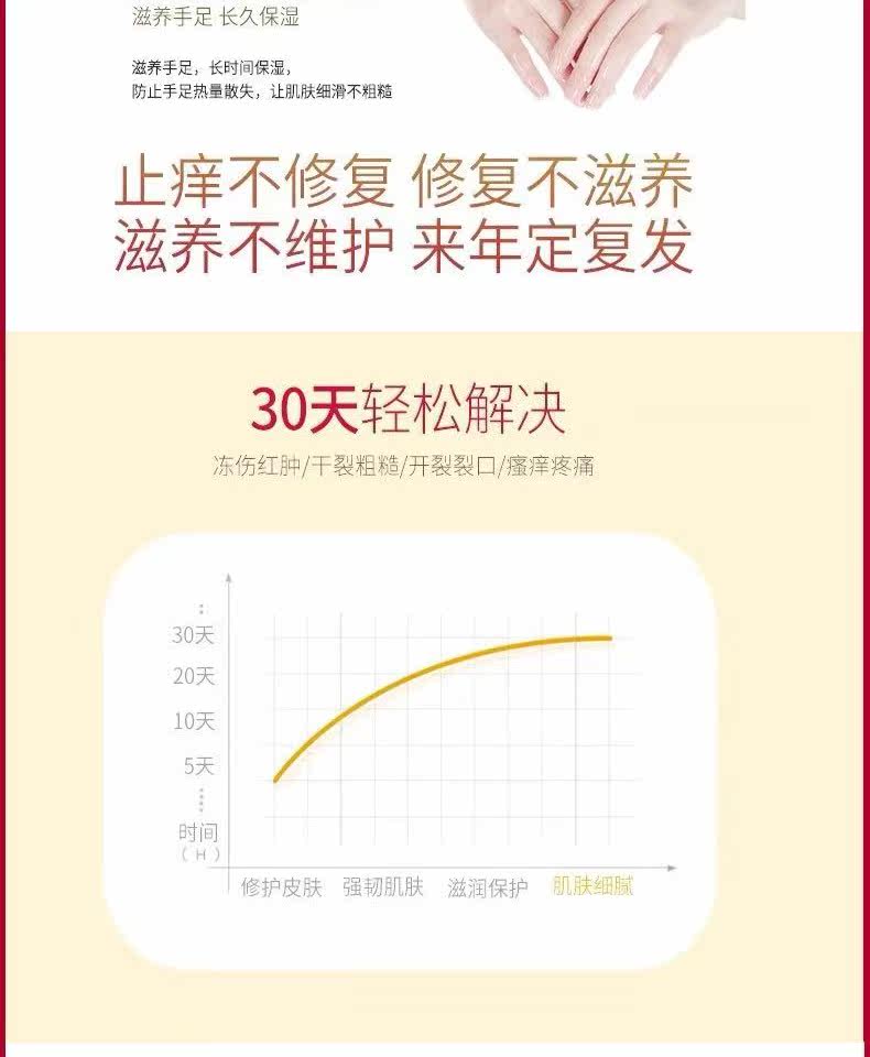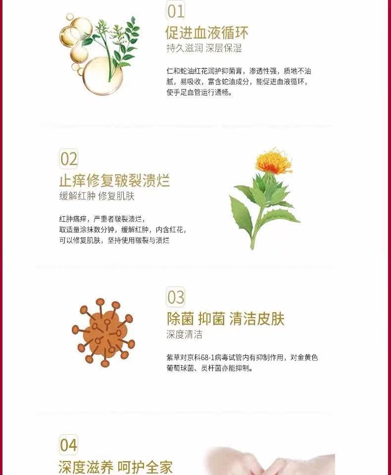 精选天然植取精华,草本配方,保湿不油腻,无刺激,更容易吸收,有效增强肌肤活力,舒缓冬天开裂症状,手脚干裂、冻疮,全部搞定!关爱家人呵护手足~