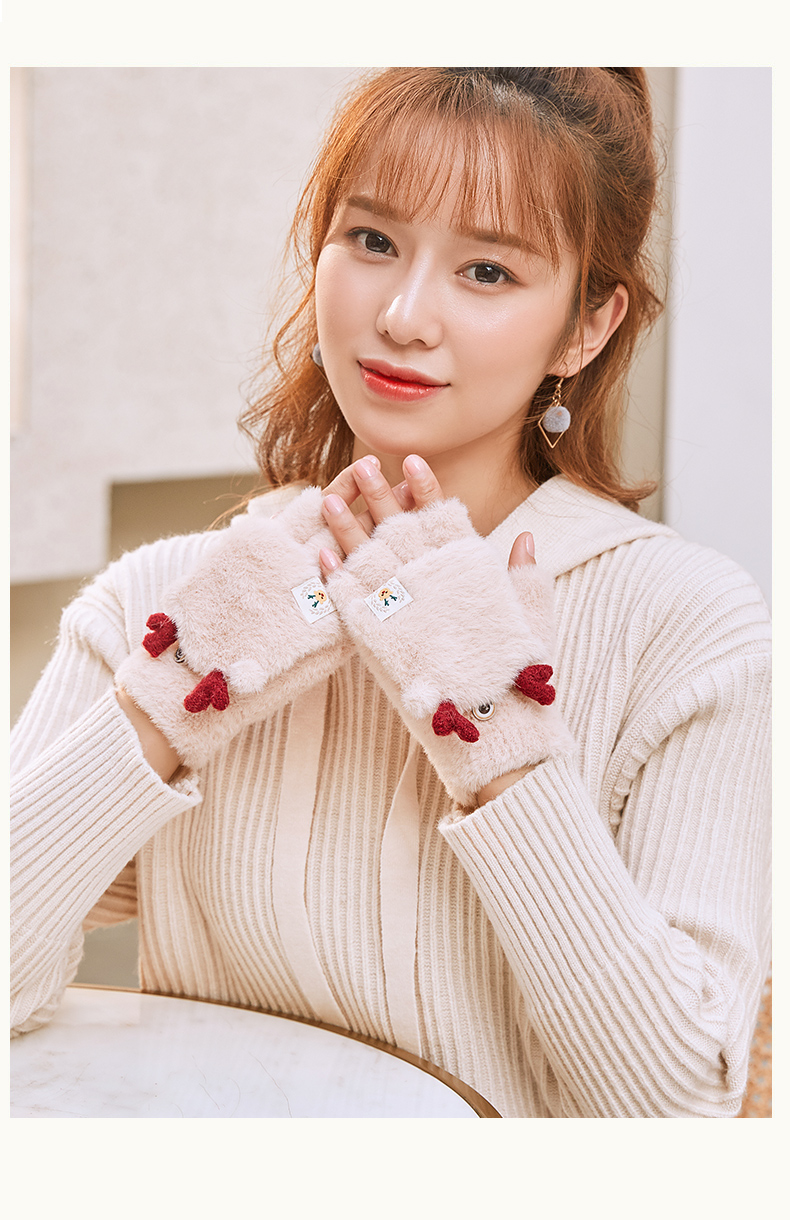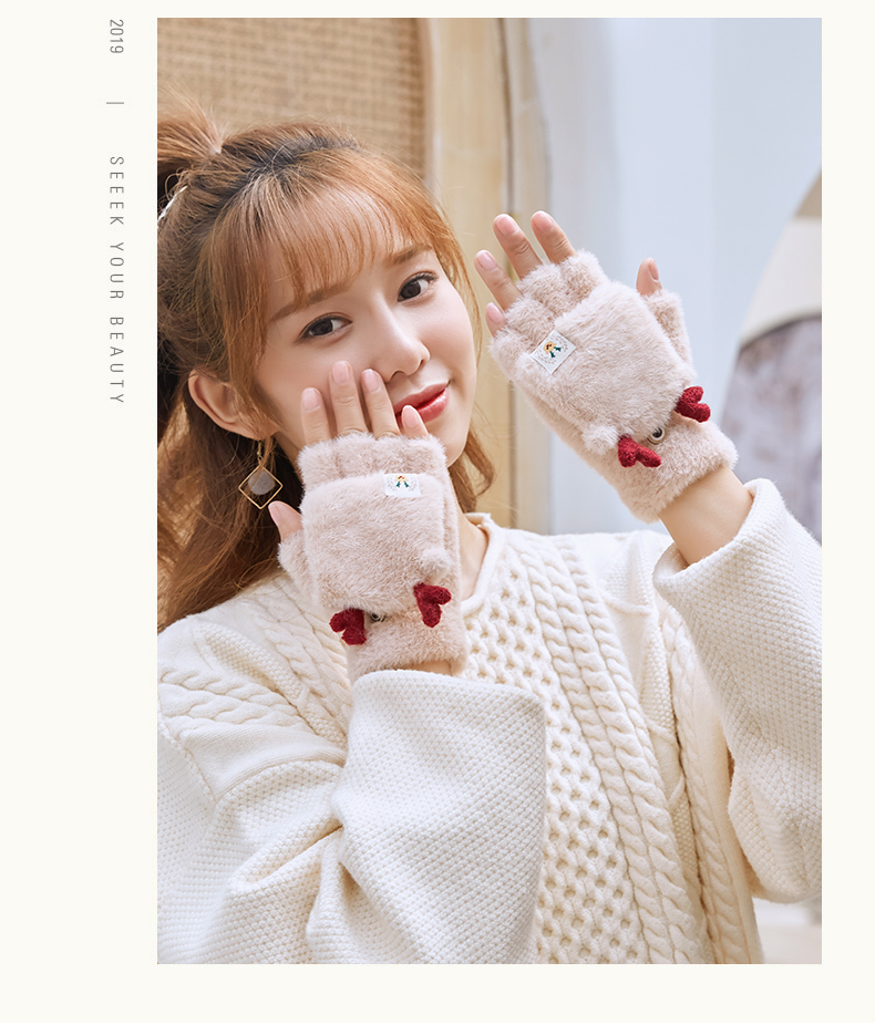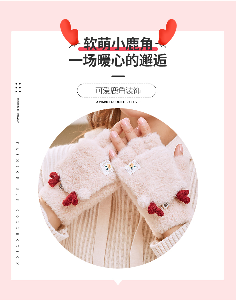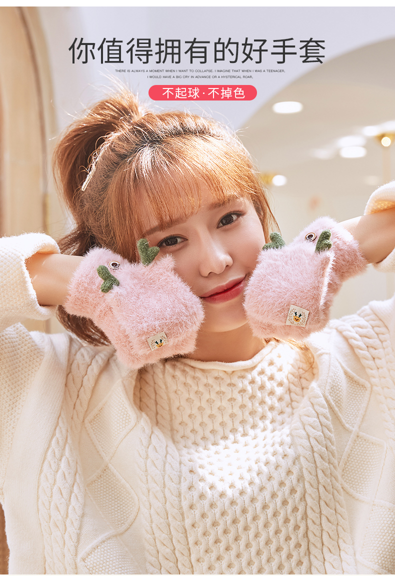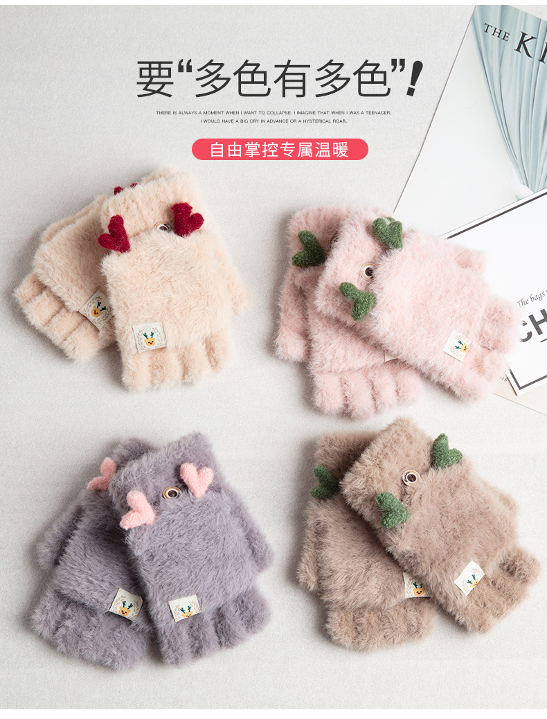 可爱鹿角装饰,手感柔软,亲肤透气,内里加绒,多色可选,半指写字不打滑,一双毛茸茸的手套温暖您整个冬天!