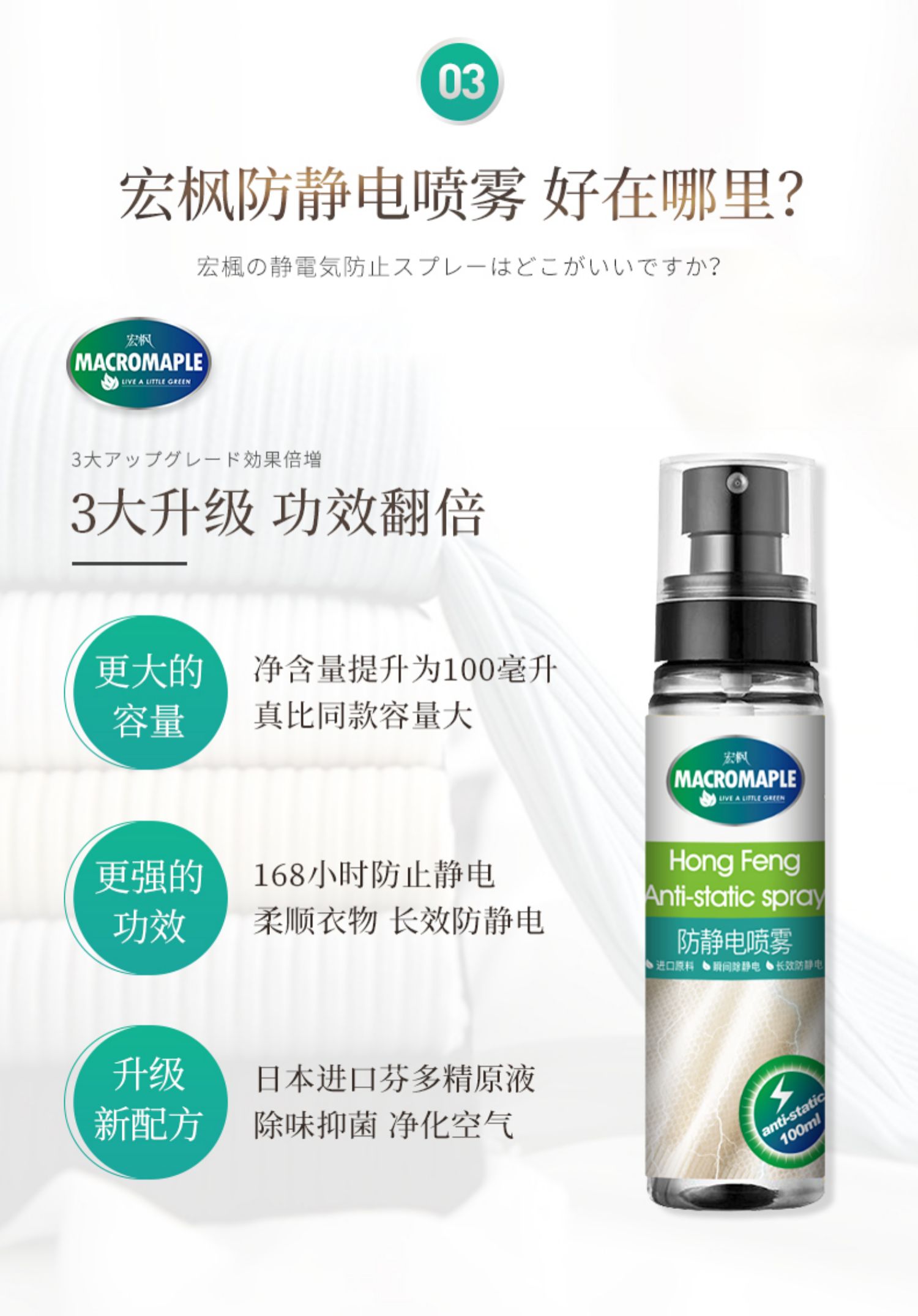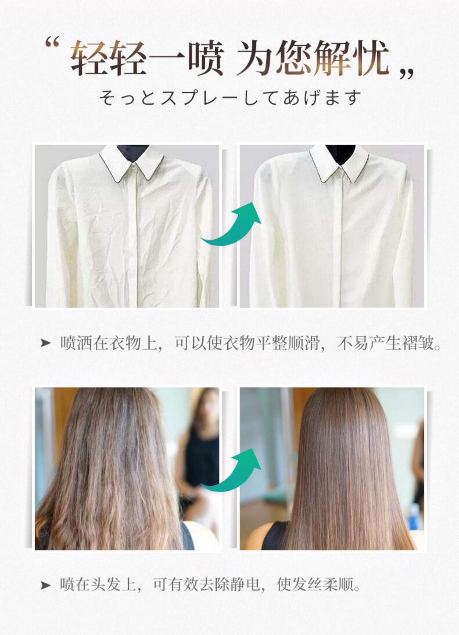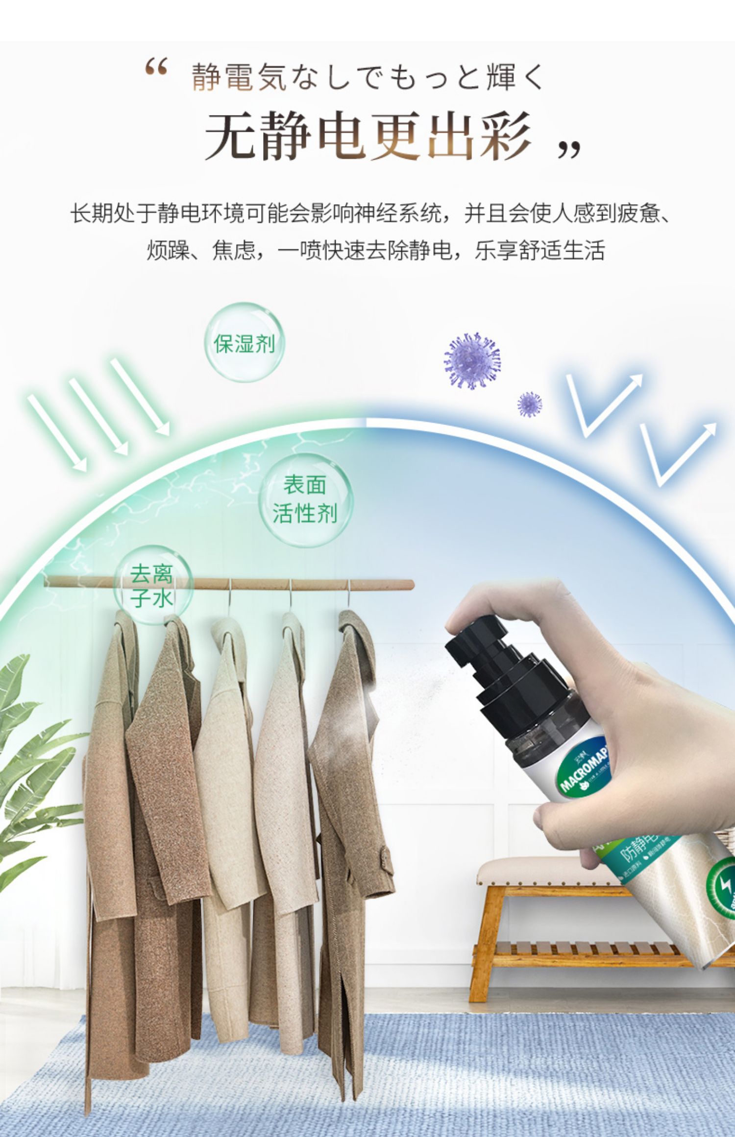 天然植物,方便携带,随身喷!快速消除静电,喷一喷,瞬间见效,持久性强,让各种纺织品、金属、头发等免除静电干扰!