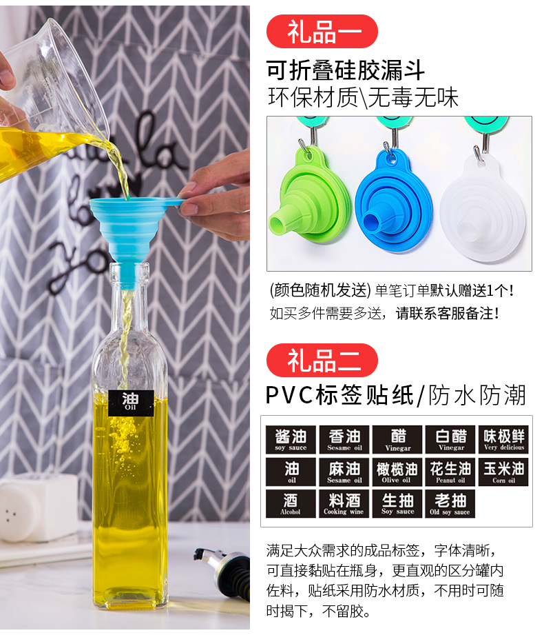 【超低价,500ml大容量那种!送标签!】超市一个起码10元以上!破损免费补发、无铅玻璃、无毒无害~油、酱、醋、蜂蜜,装啥都行,按压式的油嘴,轻松开盖,不滴油、不挂油,看着就高大上的感觉!