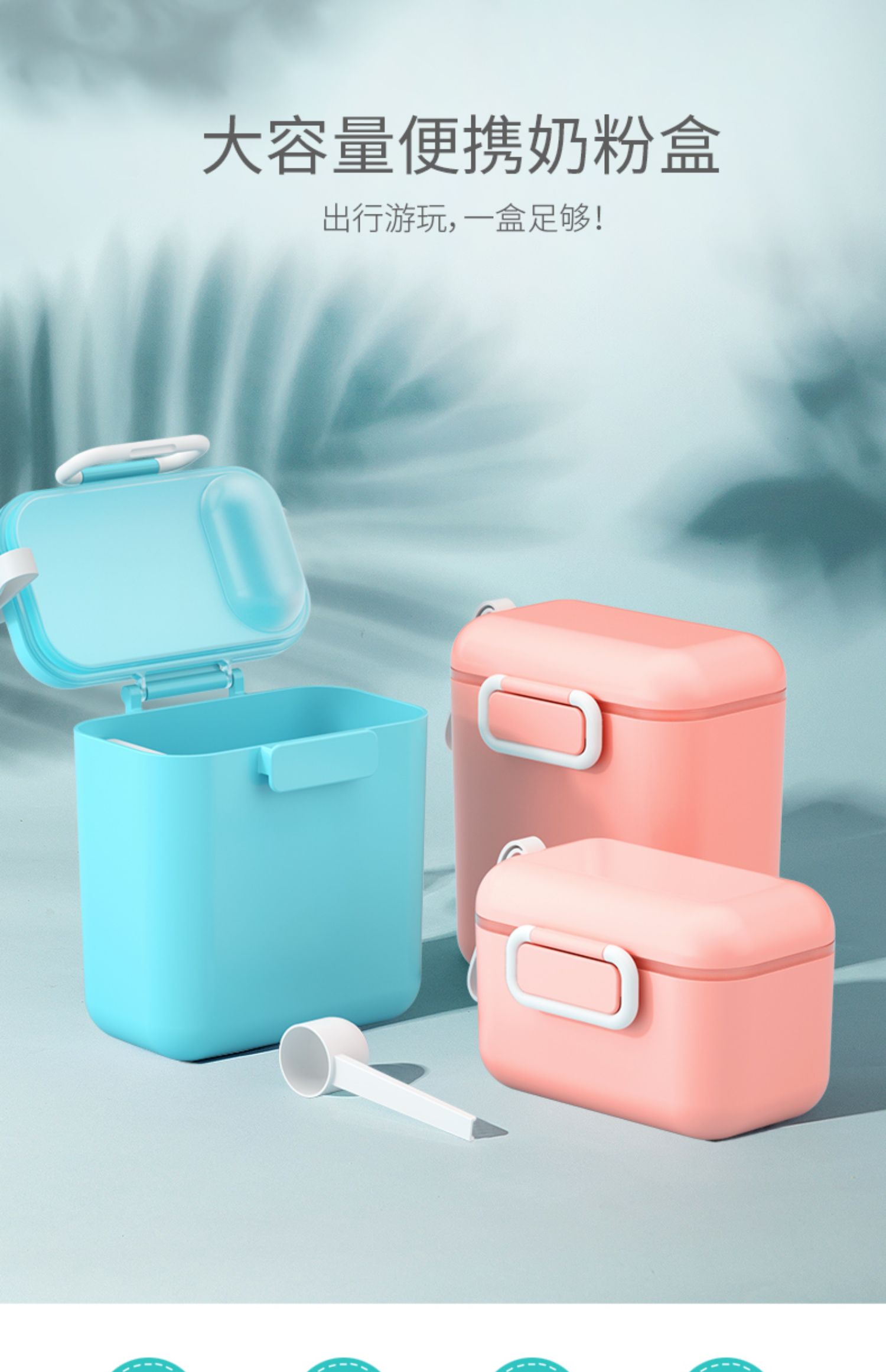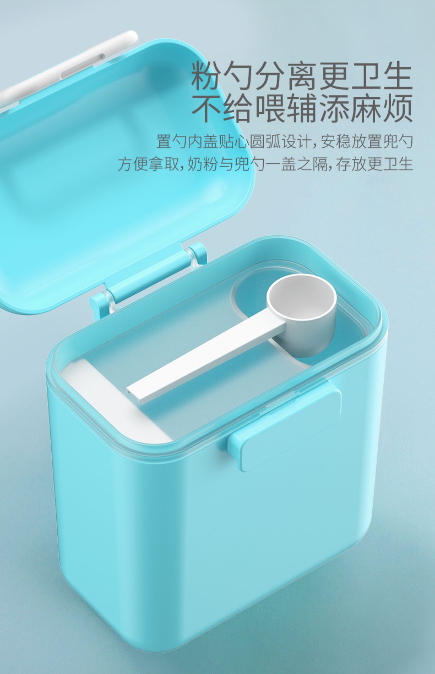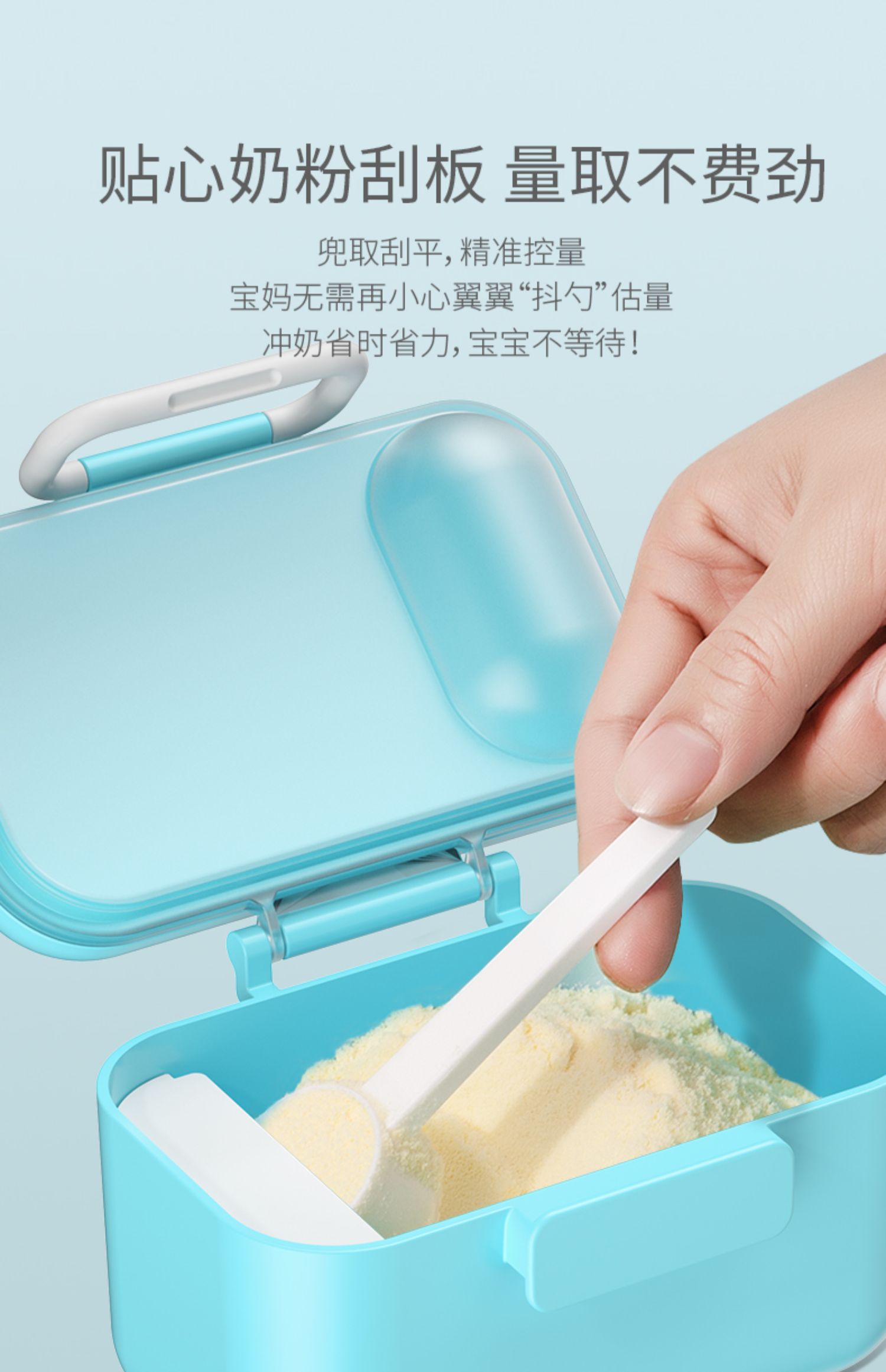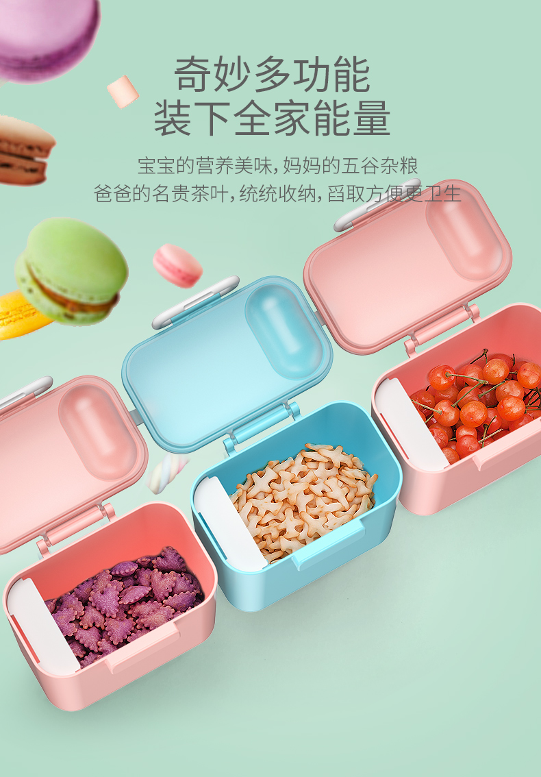 食品PP材质,不含BPA,存放奶粉更放心!内设贴心奶粉刮板,兜取刮平,精准控量,冲奶省时省力!