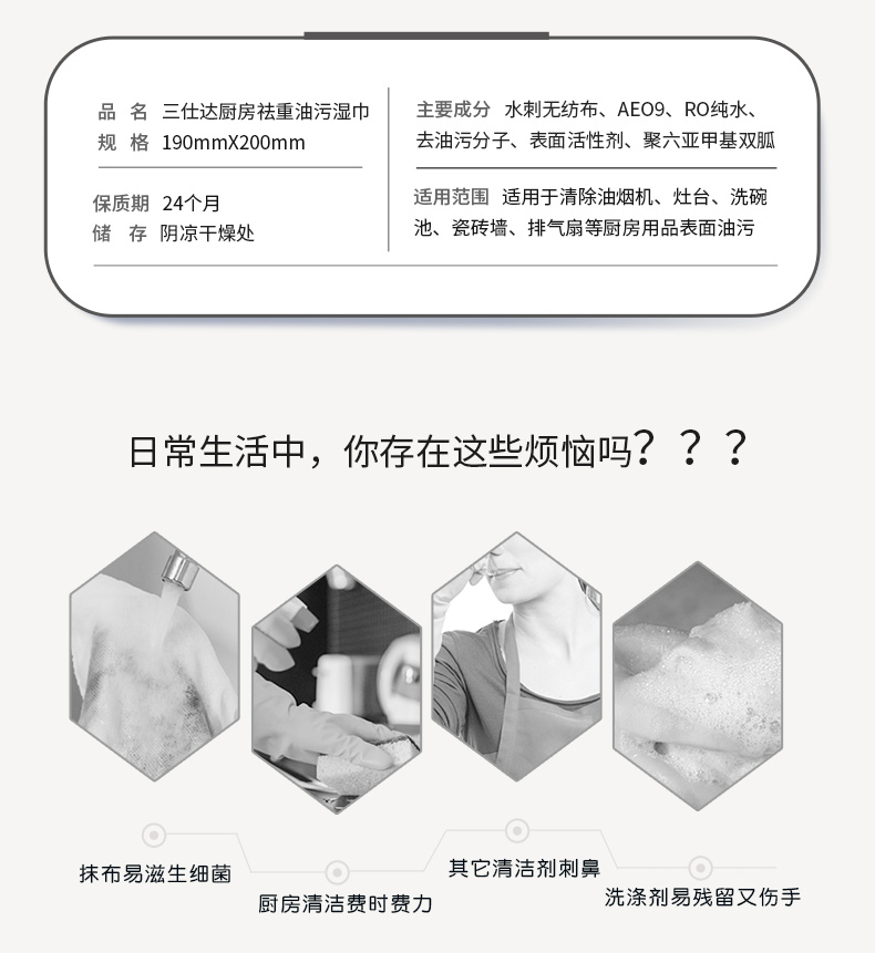 三仕达厨房湿巾厨用去重油污湿纸巾,去油去污擦吸油烟机,柔软厚实更像一包毛巾,不掉毛不掉絮,优质长绒棉,柔韧细腻,吸水性强,干湿两用,去污卫生,安全无刺激~