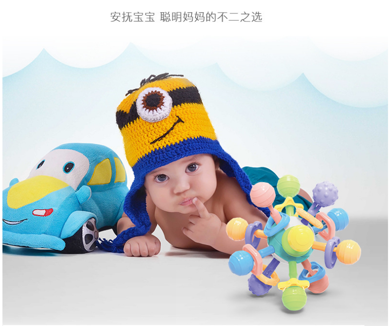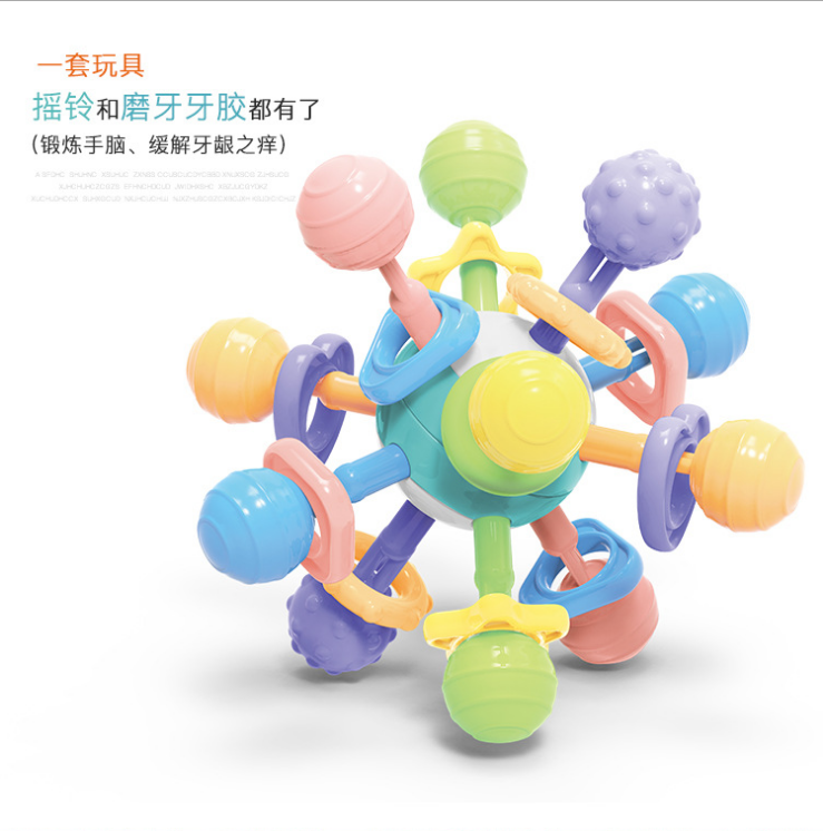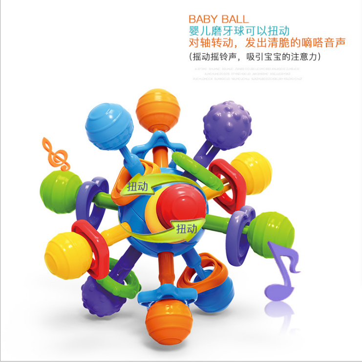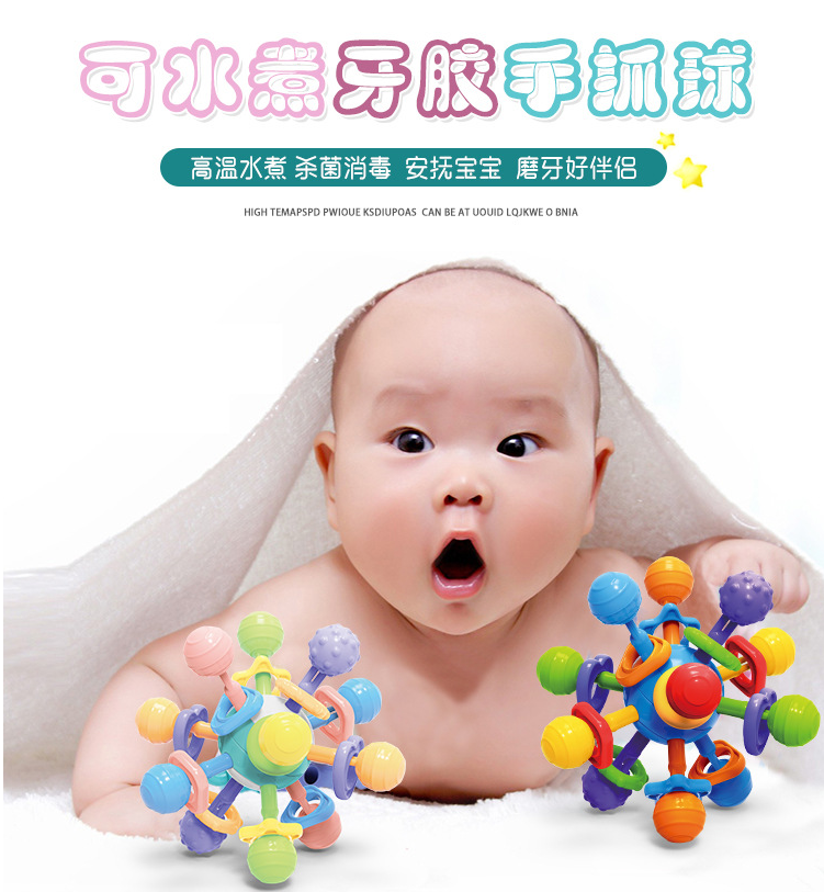 可水煮、牙咬手抓球,安抚宝宝,磨牙好伴侣,舒适牙胶摩擦牙床,缓解宝宝长牙期疼痛,对轴转动发出清脆响声,斑斓色彩吸引宝宝,锻炼手脑,开发宝宝视觉听觉,宝妈的放心之选!