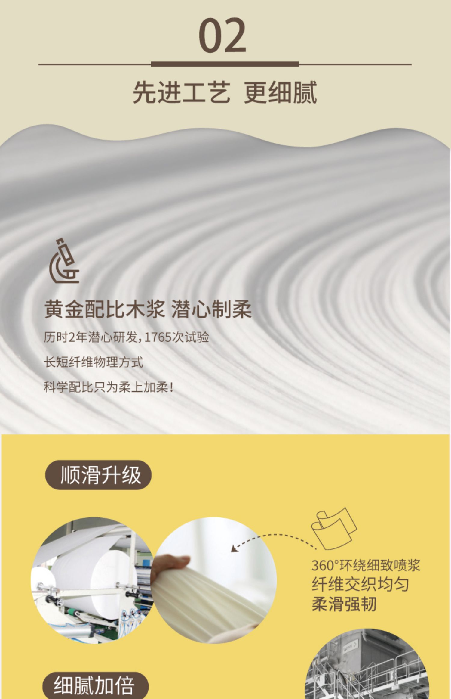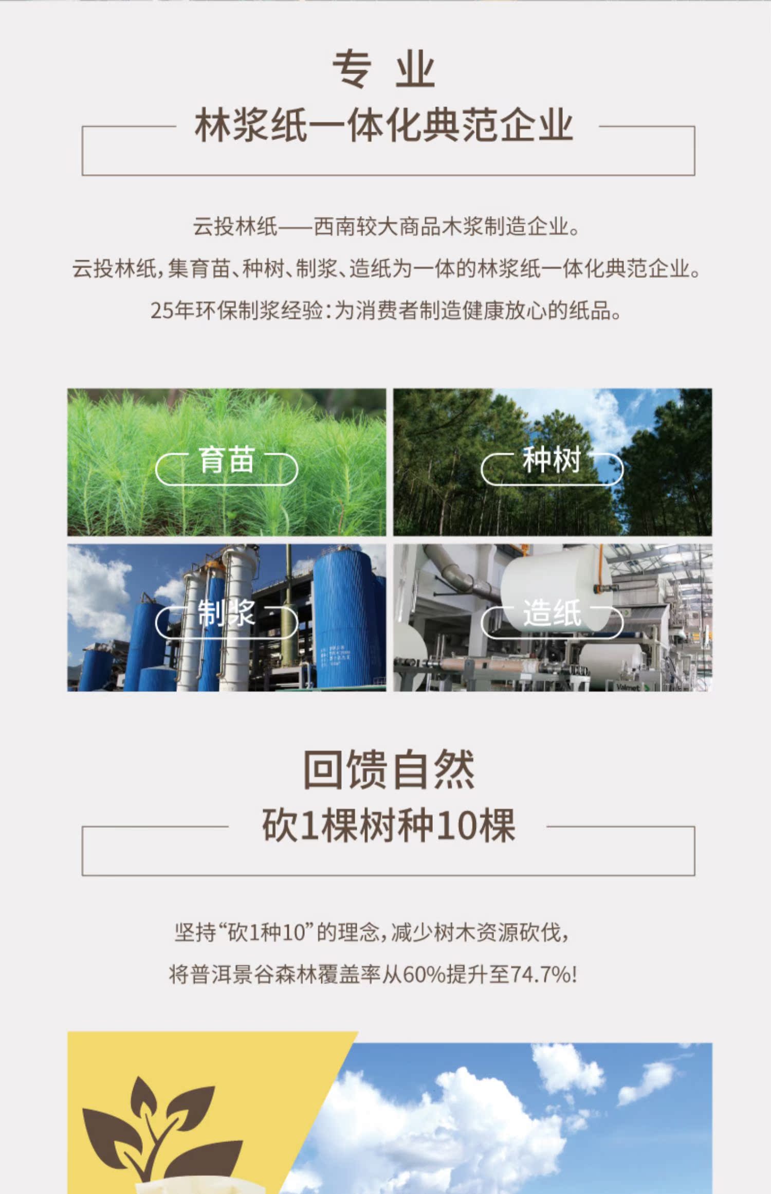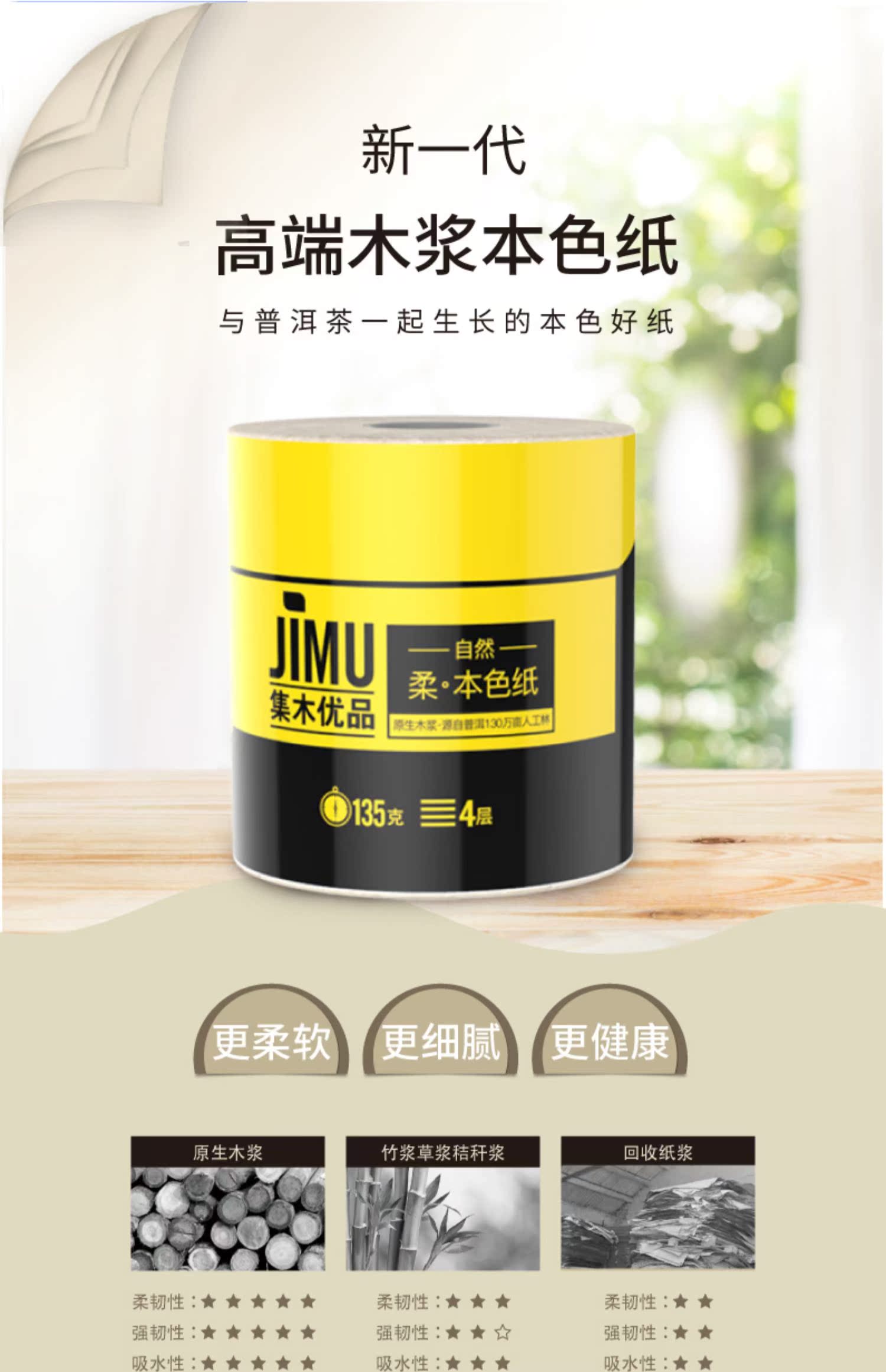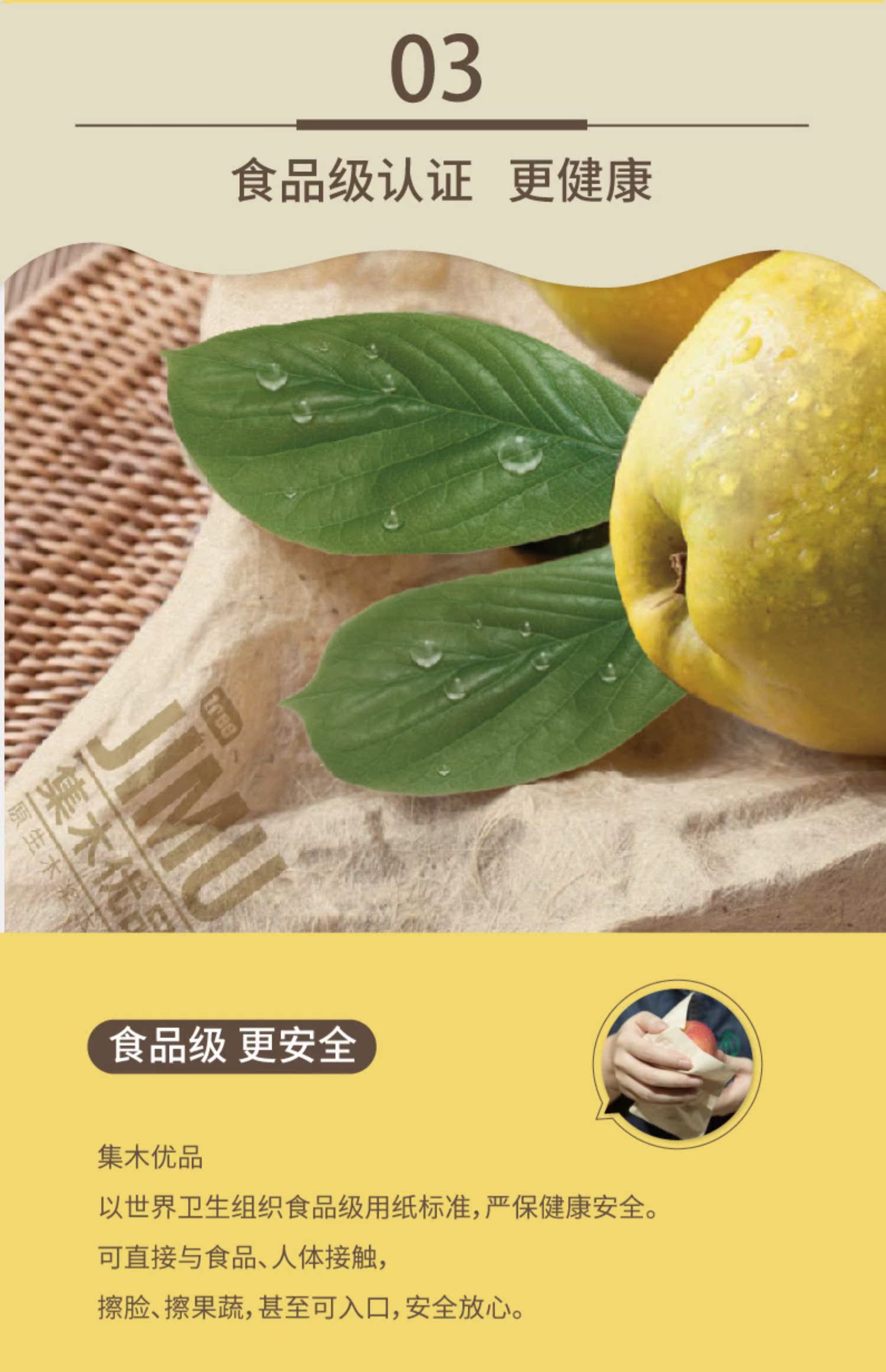 臻选原生湿木浆,纸张洁净亲柔,不添加荧光增白剂,不含二噁英等有害物质,20年专用ECF无氯造纸技术,450℃高温消毒,好产品,源自好原料,专业“纸”为健康,集木呵护您及家人的健康。
