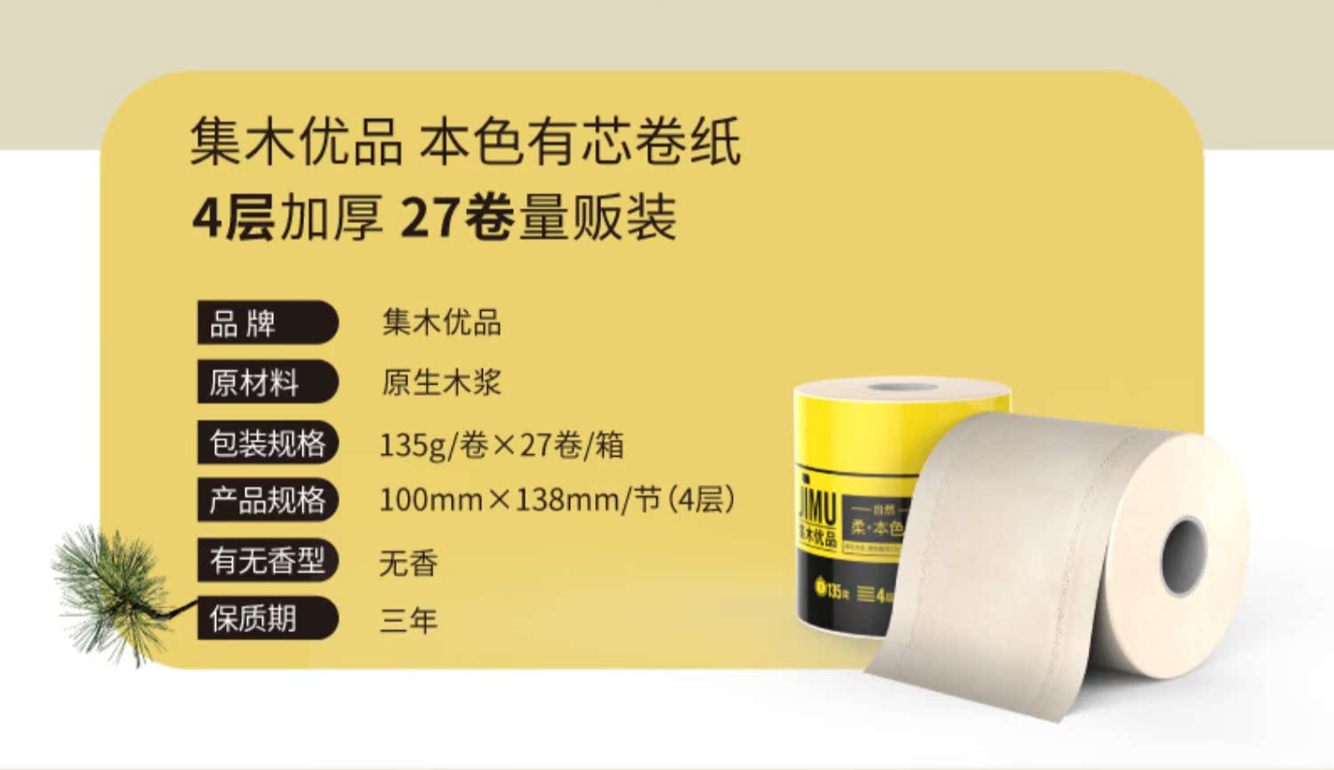 高端木桨本色家用有芯卷纸卫生纸4层27卷