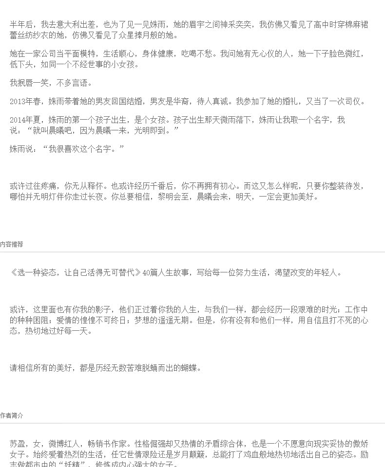 微博红人年度畅销书!《选一种姿态,让自己活得无可替代》,不可不读的女性励志畅销书,每个女生都是天使!有做自己的自由,有敢做自己的胆量,不害怕,不妥协,勇敢的活出自己的精彩,好书精选!