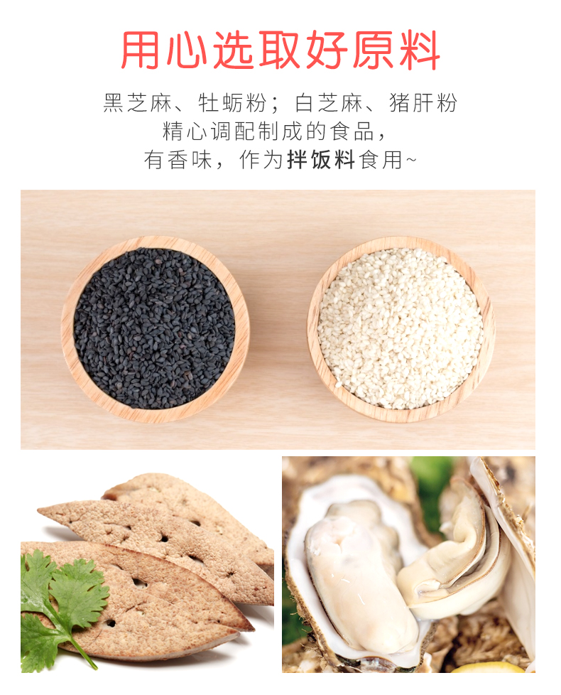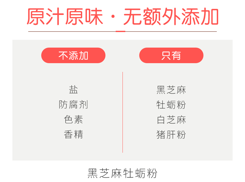 天然选取健康好原料,新鲜牡蛎+黑芝麻,美味又健康,二次粉碎,质地细腻,食用方便,多种口味选择!