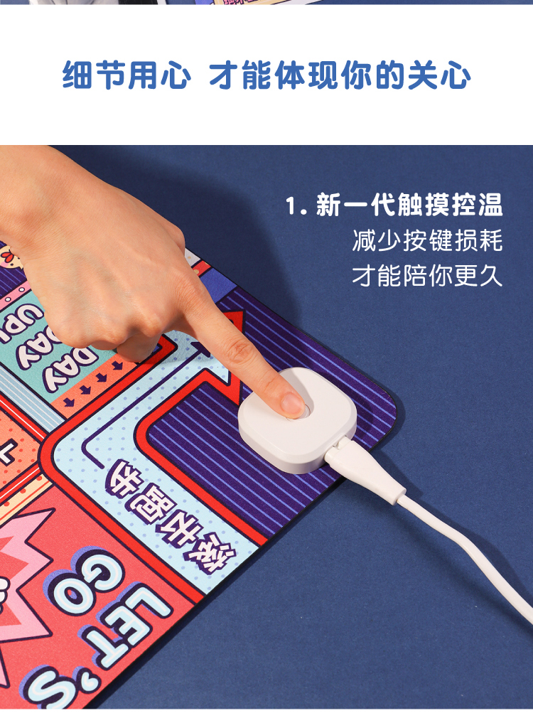 安全电压,恒温速热,过热保护。只能发热膜,人性化智能控温,3挡温度任意调节,优质PU材质,防水亲肤,背面十字纹,防滑耐磨。