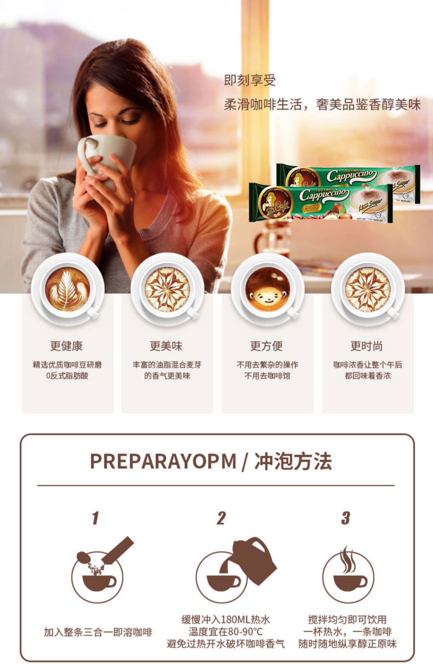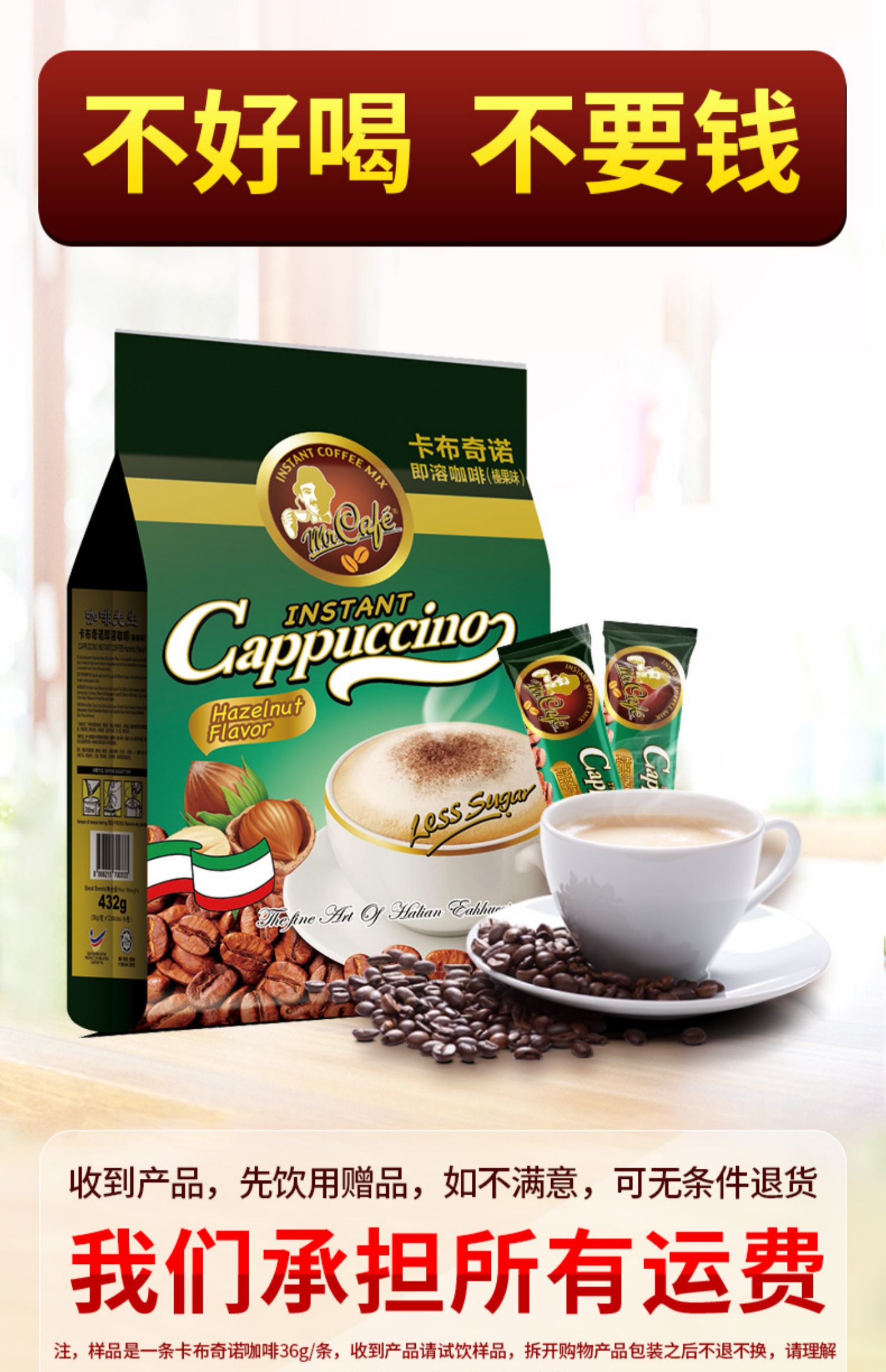 【卡布奇诺】三合一速溶咖啡,送咖啡杯。马来西亚进口咖啡,让你足不出门就可以喝到正宗的马来咖啡,奶泡丰盈,浓郁香醇,丝滑柔和~满足你奋斗所需的能量!特色风味,满足不同需求【赠运费险】