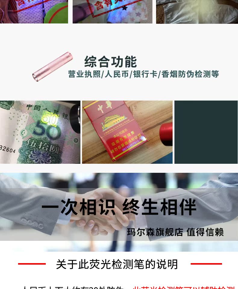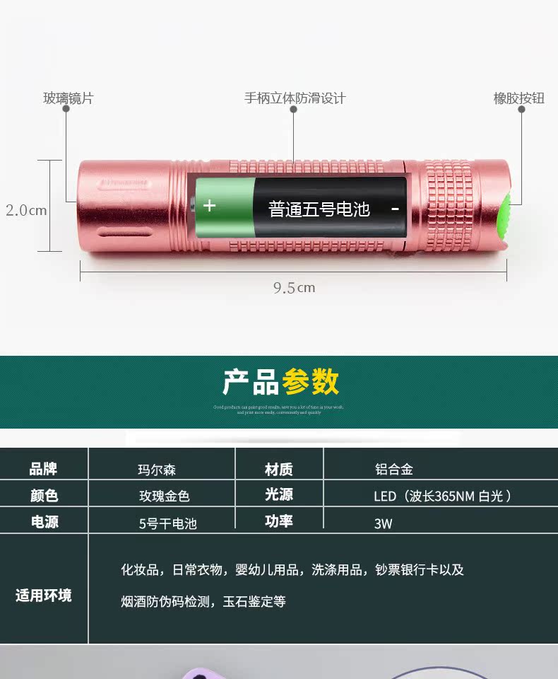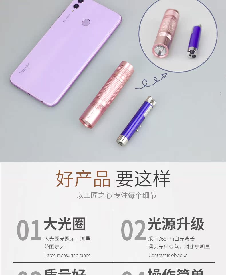 迷你小巧便携,可以用来验钞,照珠宝,当迷你手电筒,还可检验荧光增白剂,适用于面膜、护肤品、母婴用品哦!多功能用途广泛。家中停电应急必备单品~