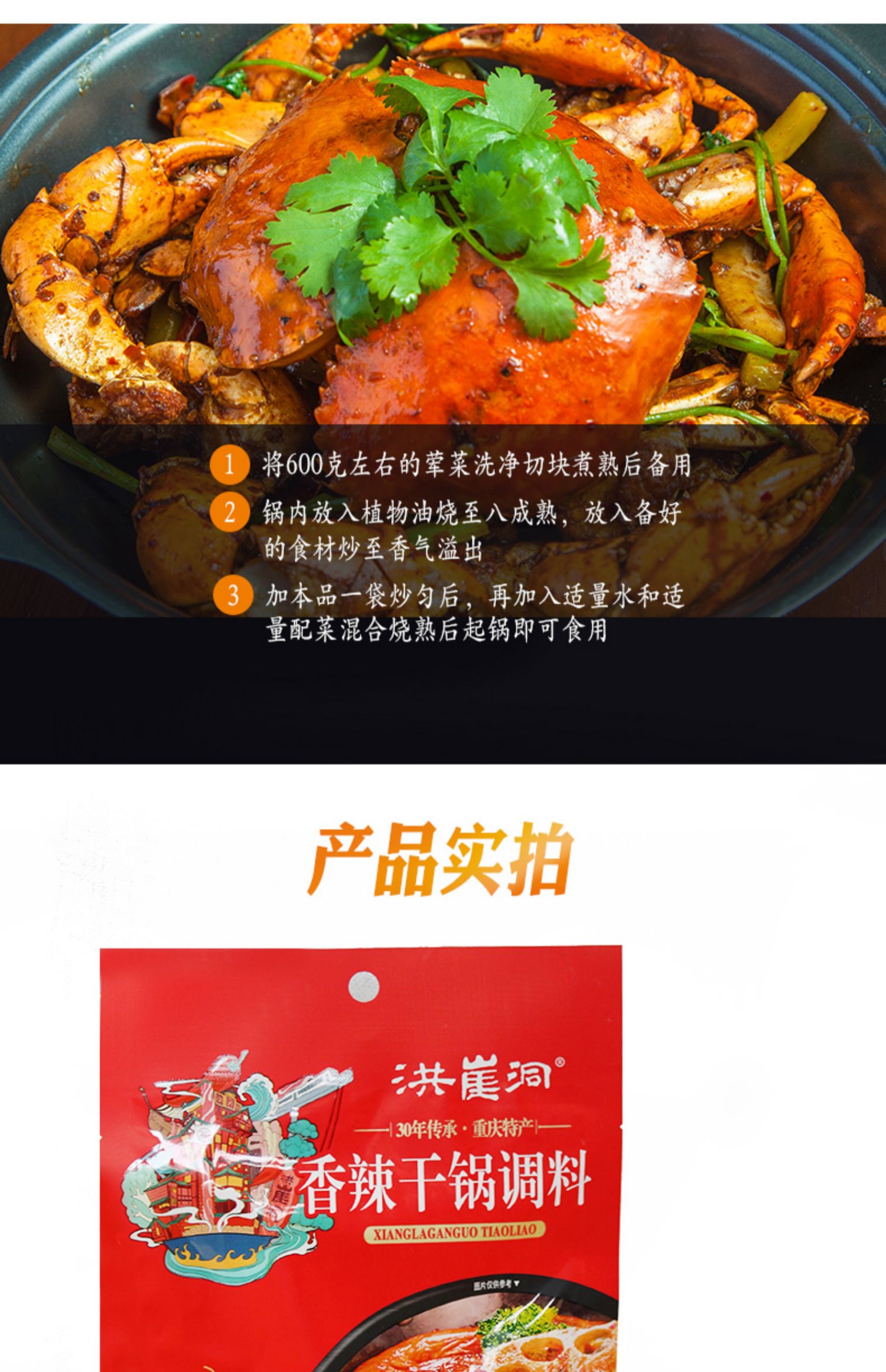 麻辣香锅香辣干锅料,重庆洪崖洞知名调料品牌,商超同品,地道的重庆味,采用优质原料,精心制作而成,香味扑鼻,唇齿留香,看得见的品质,难忘记的味道!