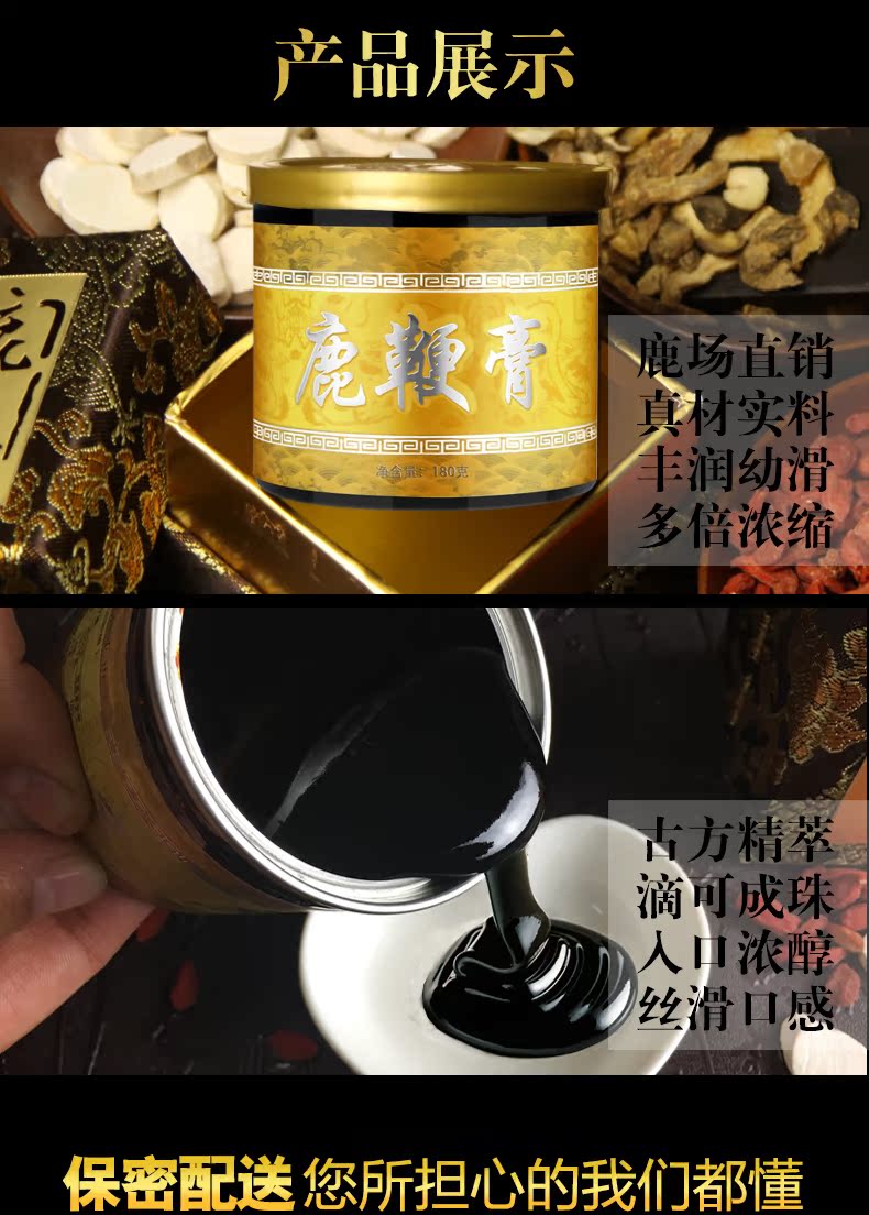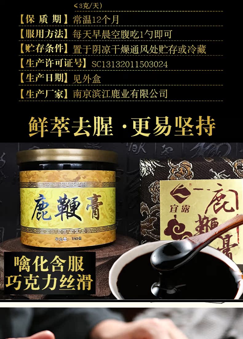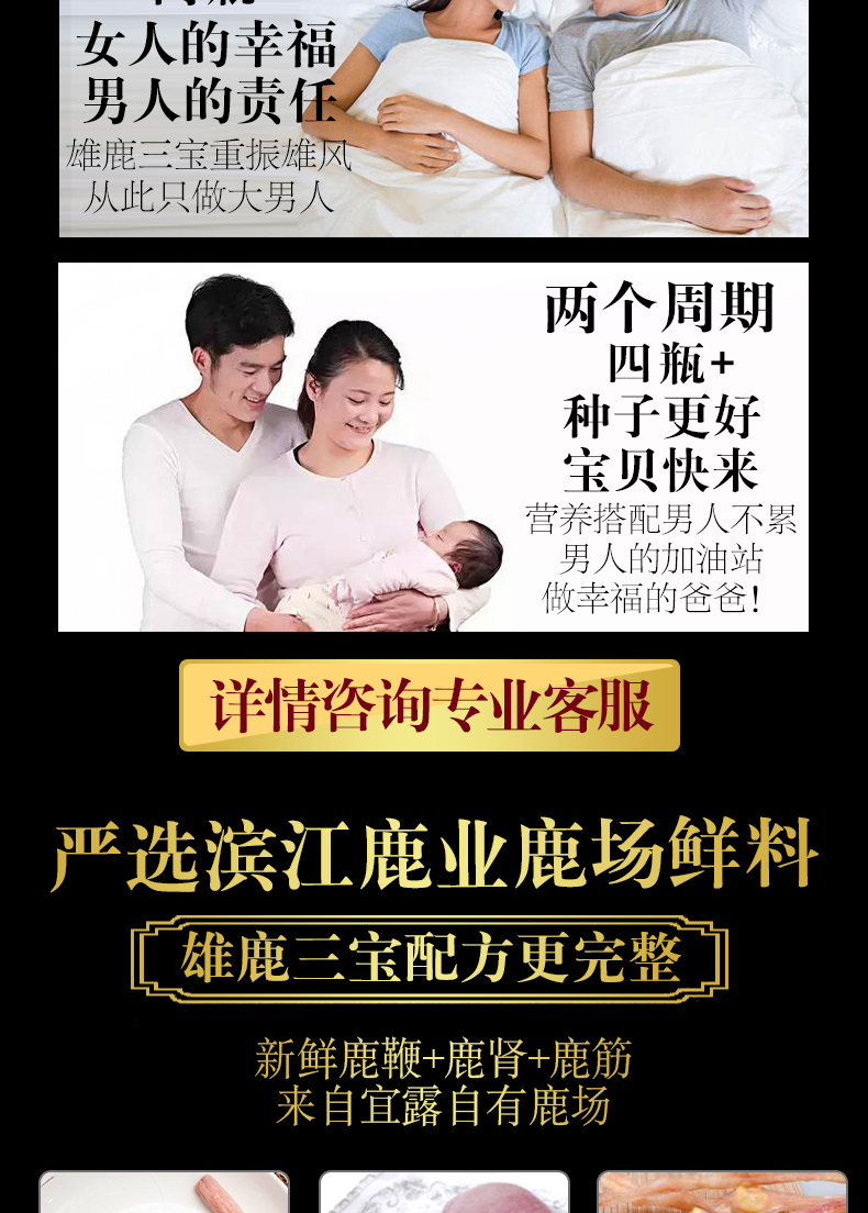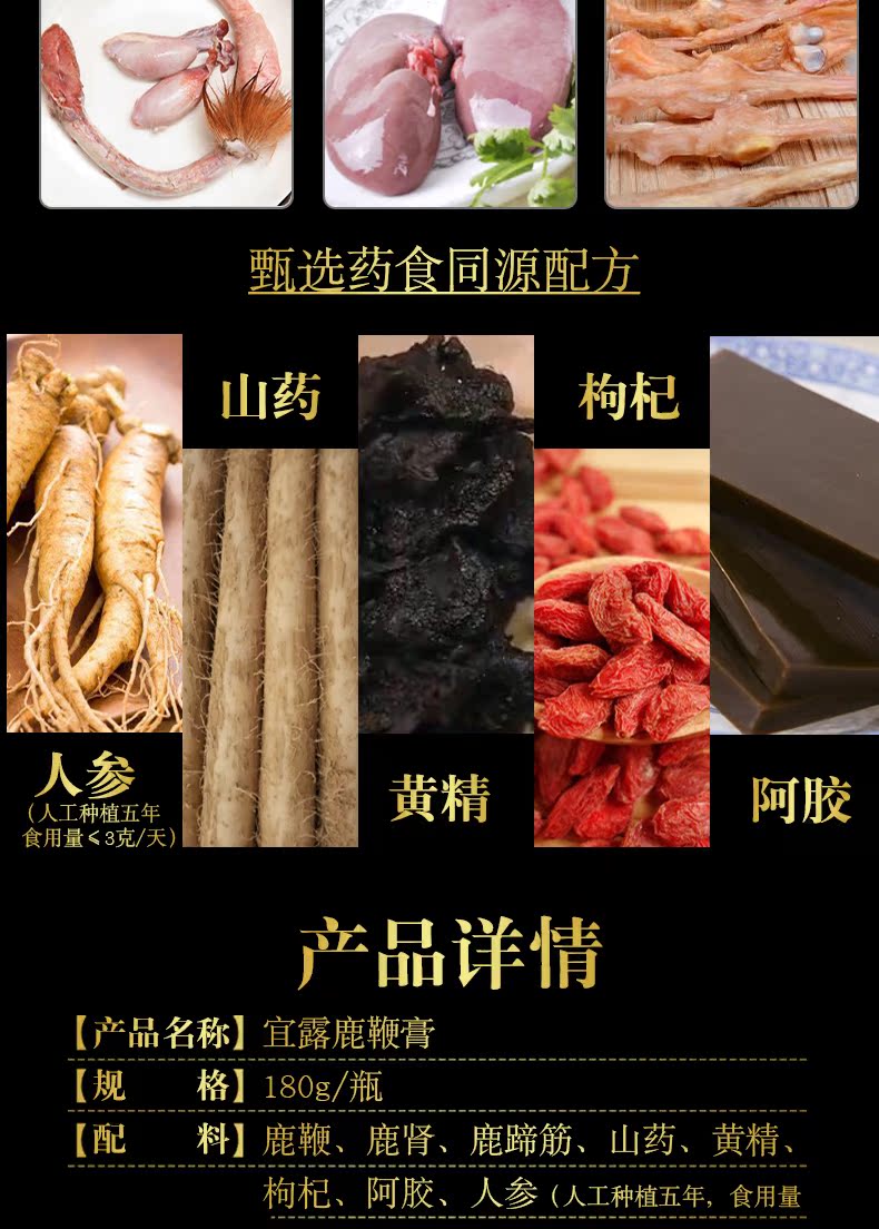 优选雄鹿三宝配方,升级新鲜萃取浓缩不同于其他膏方老牌鹿场直销,鲜鹿鞭保真,坚守鹿场新鲜萃取原料,科学配比,高纯度易吸收冲服都可以一天一勺简单方便从此重振男人雄风只做硬男人!