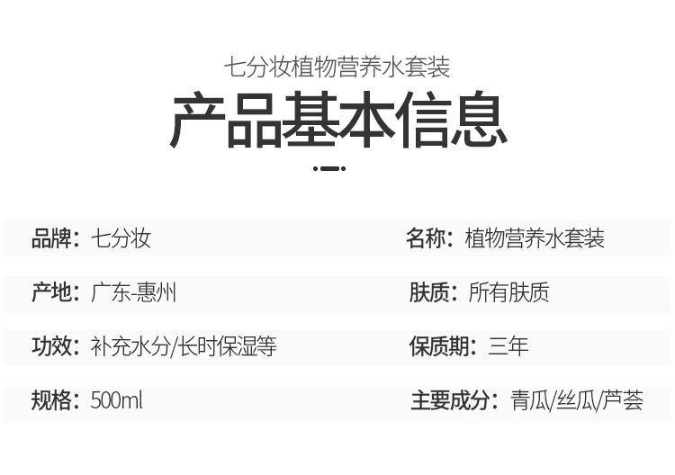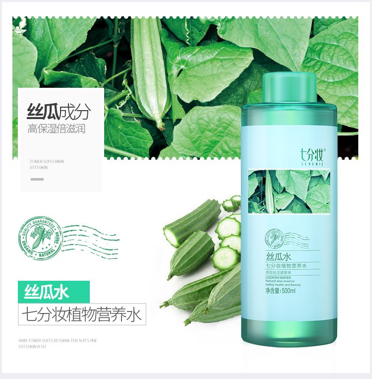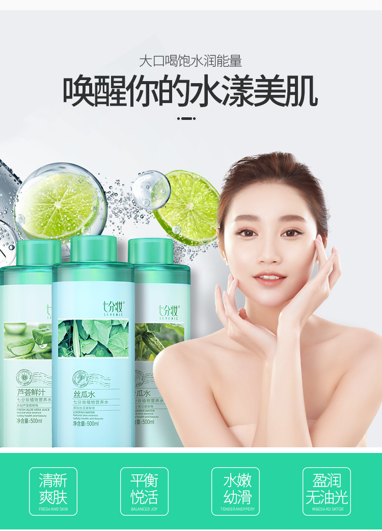 七分妆丝瓜芦荟鲜汁原液柔肤水,补水保湿,收缩毛孔,收敛细致,无暇美肌!原生态植物配方,满满营养植物精华爽肤水,让肌肤水嫩饱满,敏感肌肤孕妇宝宝都能用!