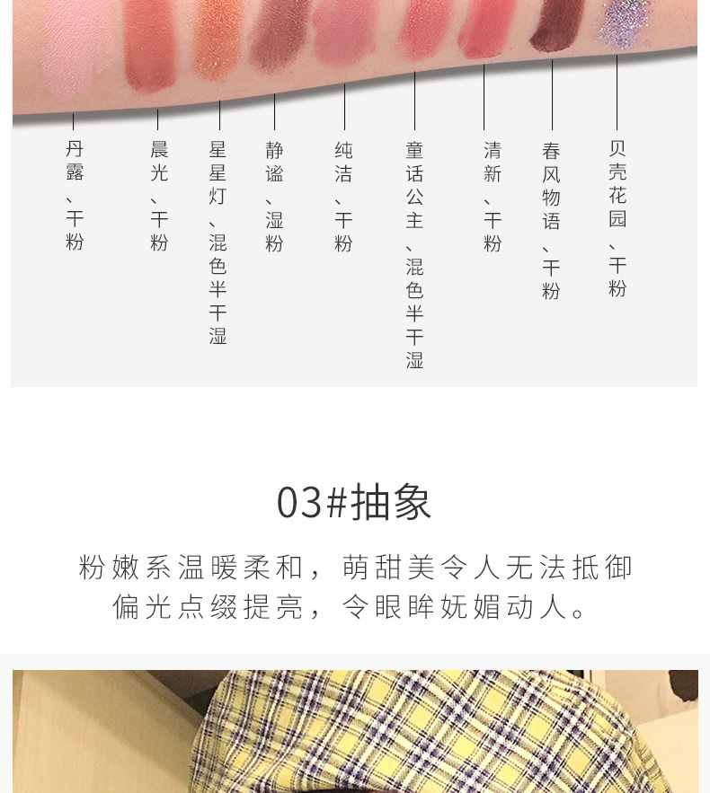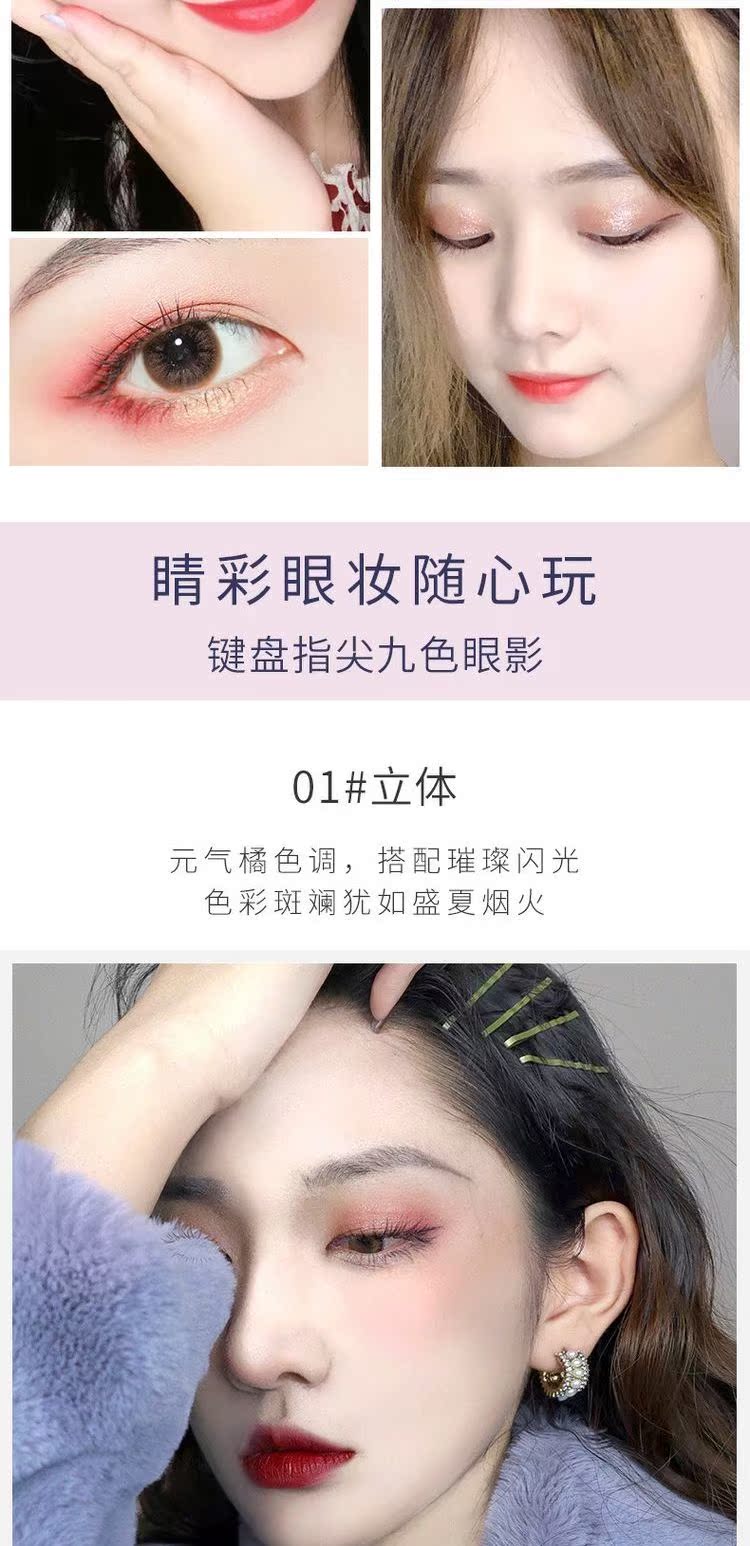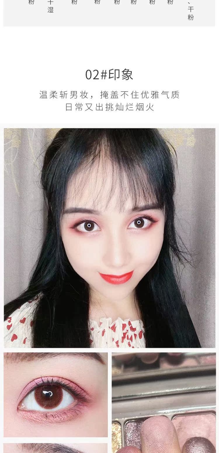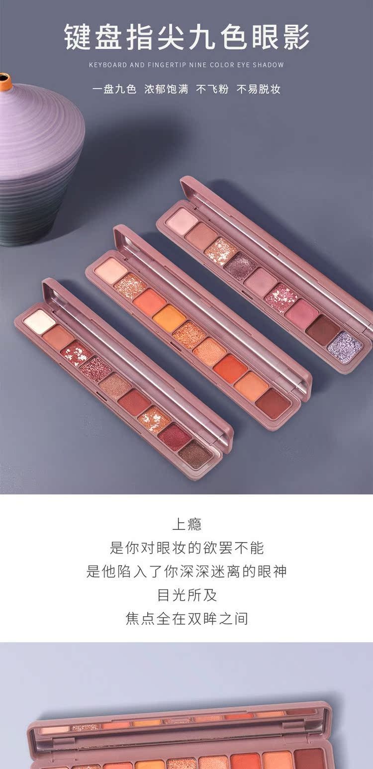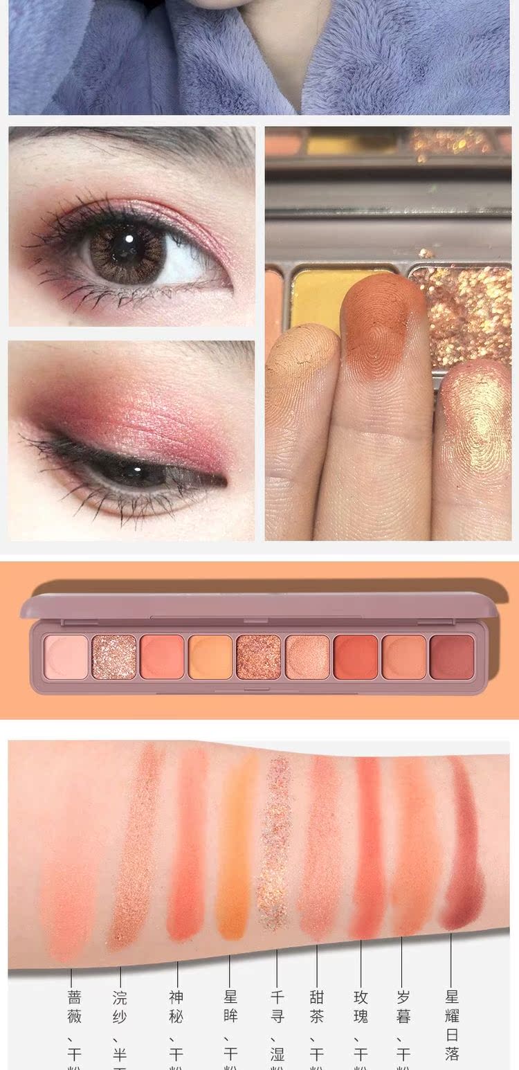 9色眼影盘,四种质地一抹成妆,自然服帖,初学者福音,质地松软细致顺滑,易上色不飞粉,防水不晕染,斩男妆!
