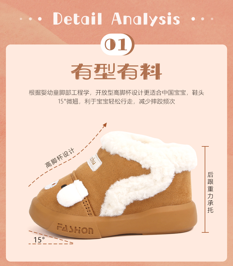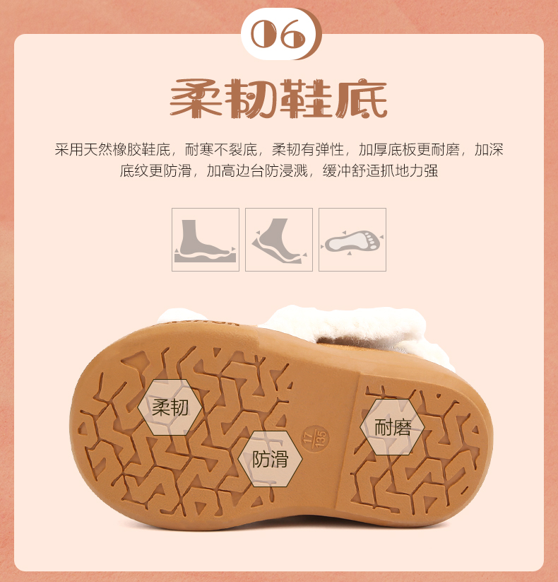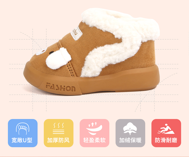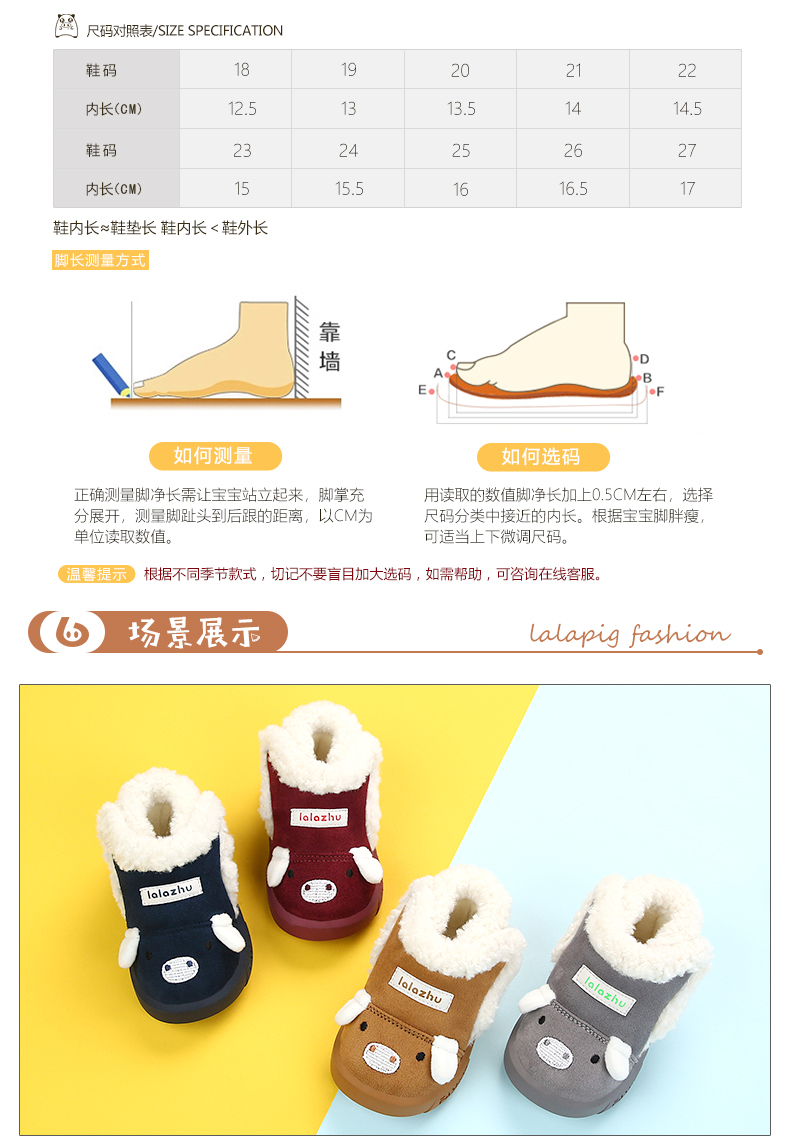 【拉拉猪旗舰店】加厚保暖,便捷套脚一脚蹬,TPR防滑橡胶大底,加厚防风,防滑保暖,从里到外的呵护宝宝双脚,学步更放心。